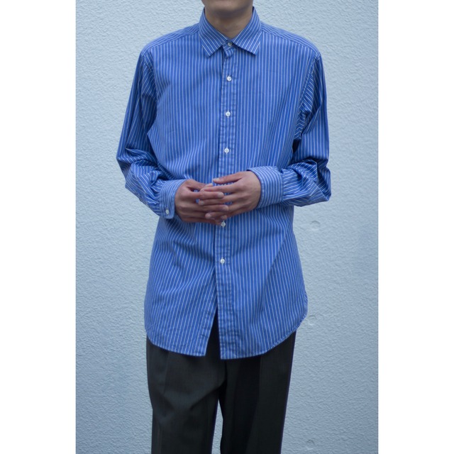 【商品説明】 Polo by Ralph Lauren pony logo less mulch stripe shirt Ralph Laurenのストライプシャツ。 ブルー×ホワイトにネイビーのマルチストライプデザイン。特筆すべきはポニーロゴがつかない大人なラルフシャツ。 ラルフローレンのシャツといえば,アメリカ古着大定番のアイテムですが,こういったちょっぴりヒネったものをチョイスするのも一興です。 上質なコットンでハリがあり,ファブリックの仕立ても素晴らしく,肌触りは滑らか。 シンプルになりがちなストライプシャツですがこれなら人とも被らず特別感が◎ お探しだった方は是非この機会に。 【ブランド】 Polo by Ralph Lauren 【カラー】 ブルー×ホワイト×ネイビー (※お使いのモニター環境により、画像の色味が実物と異なって見える場合がございます。) 【素材】 コットン 【サイズ】 表記サイズ : L 肩幅 48cm / 身幅 66cm / 袖丈 64cm / 着丈 83cm ※測定における若干の誤差はご了承下さいませ。 着用モデル : 178cm 56kg 【状態】 多少の使用感がございますが比較的綺麗な状態です。 ※尚、実店舗でも販売しております為、掲載されていても時間差で在庫切れになる場合がございます。予めご了承下さい。 (取扱店 : FIFTY-FIFTY 高円寺) Instagram : fifty_fifty_works