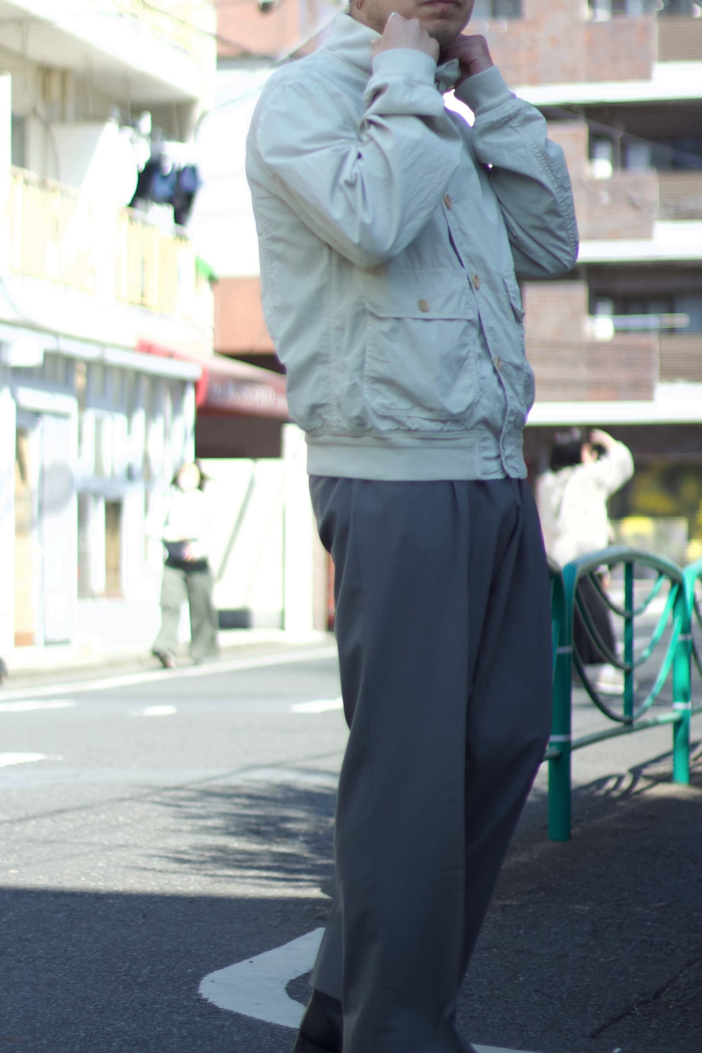 近い形でバルスタージャケットが定番アイテムとして存在するのですが、こちらはドッグイヤーにチンストラップが付くデザインですので、恐らくA-1フライトジャケットのサンプリングかと。