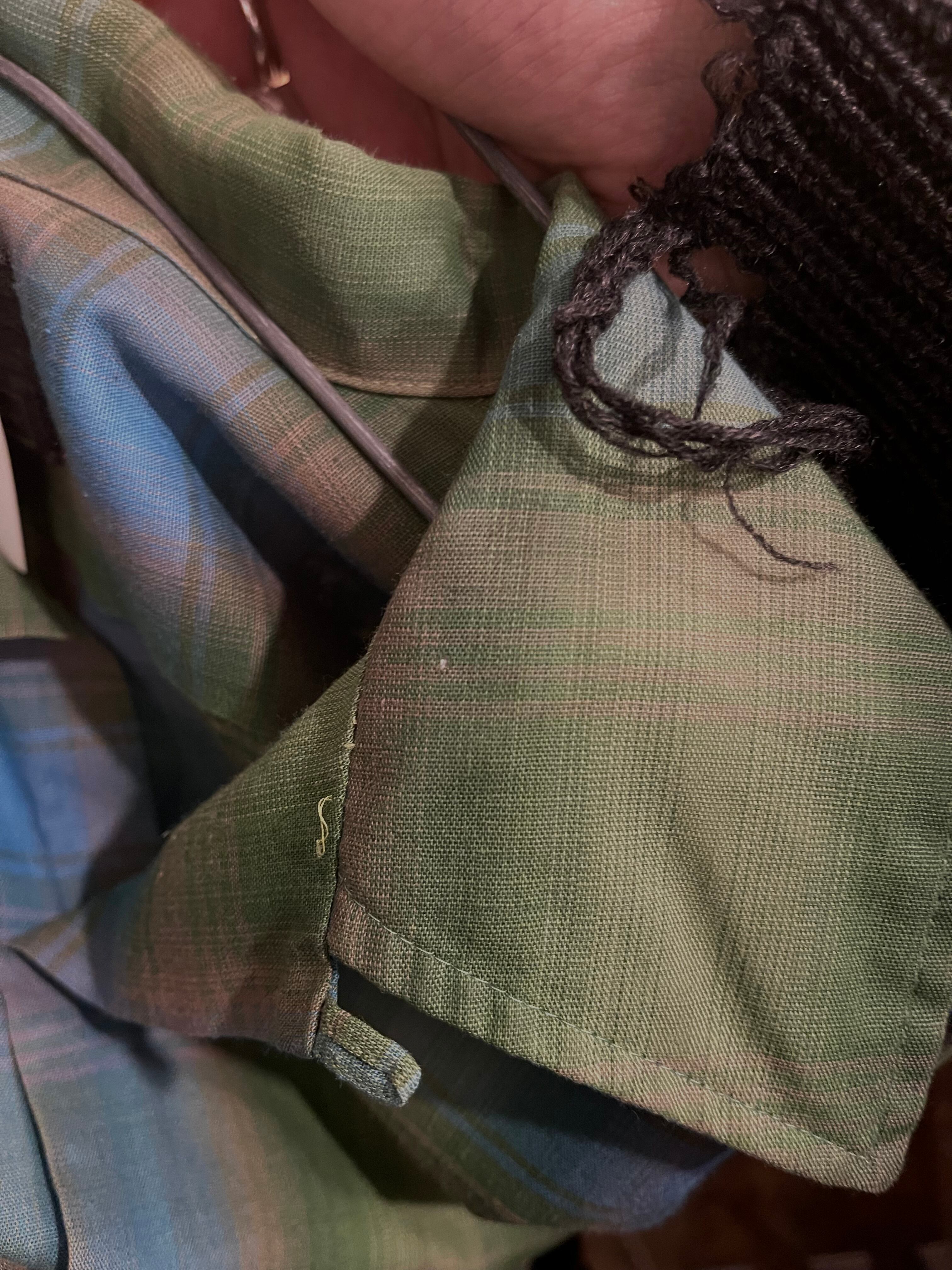 B(襟元の左上に僅かな破れありますが、ヴィンテージシャツ製品特有の色落ち、全体的な使用感などございます。どれもヴィンテージ 特有の風合いとしてご理解ある方のみご注文お願い致します。)