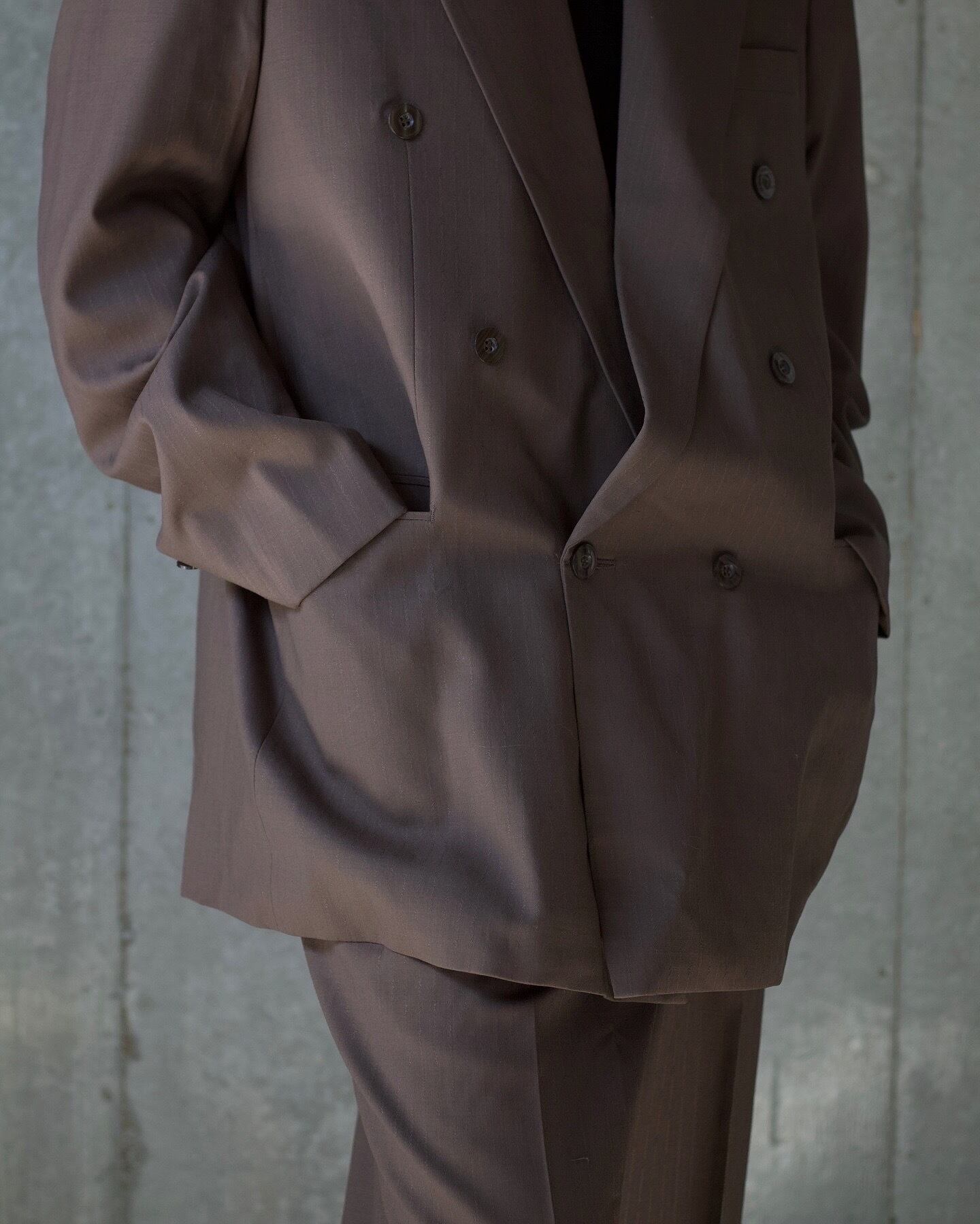 ジャケットはフォーマルになり過ぎないゆとりのあるサイズ感に、ピークドラペルのダブルブレスト仕様。