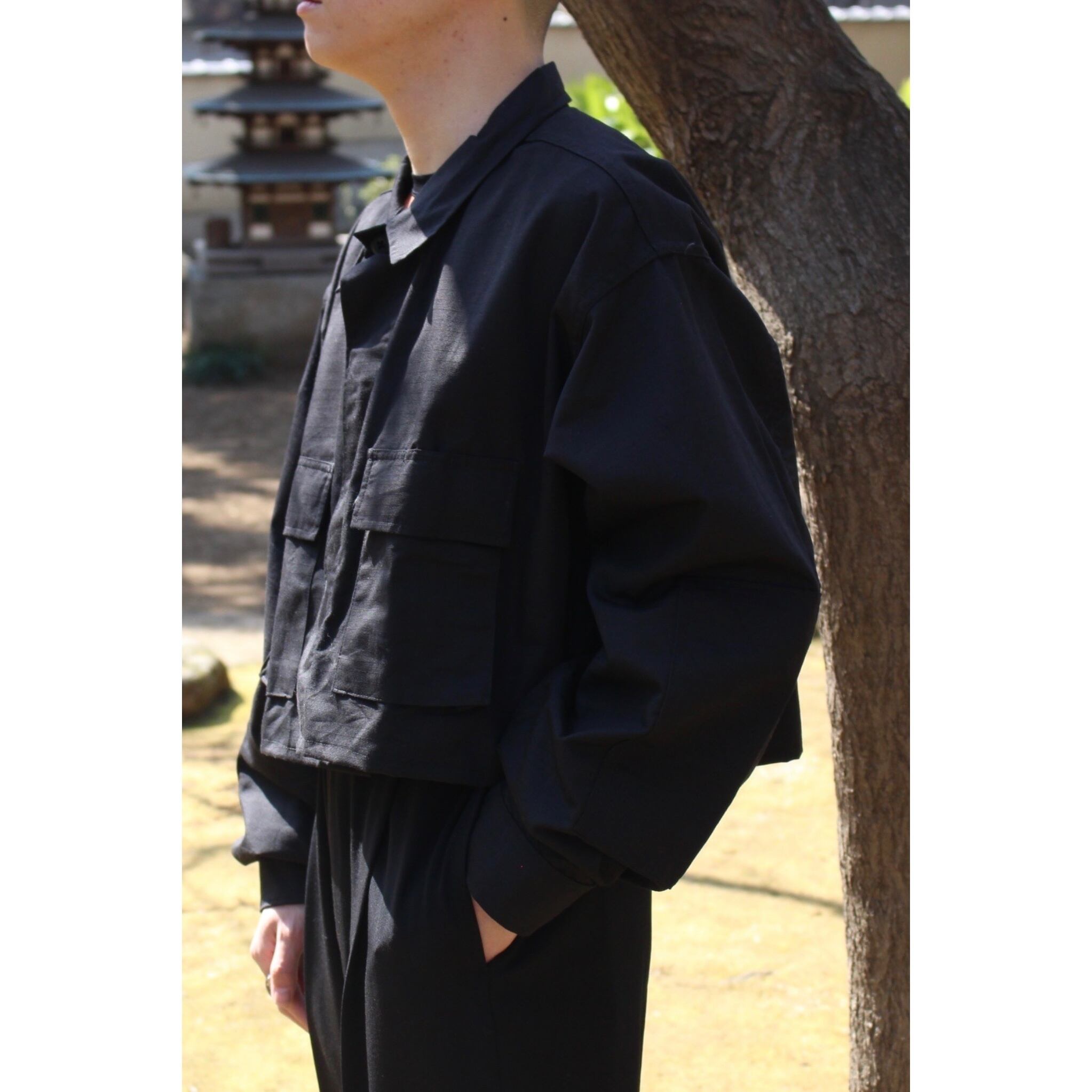 BDU ジャケットを短丈に裾をカットして、今っぽい仕上がりな一着。