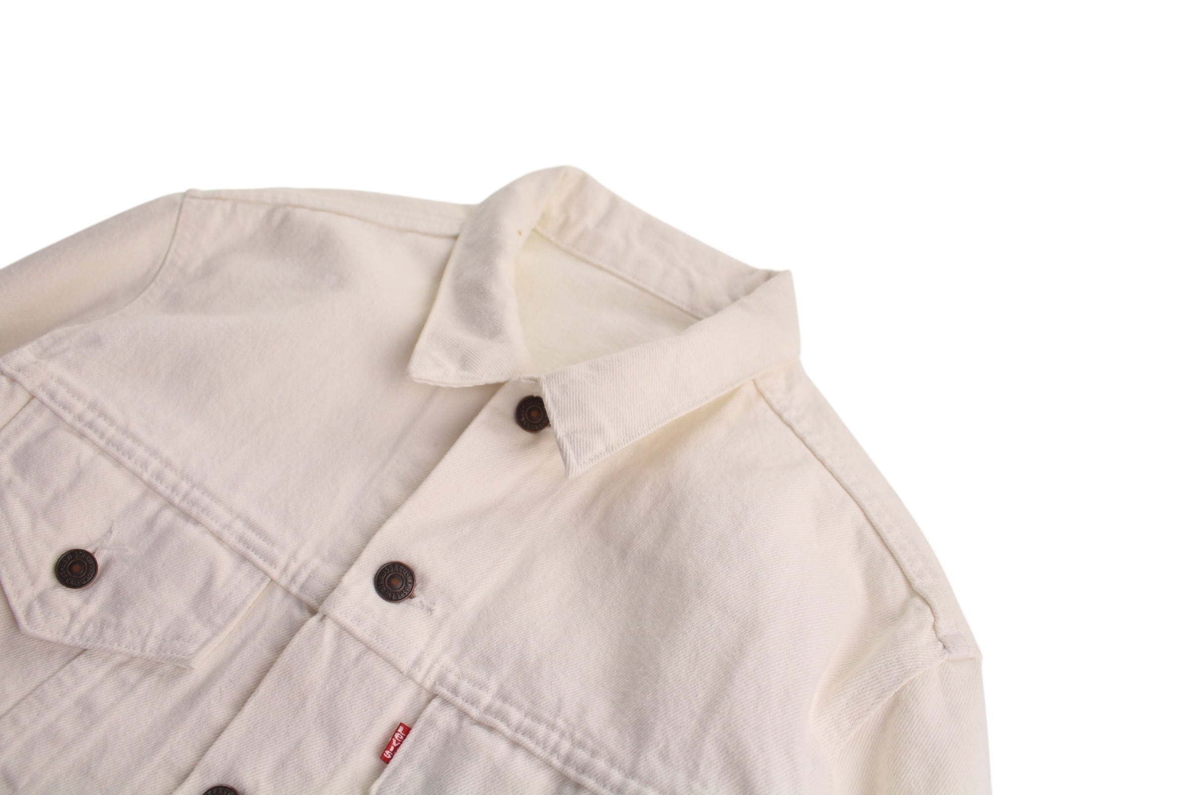 後染めやブリーチ染のデニムジャケットは見ますがこの先染めの白はとても希少だと思います。近年、黒の先染めよりも一層、値段が高騰しております。