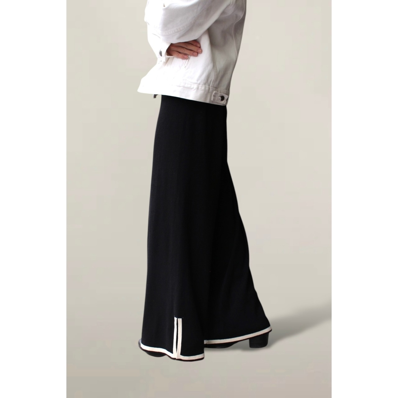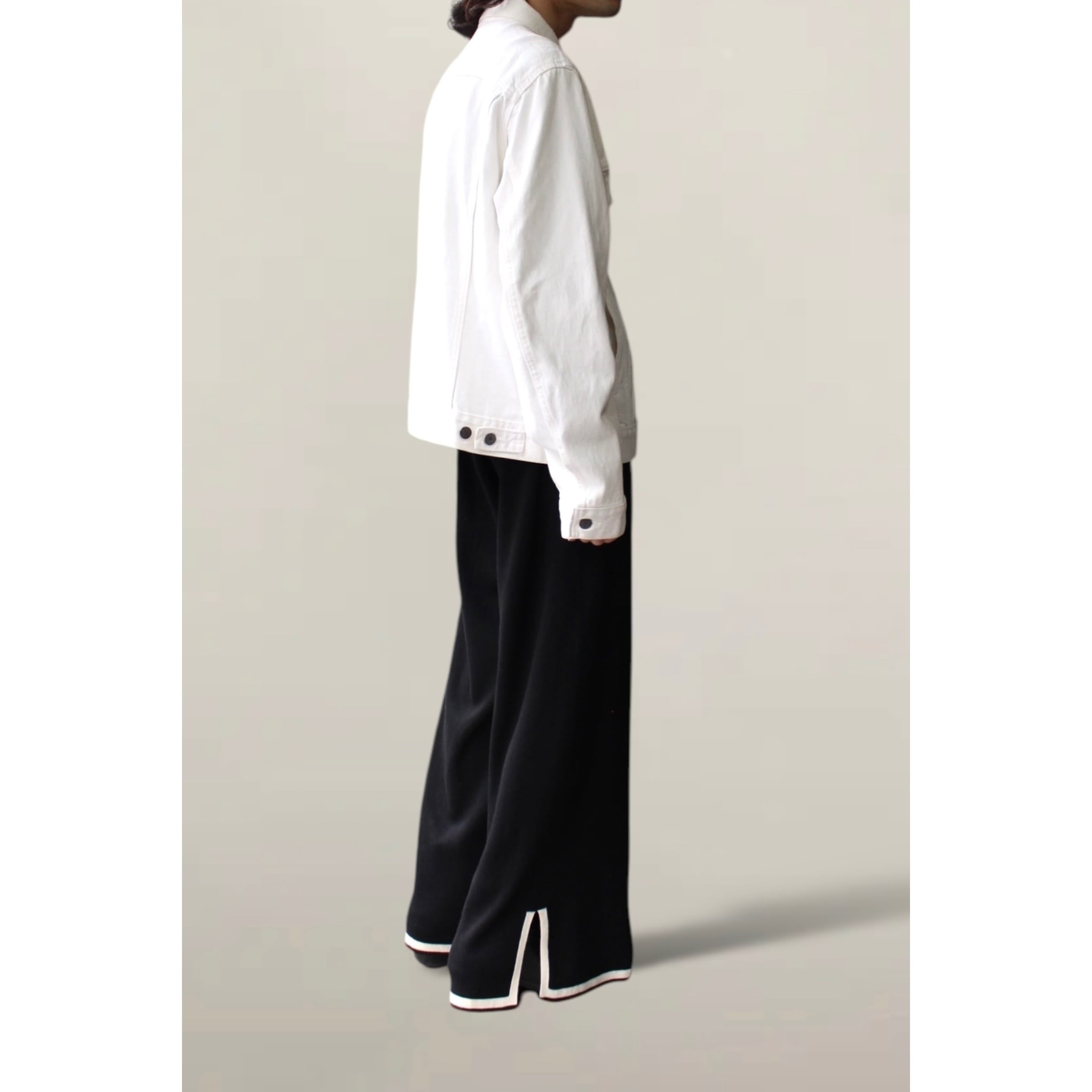 ハイゲージな上品なブラックにオフホワイトのラインデザイン。裾はサイドスリットで履くとややフレアっぽい印象にもなるパンツ。