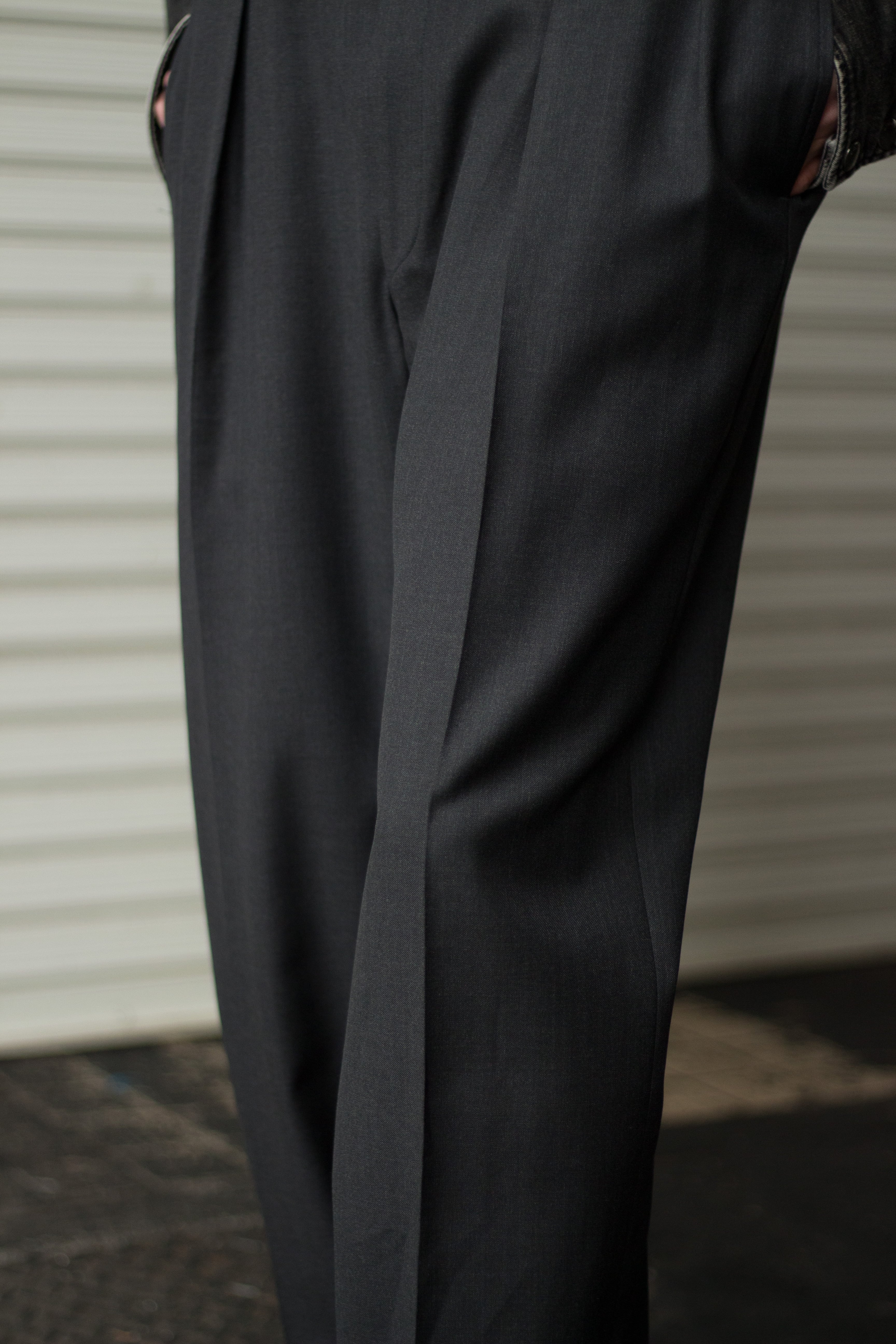 一見普通のスラックスですが細部までの作り込みが圧倒的に良い。ヴァージンウール100%のウールとは思えない滑らかでとろみのある生地。織柄によりほんのり霜降りのようなデザインも◎