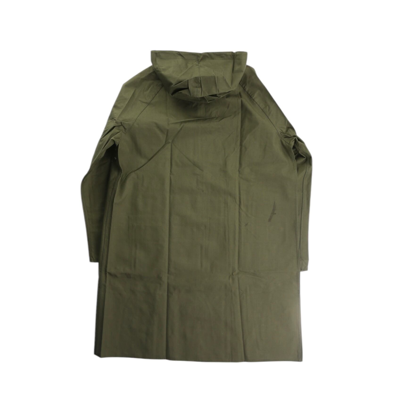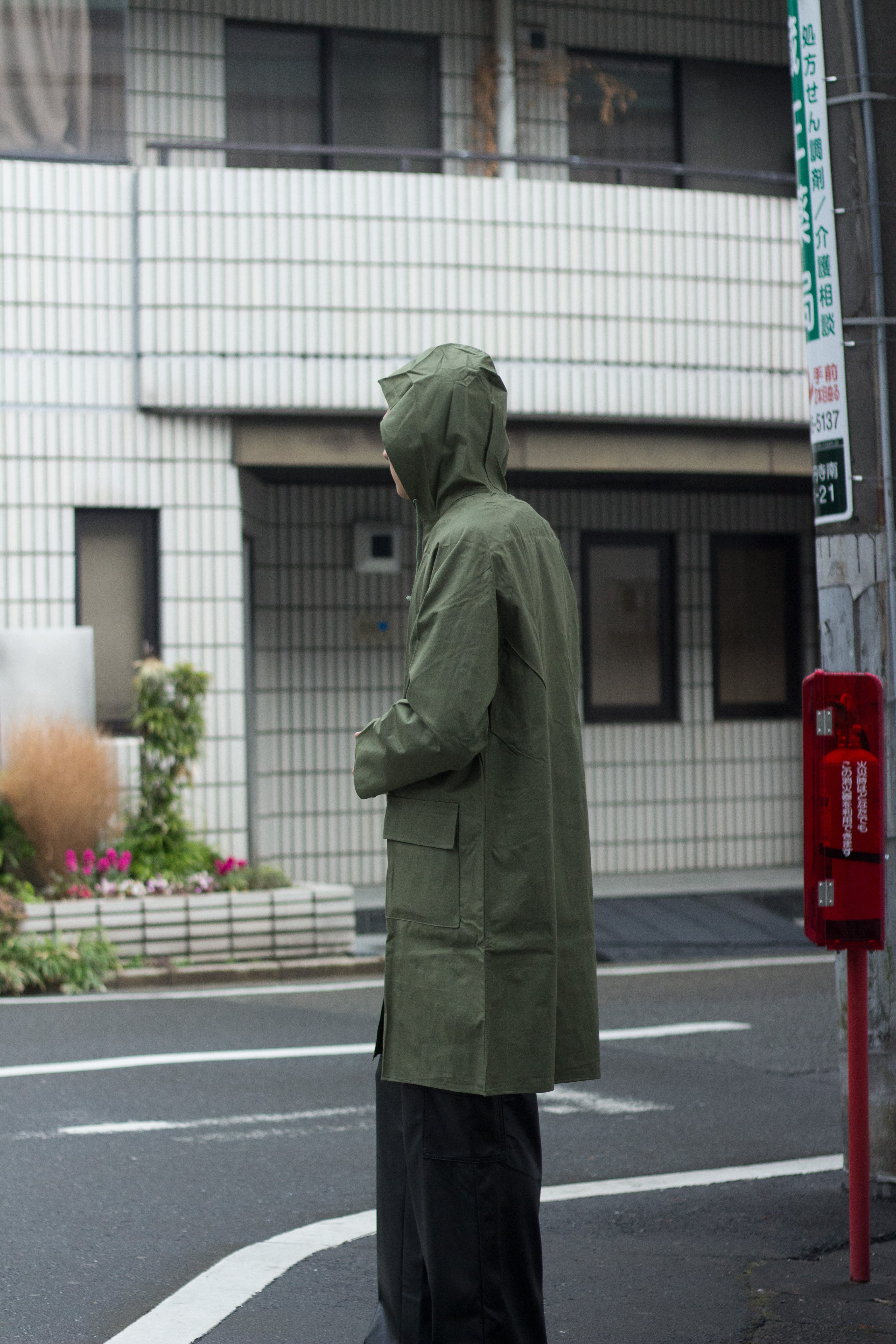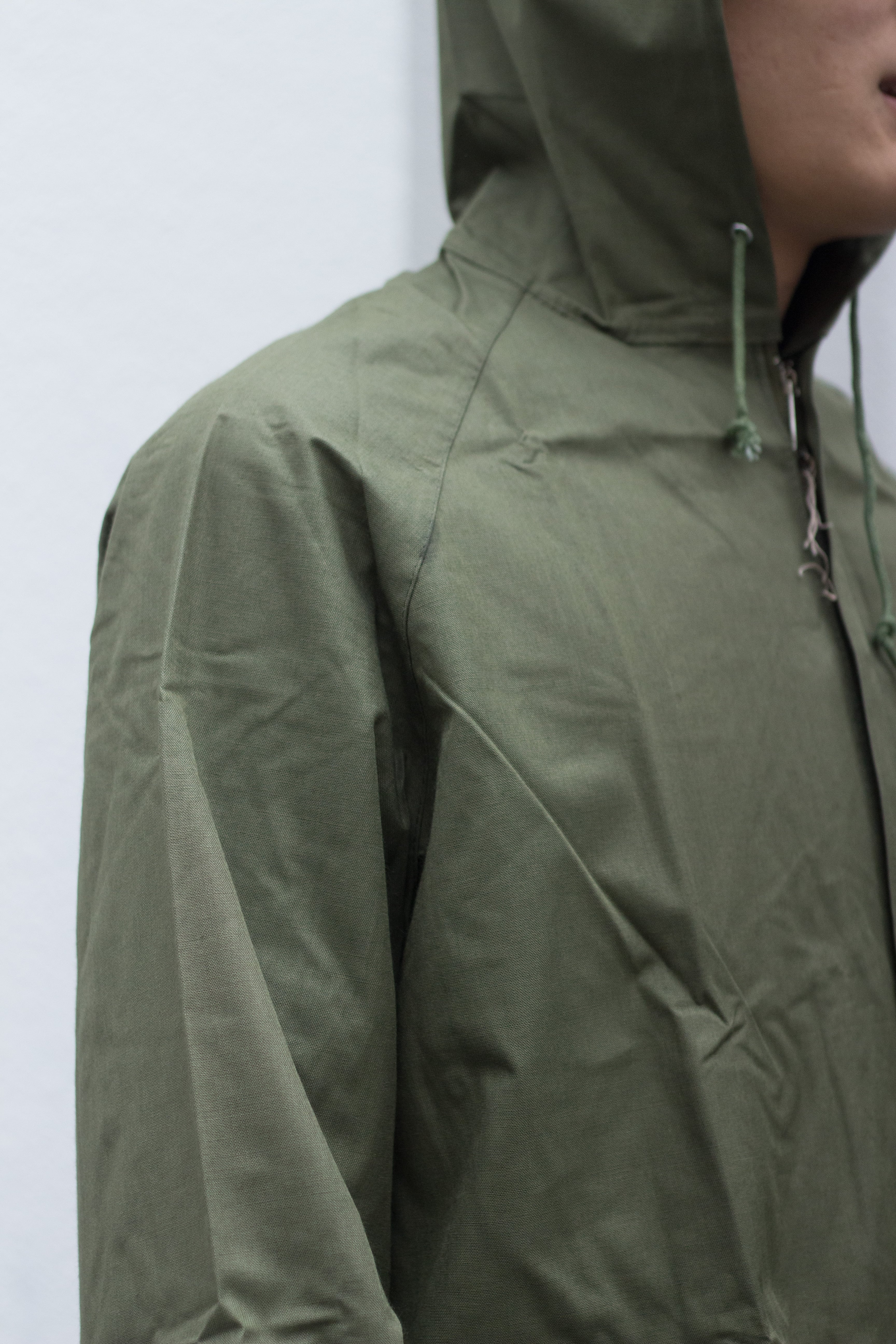 ハーフ丈ほどのコートの形にフード付き。大きめなフラップポケットに比翼デザイン。脇の下にはハトメが付き蒸れを軽減してくれる機能性の良さ。ミリタリーさながらのオリーブカラーも◎