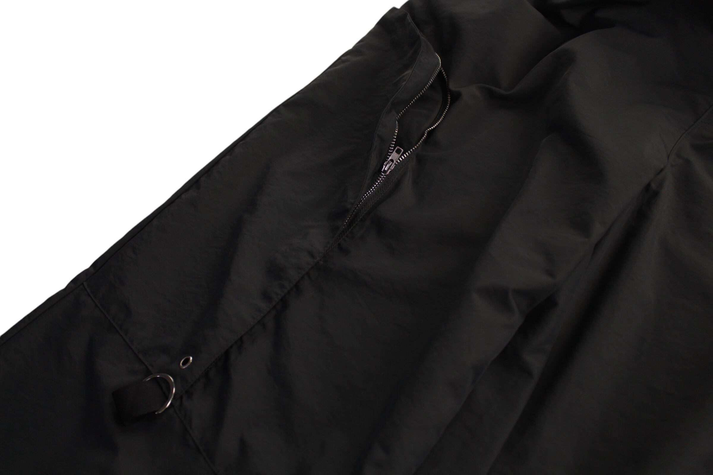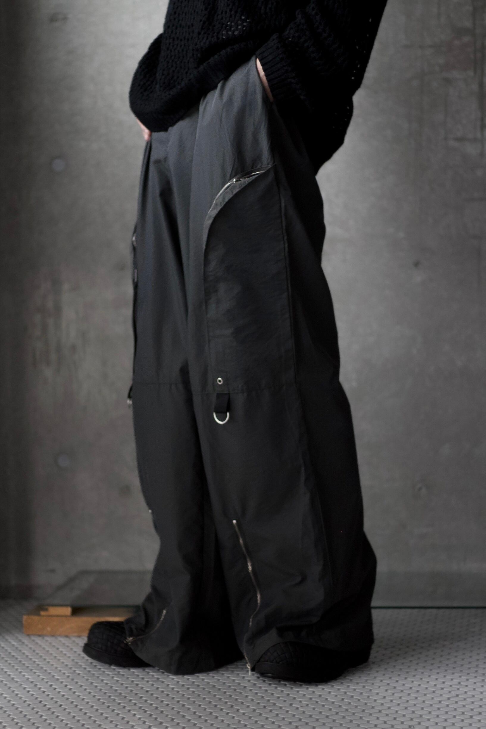 ズドンと落ちる様なワイドシルエットに、マットな質感のポリナイロンファブリック。