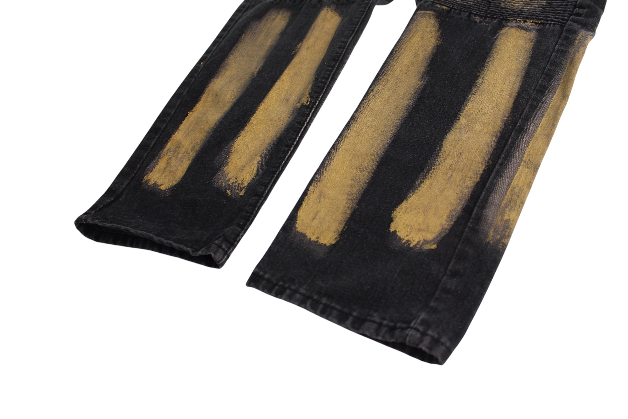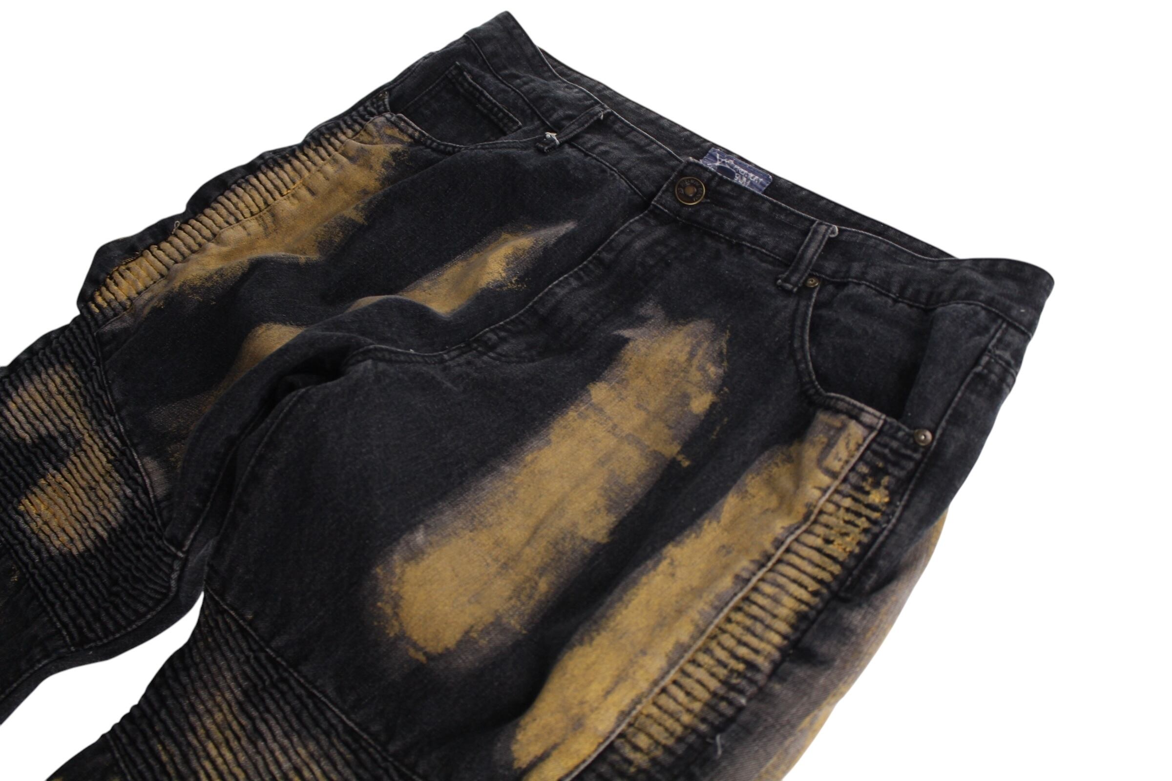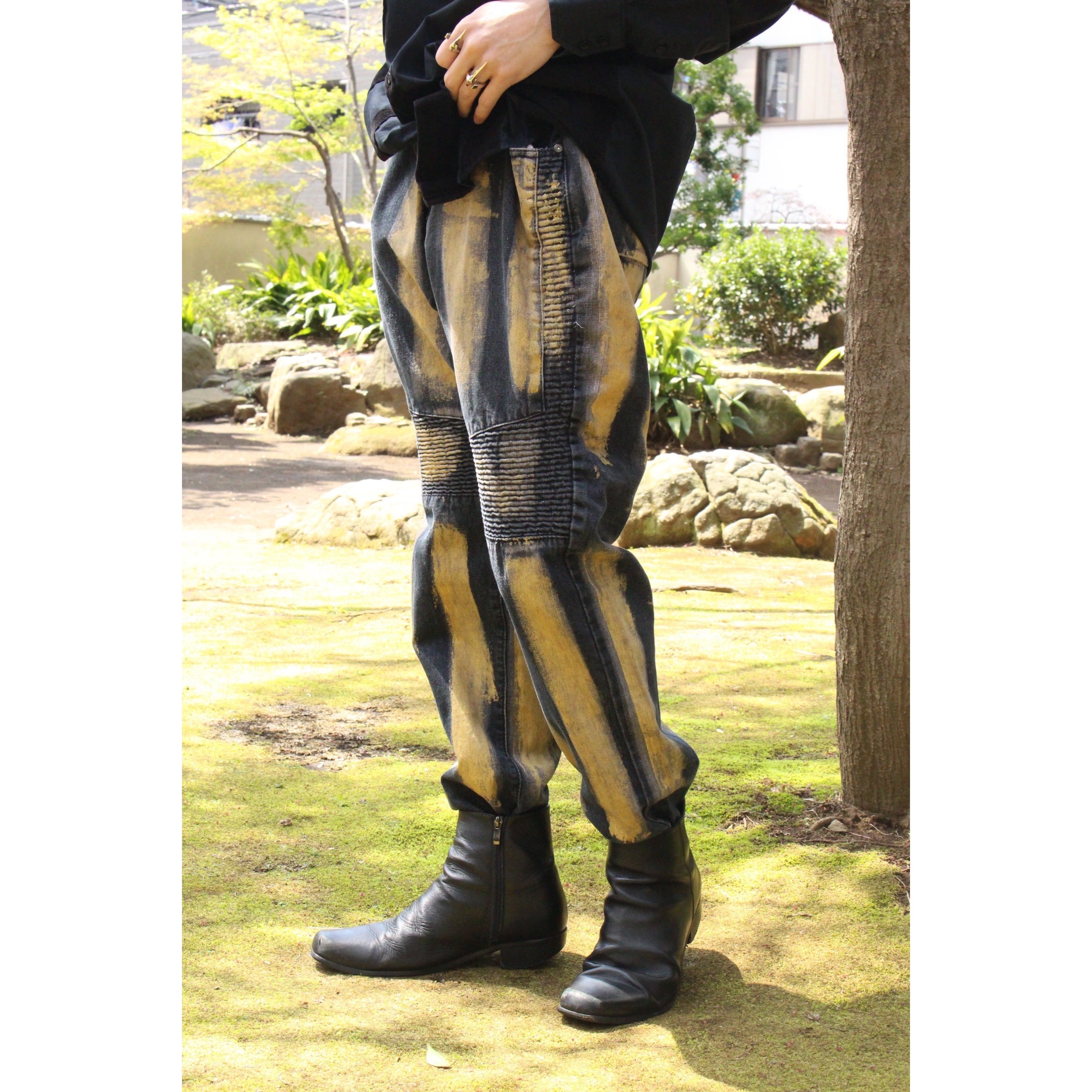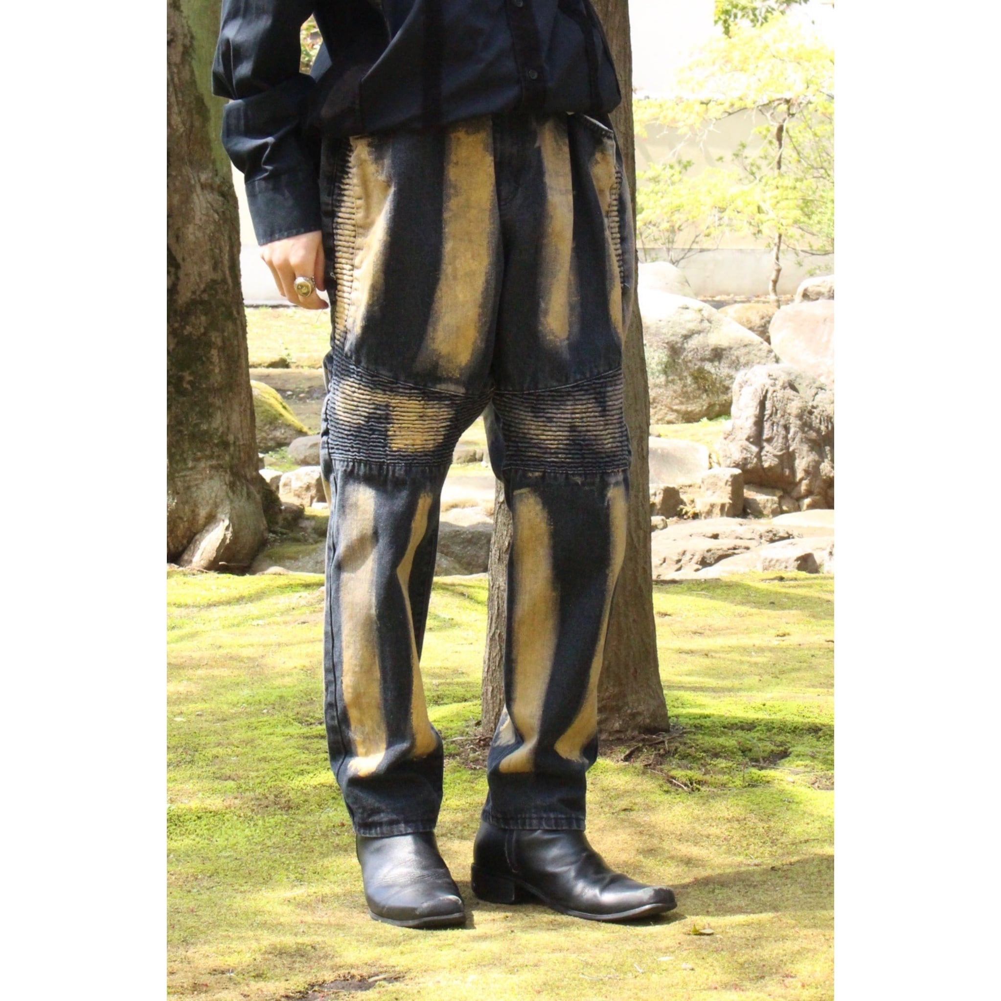 墨黒デニム地にイエローカーキ色のダメージを加えたグランジな雰囲気。
