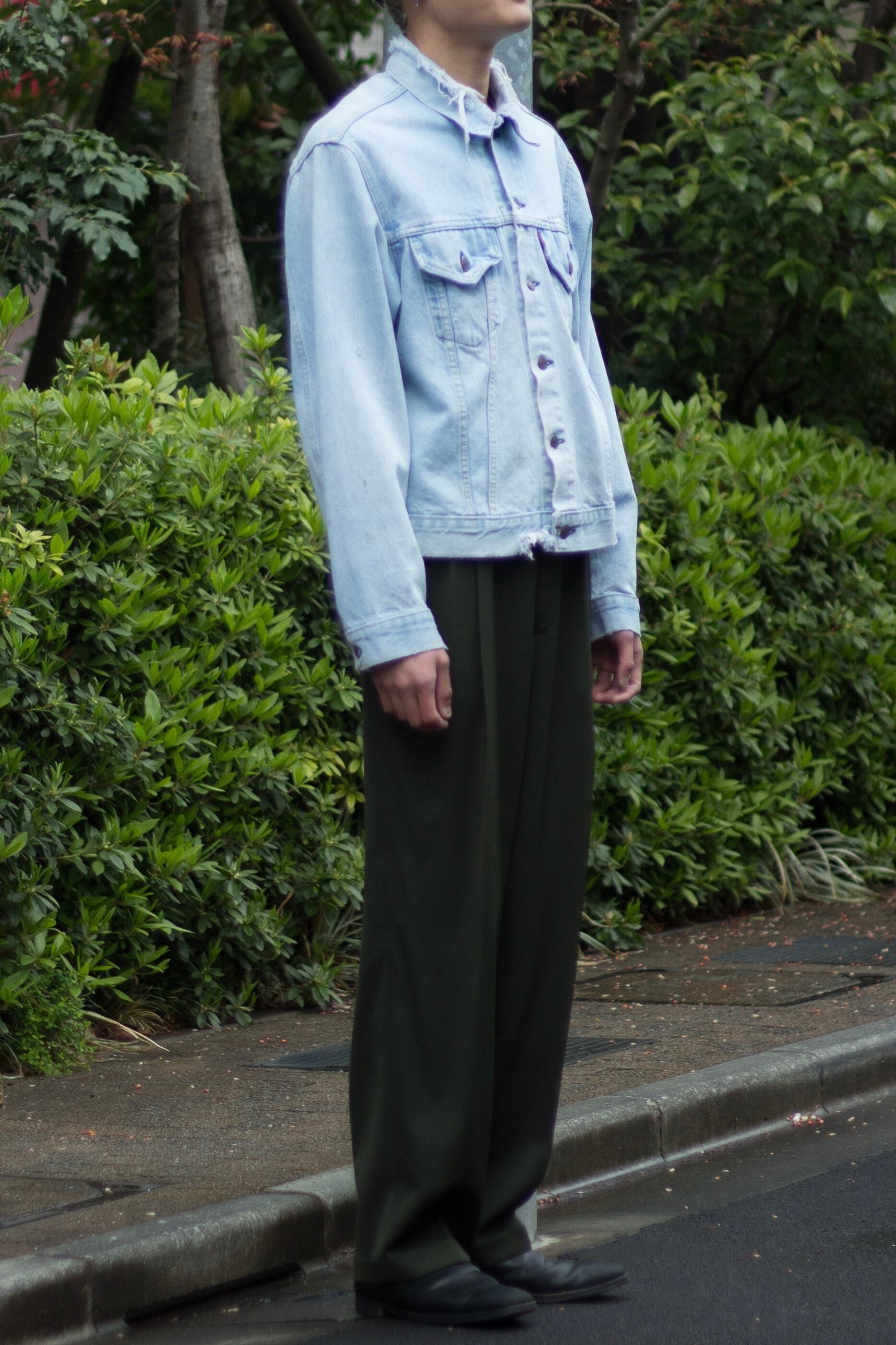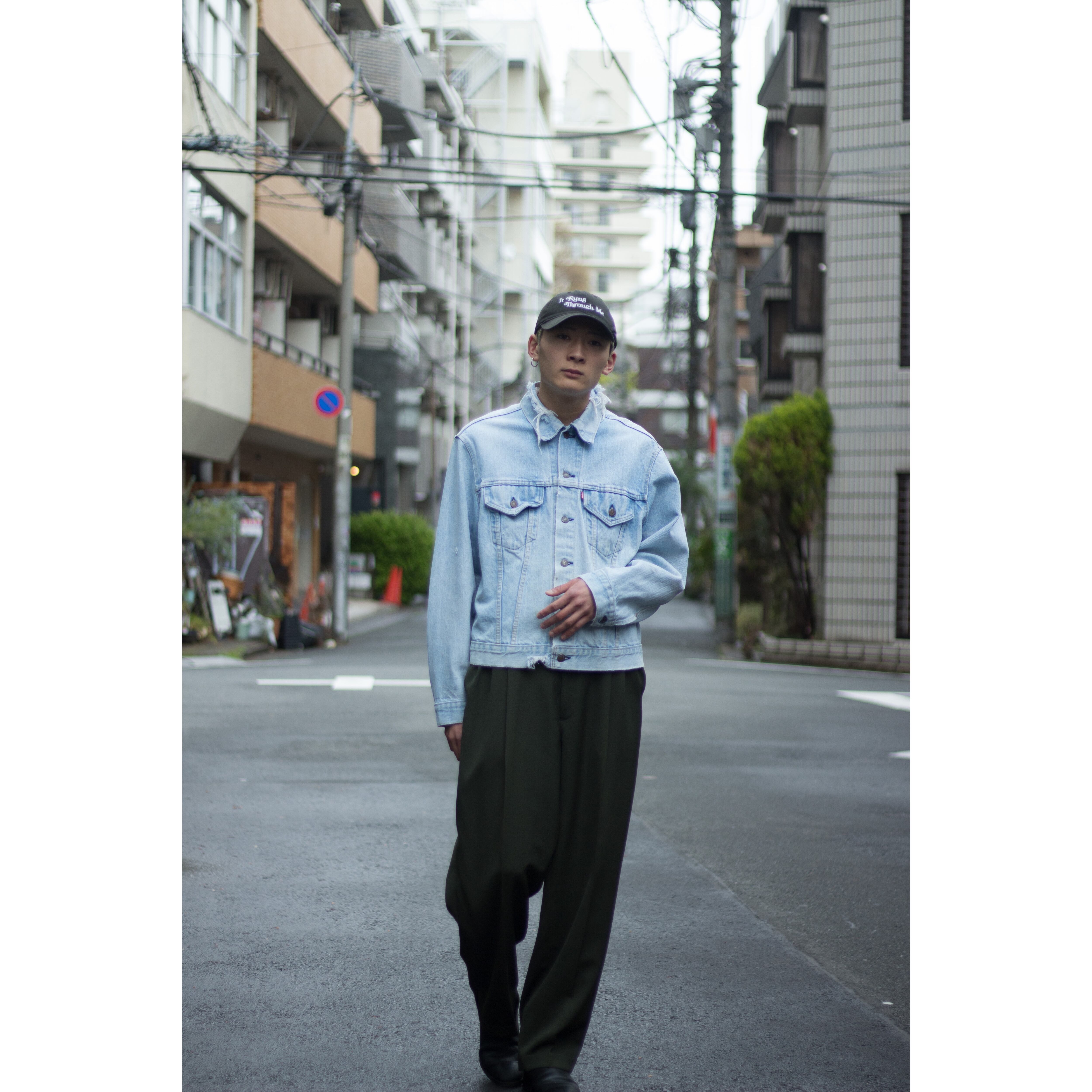 デニムonデニムのスタイリングでも、今っぽいワイドなタックスラックスなんか合わせるのも◎