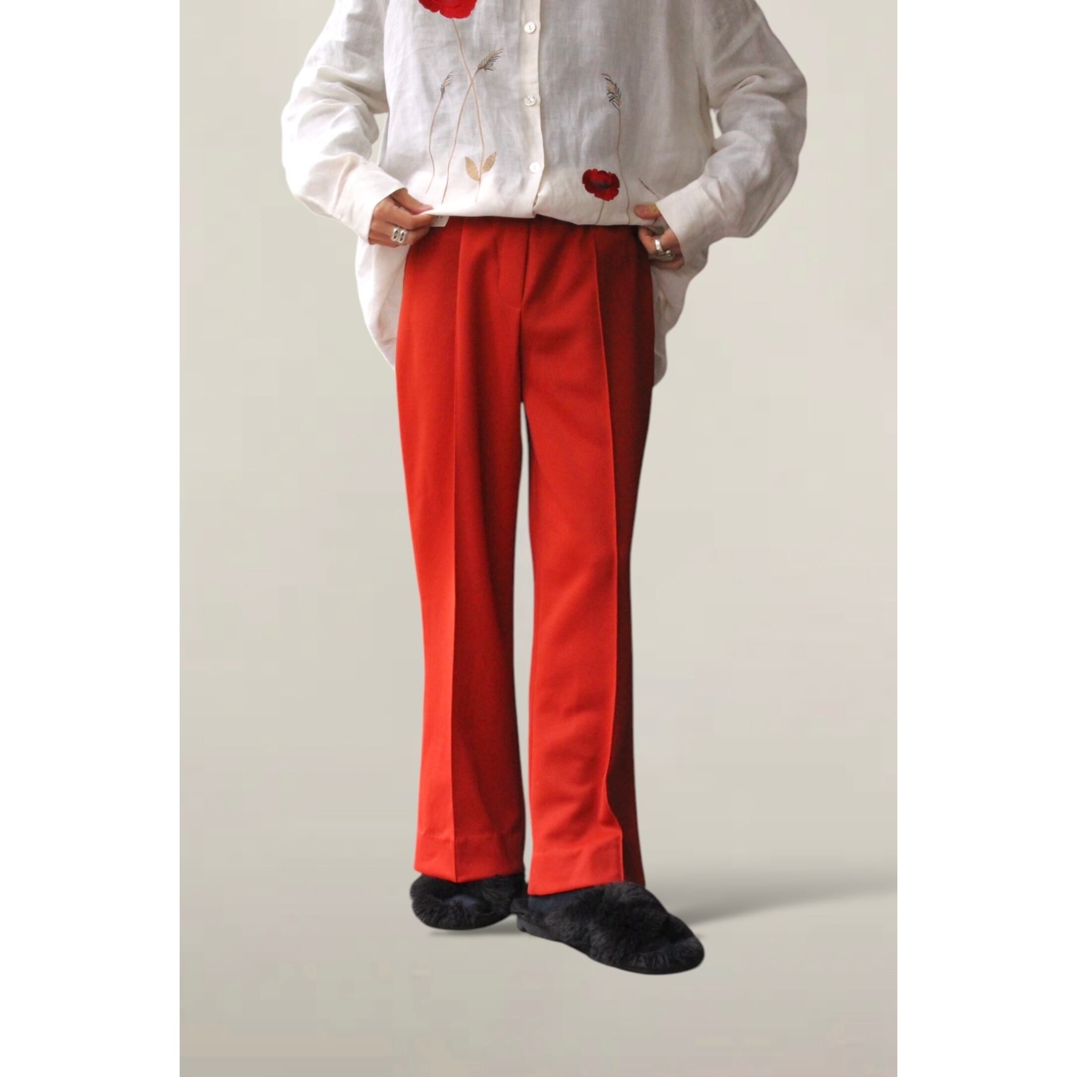 ストレスなく履けるイージー仕様。ウエスト部分には飾りのボタンも付いていて細かいところまで気が利いております☺︎