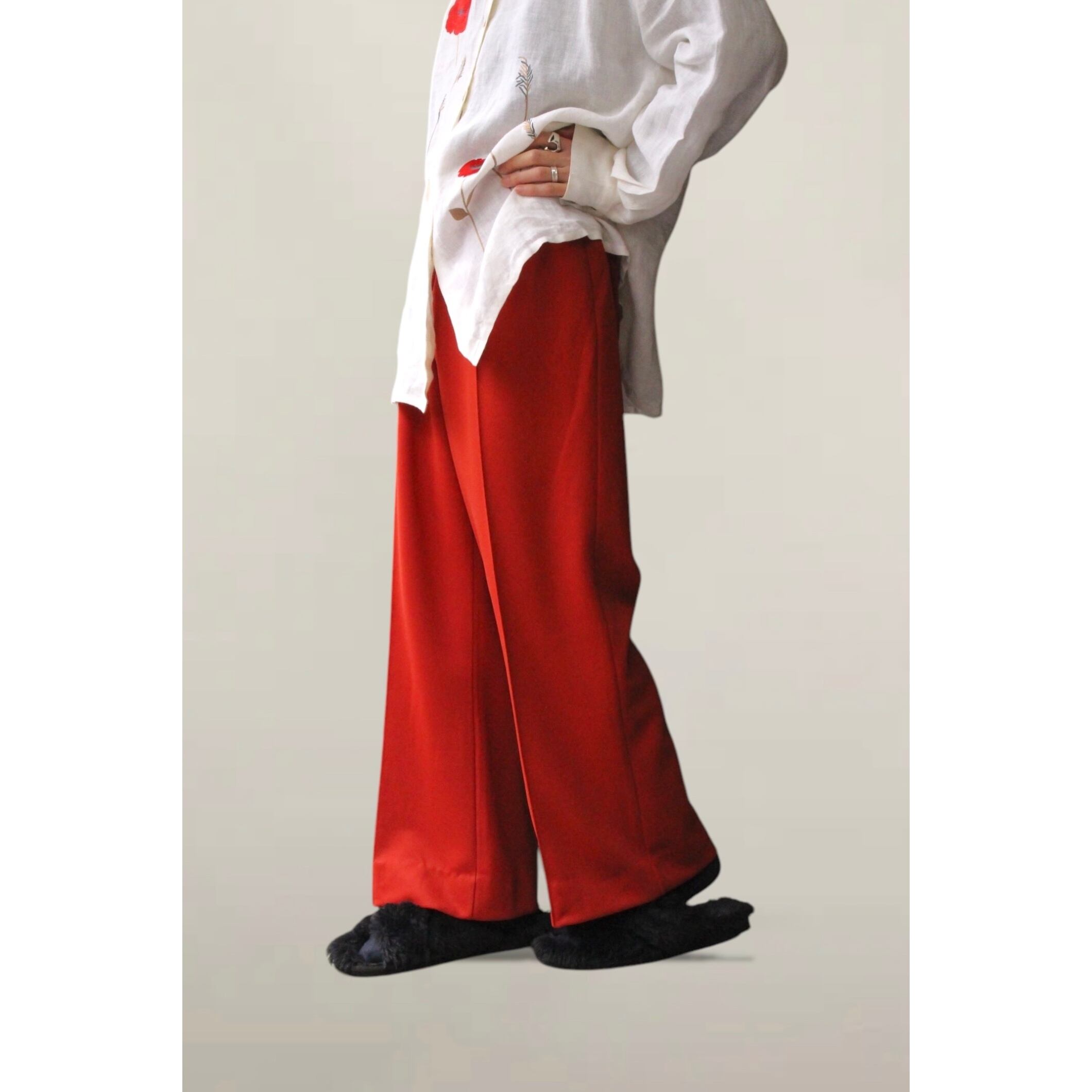 イージーパンツはパジャマっぽくなりがちですがワイドストレートでそんな雰囲気は一切感じません。