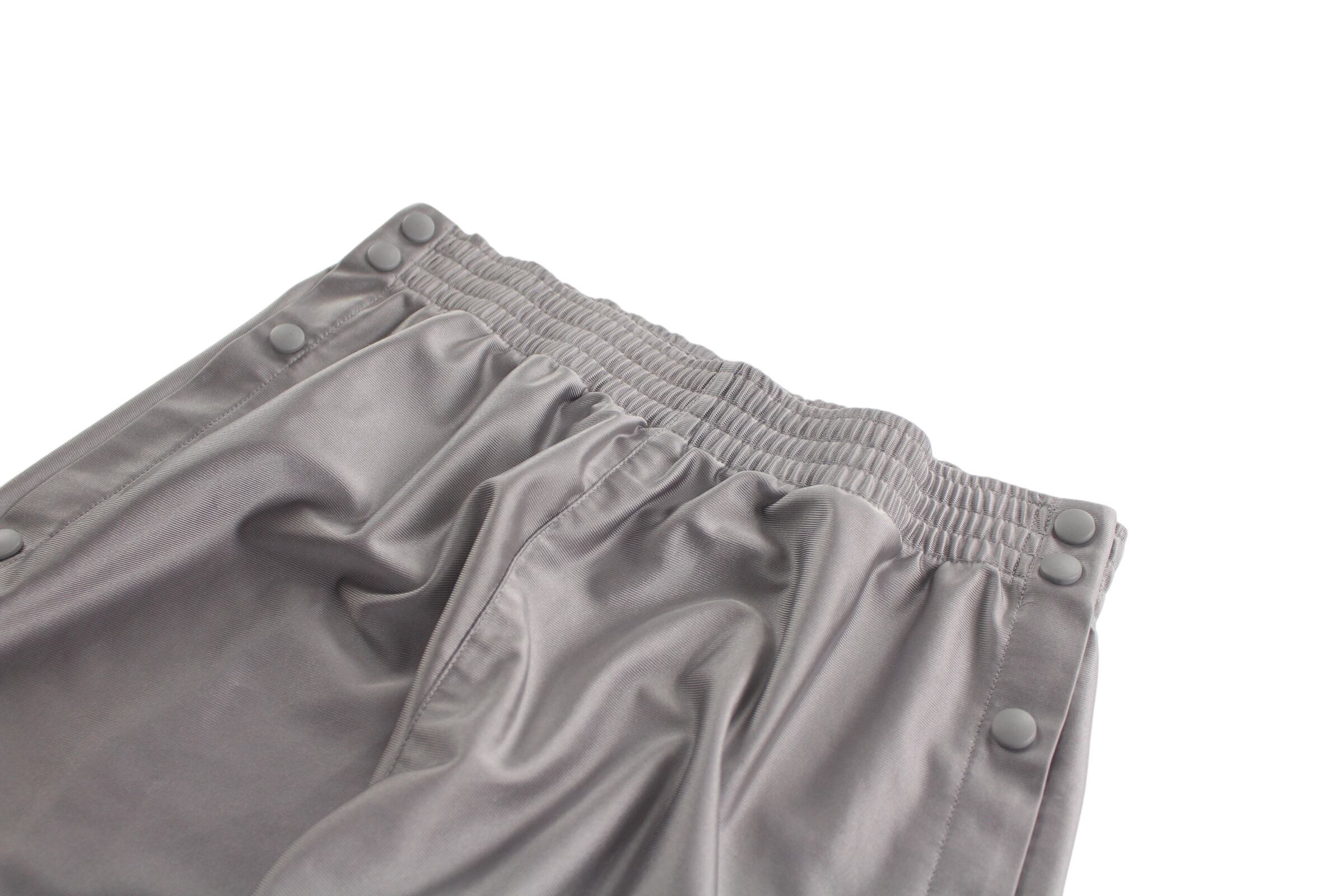 着心地の良い光沢感のある滑らかなジャージー生地に両サイドはサイドスナップボタンのデザイン。お探しの方も多いメタリックなシルバーカラーに裾付近にブランドロゴ刺繍も◎