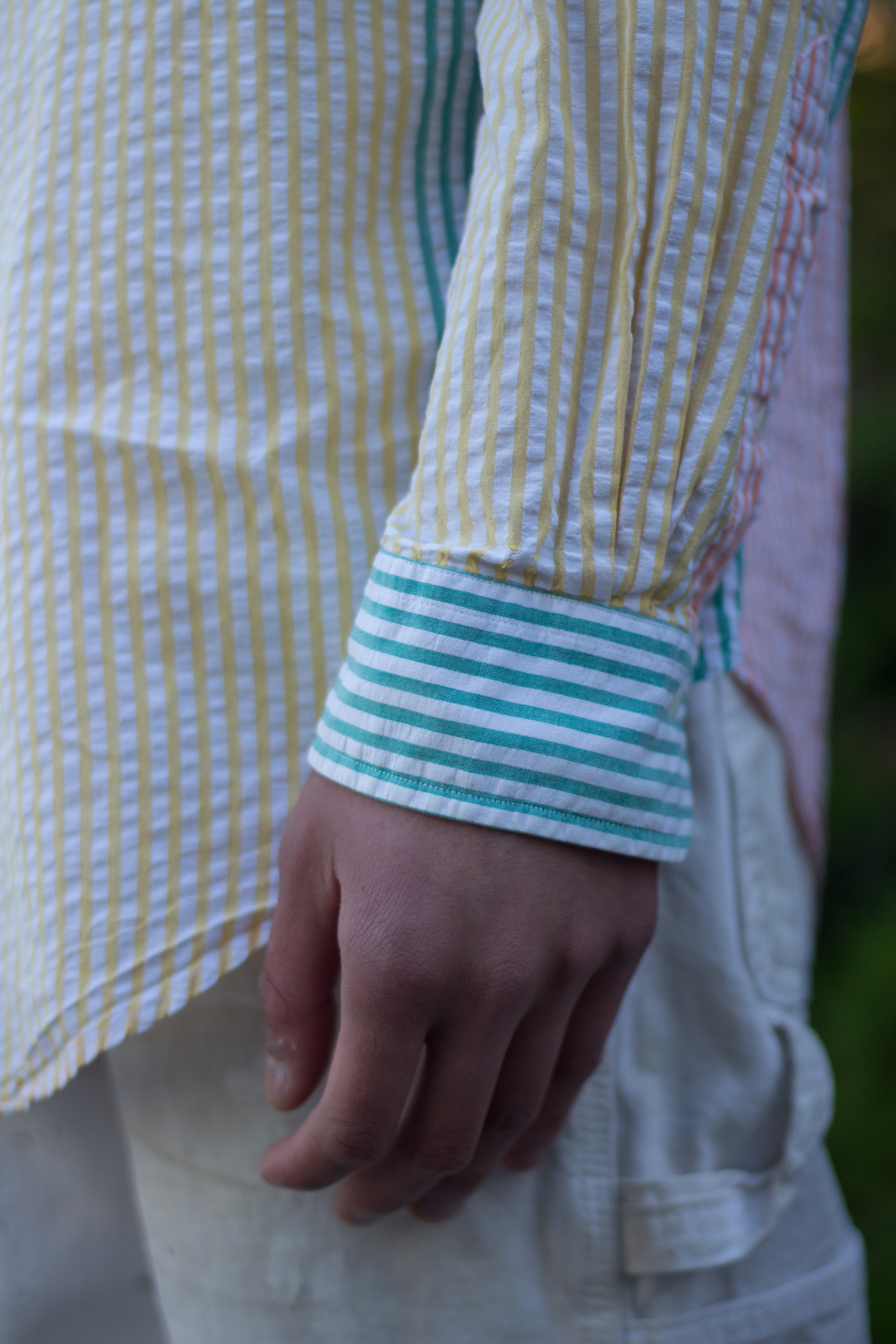 こちらは珍しいシアサッカー素材。立体感のある加工でシワ等ついても気にせず着用できるシャツ。