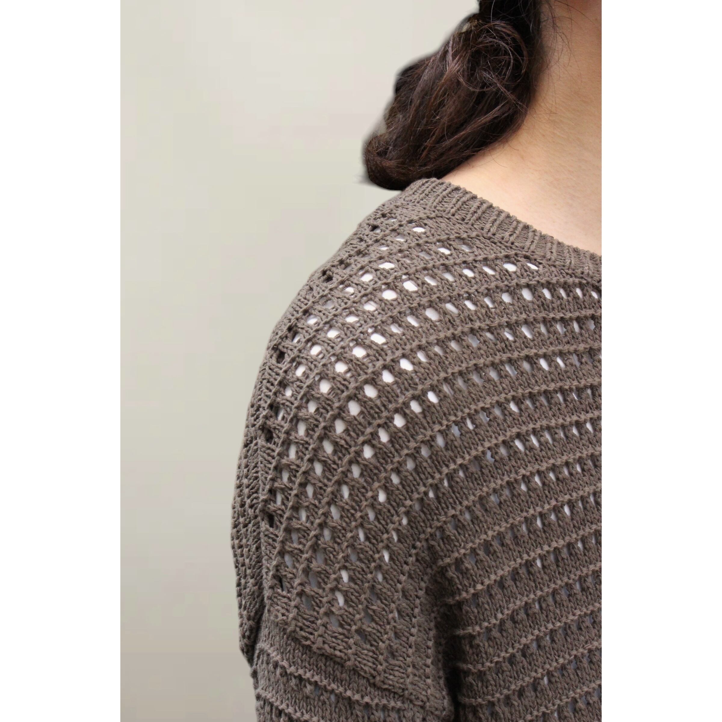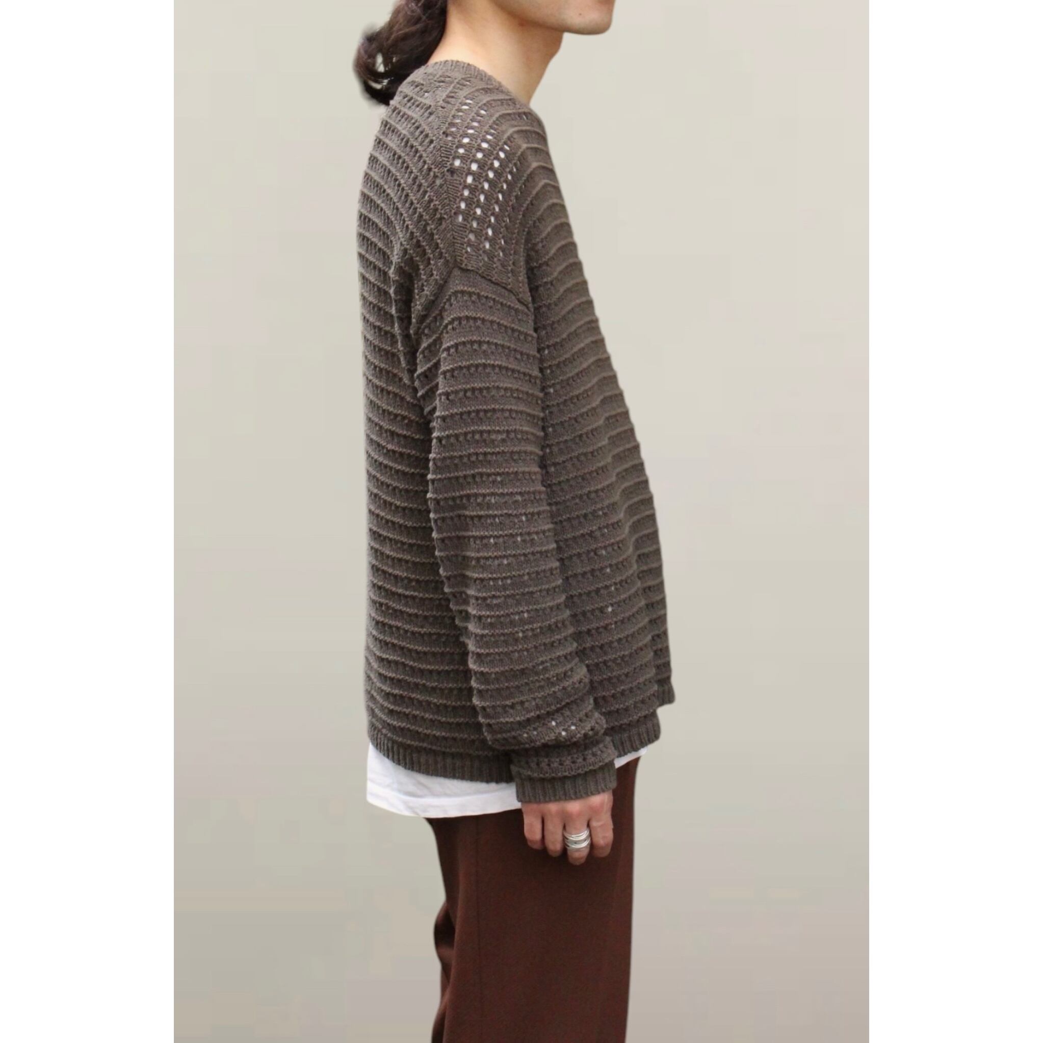 コットンメインの肌馴染みが良いファブリックに加え透け感充分なメッシュデザイン。着画のようにロンTやタンクトップの上から着ることができ春夏用に使えるニットです☺︎
