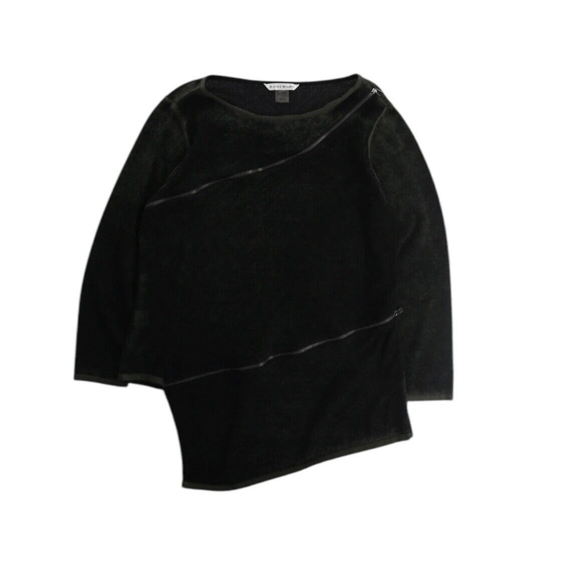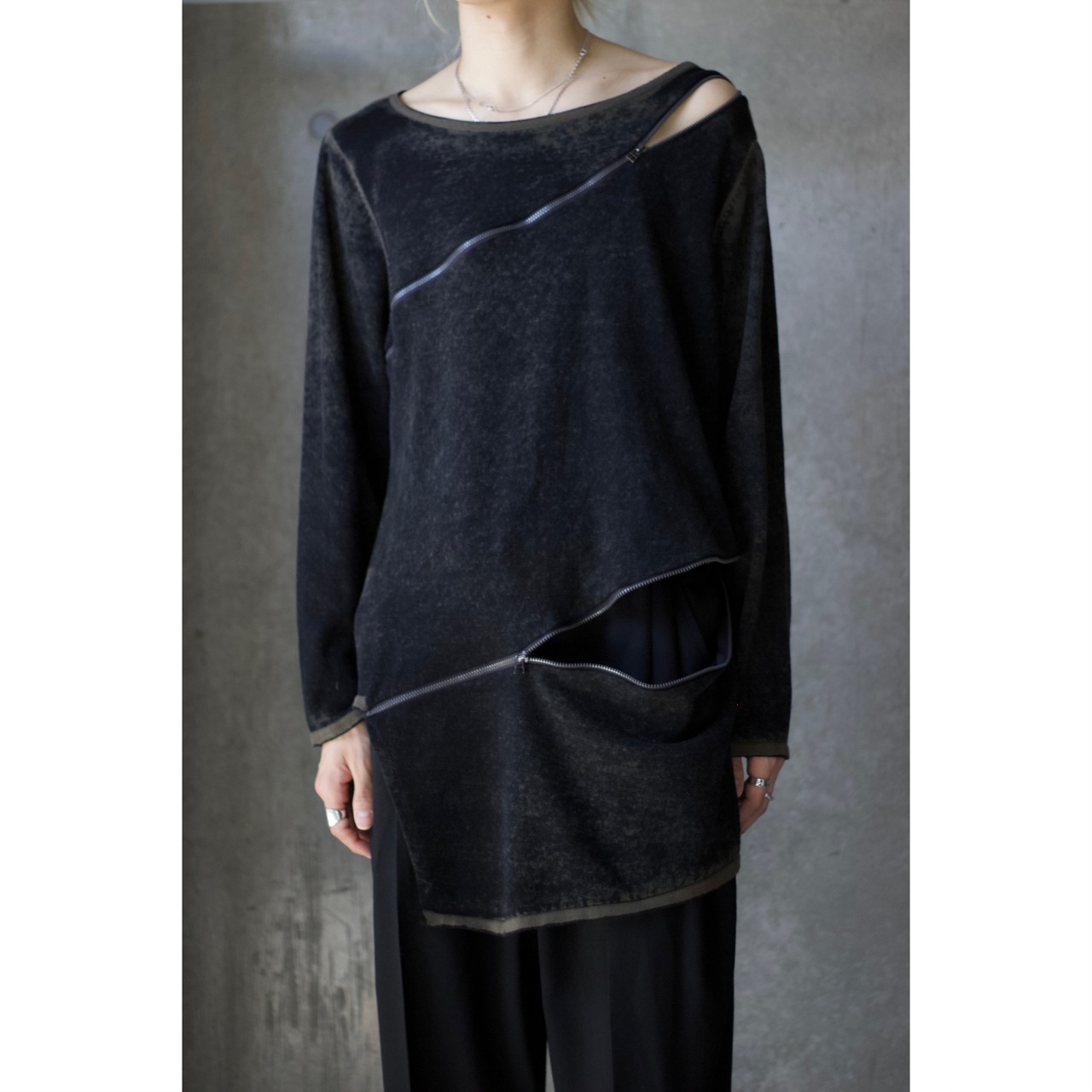 斜めに走るジップとアシンメトリーなカットが特徴の、存在感抜群のロングスリーブカットソー。