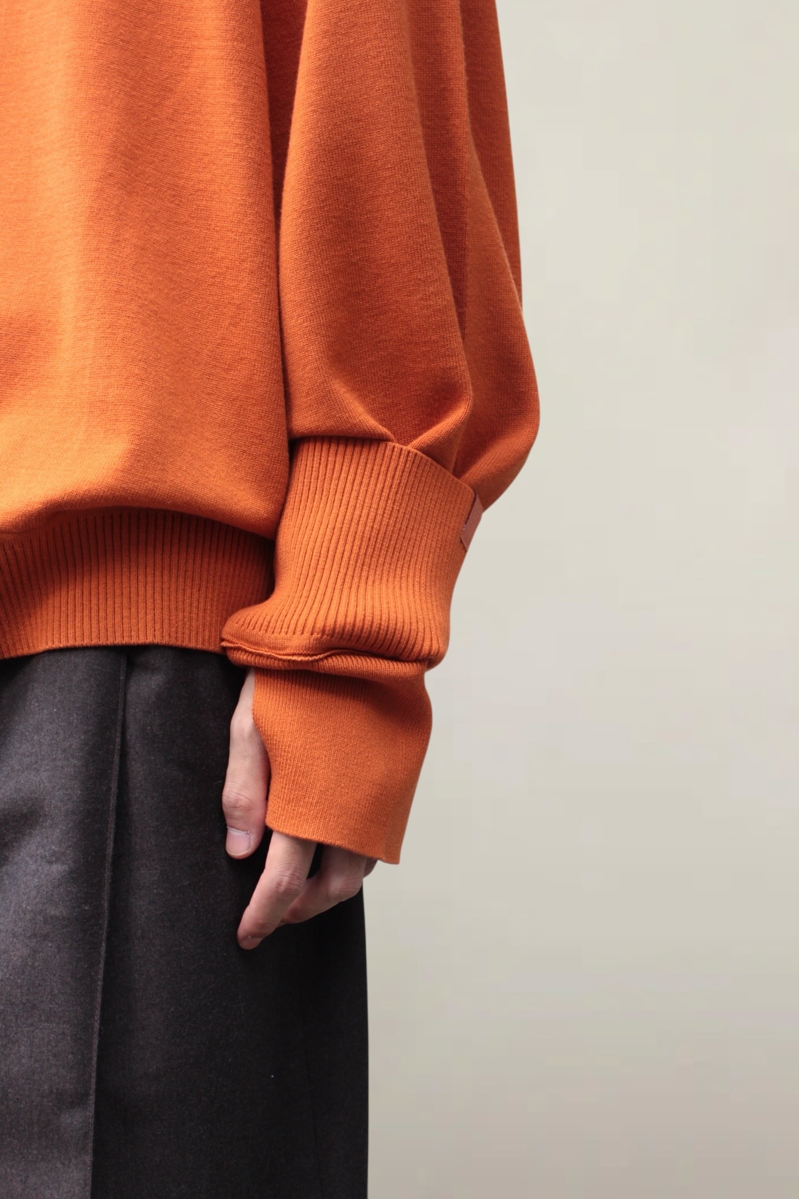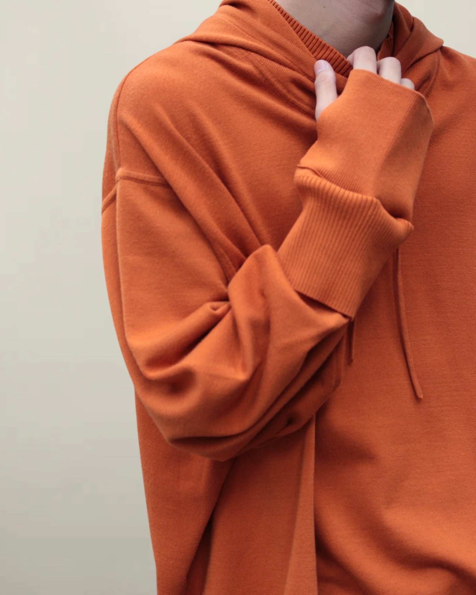 暖色系のパキッとしたオレンジカラーのニットパーカー。モックネックのニットにフードを後付けしたような可愛らしいデザイン。
