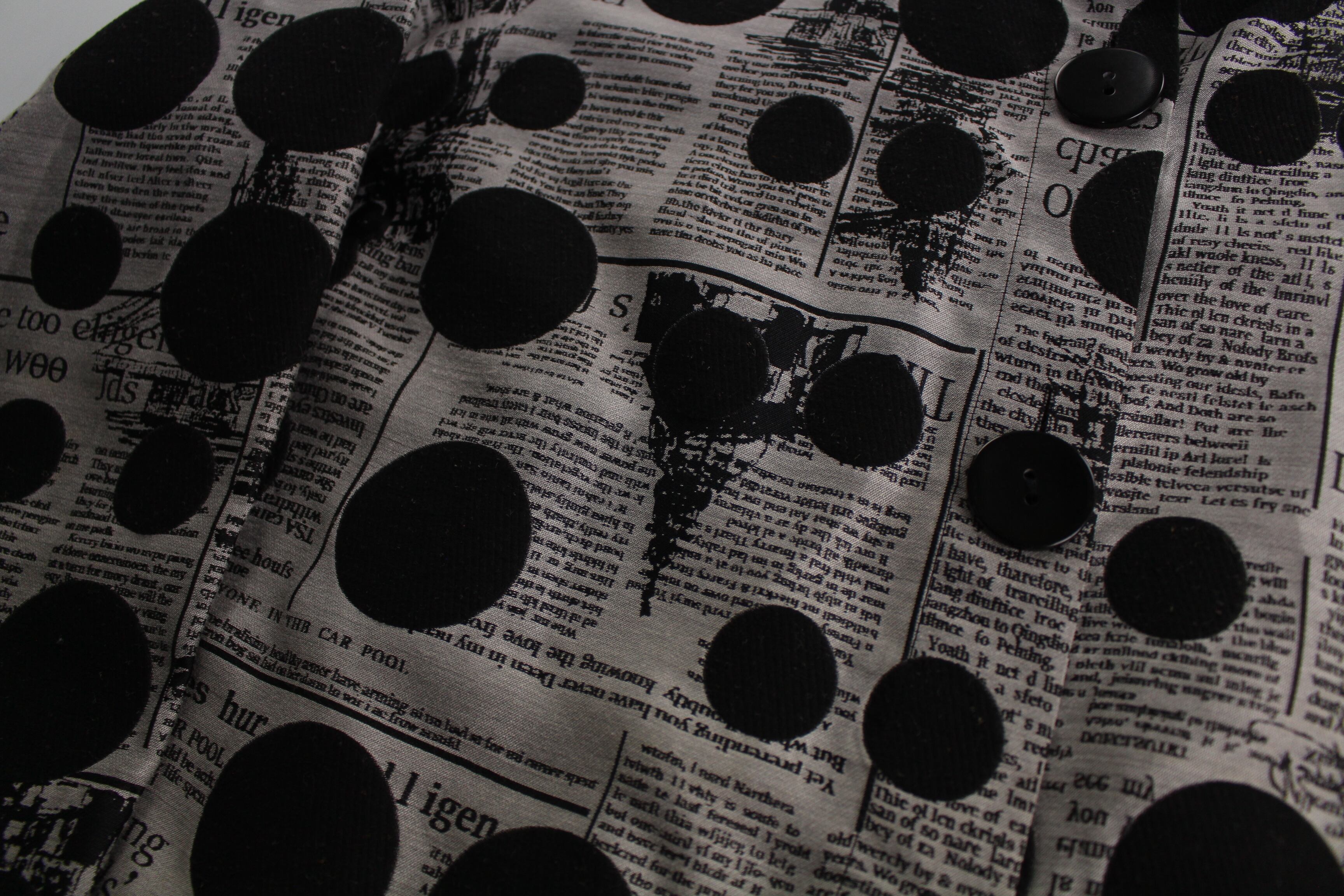 英字新聞が描かれた一着で、体のラインをボヤけさせるような高いシルエット性も◎