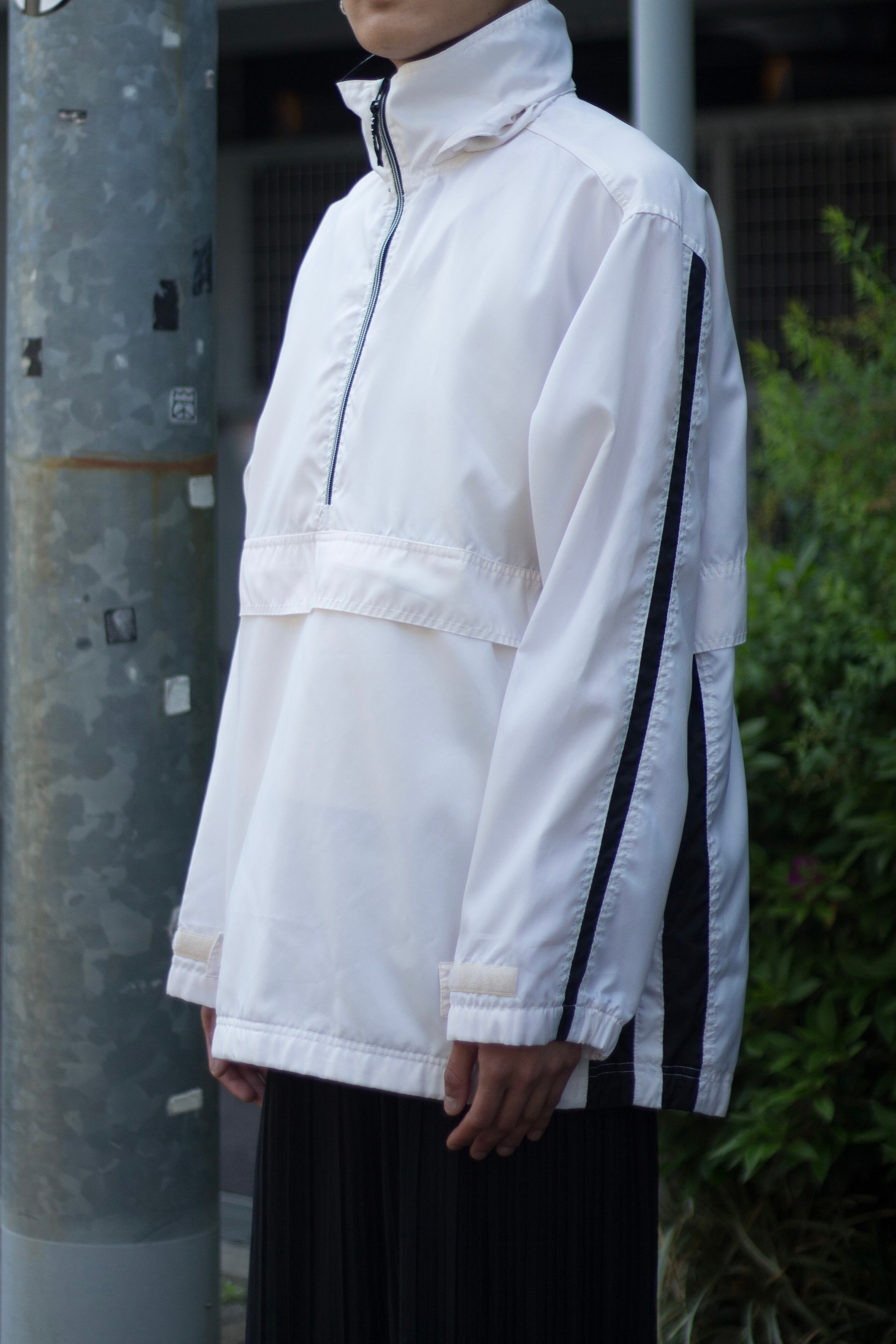 ハイネック仕様で、ちゃんとセンターまで深めなハーフジップにフロントフラップポケット、両サイドにジップポケット、裾ドローコード付きのアノラックタイプ。