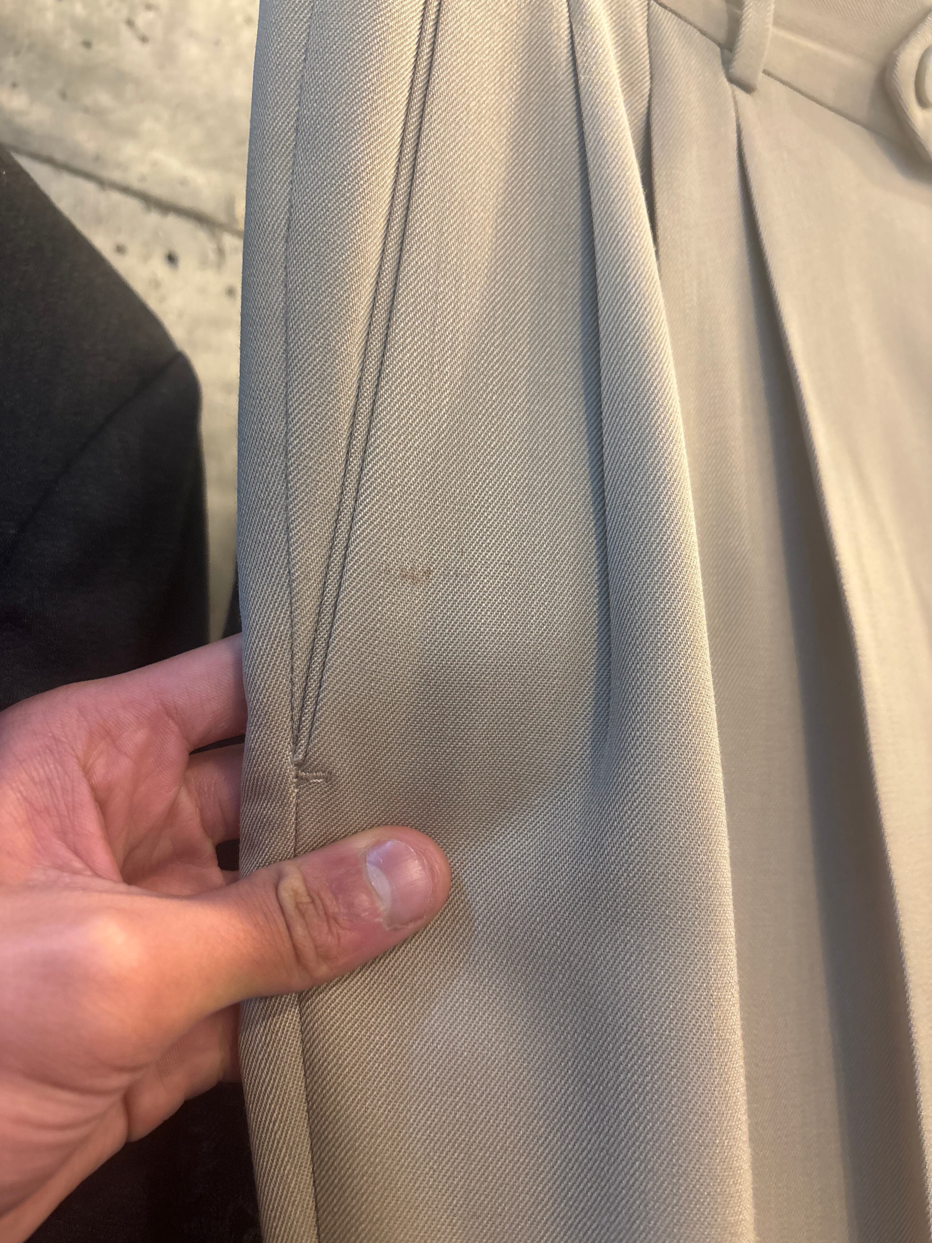 メゾンブランドらしい高品質なウールギャバジン生地でウールとは思えないほどのとろみファブリック。起毛感少なくウール特有のハリ,光沢をそのままに。なスペシャルなスラックス。