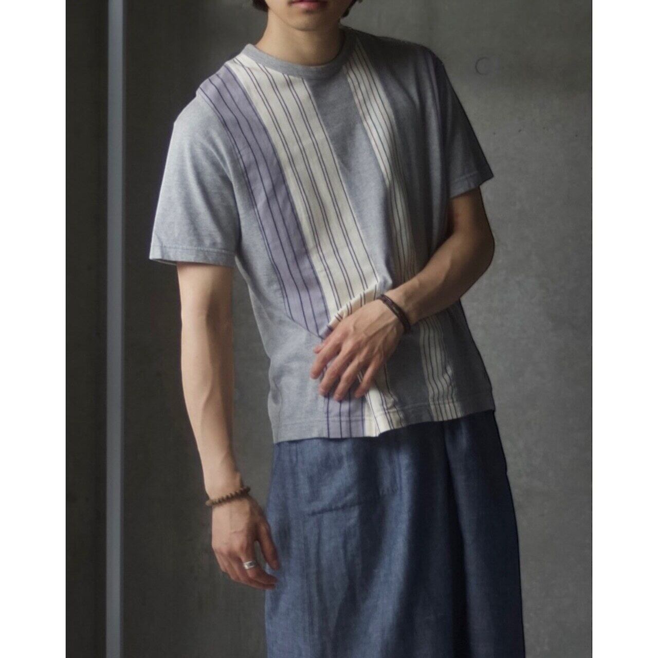 フロントのみストライプシャツの切替になっていてシンプルながら遊びがあるアイテム。