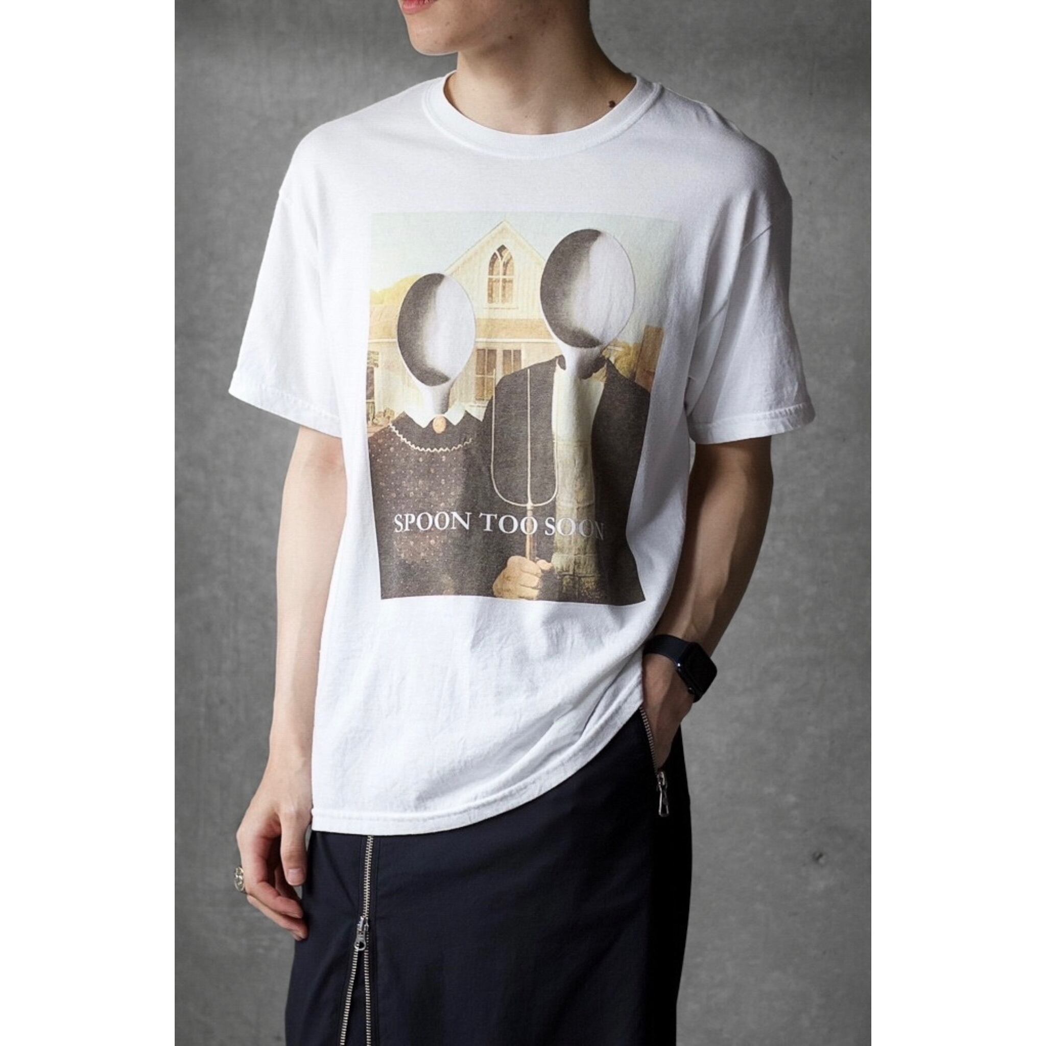アメリカン・ゴシック風の絵に、顔がスプーンで描かれた個性的なビジュアルと、「SPOON TOO SOON(早すぎたスプーン)」というウィットに富んだフレーズ☺︎
