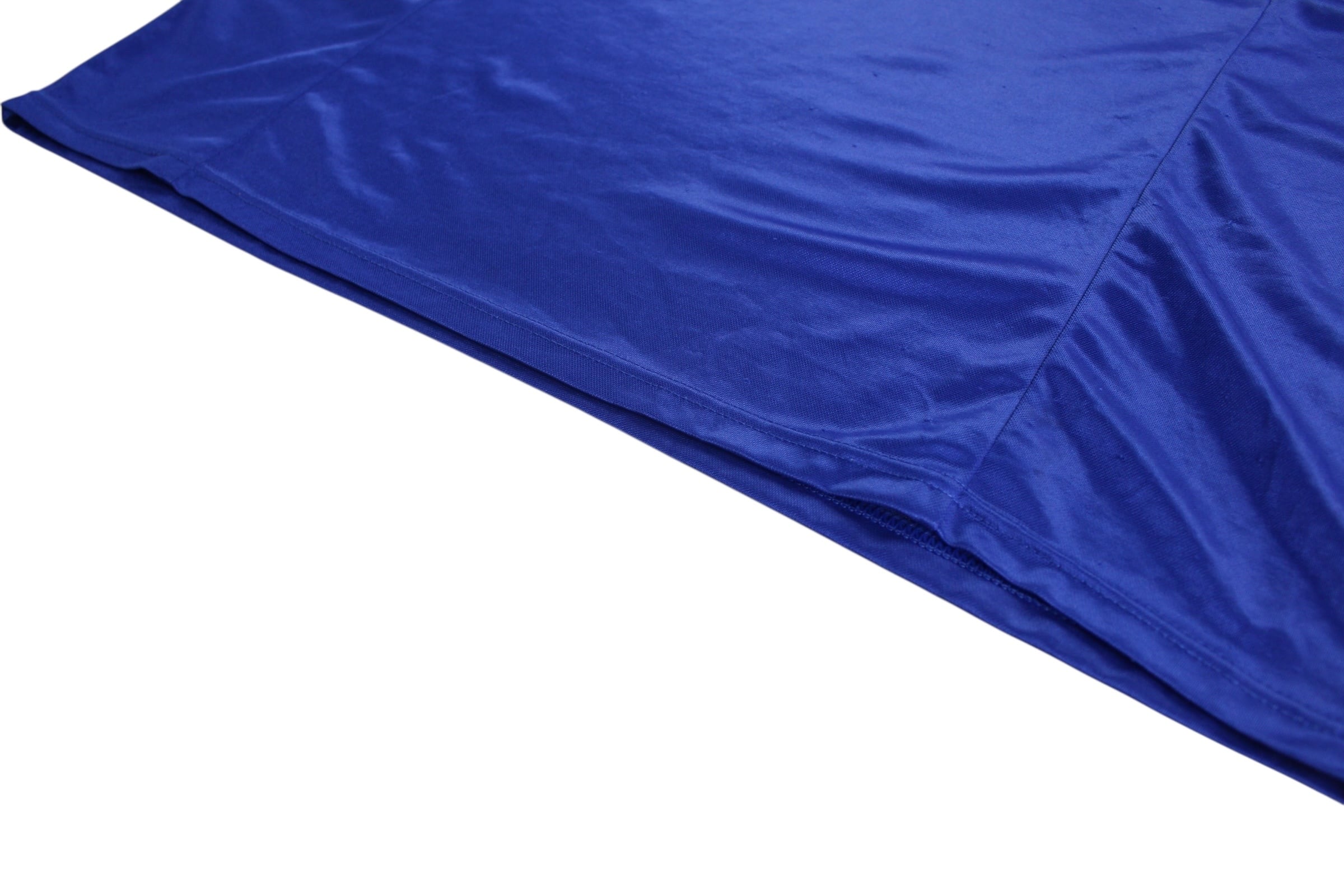 サテン地のブルーを基調とし、襟,袖にかけて黄色の切替がはいったコントラストの強いデザイン。