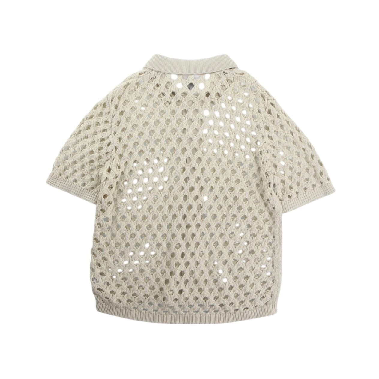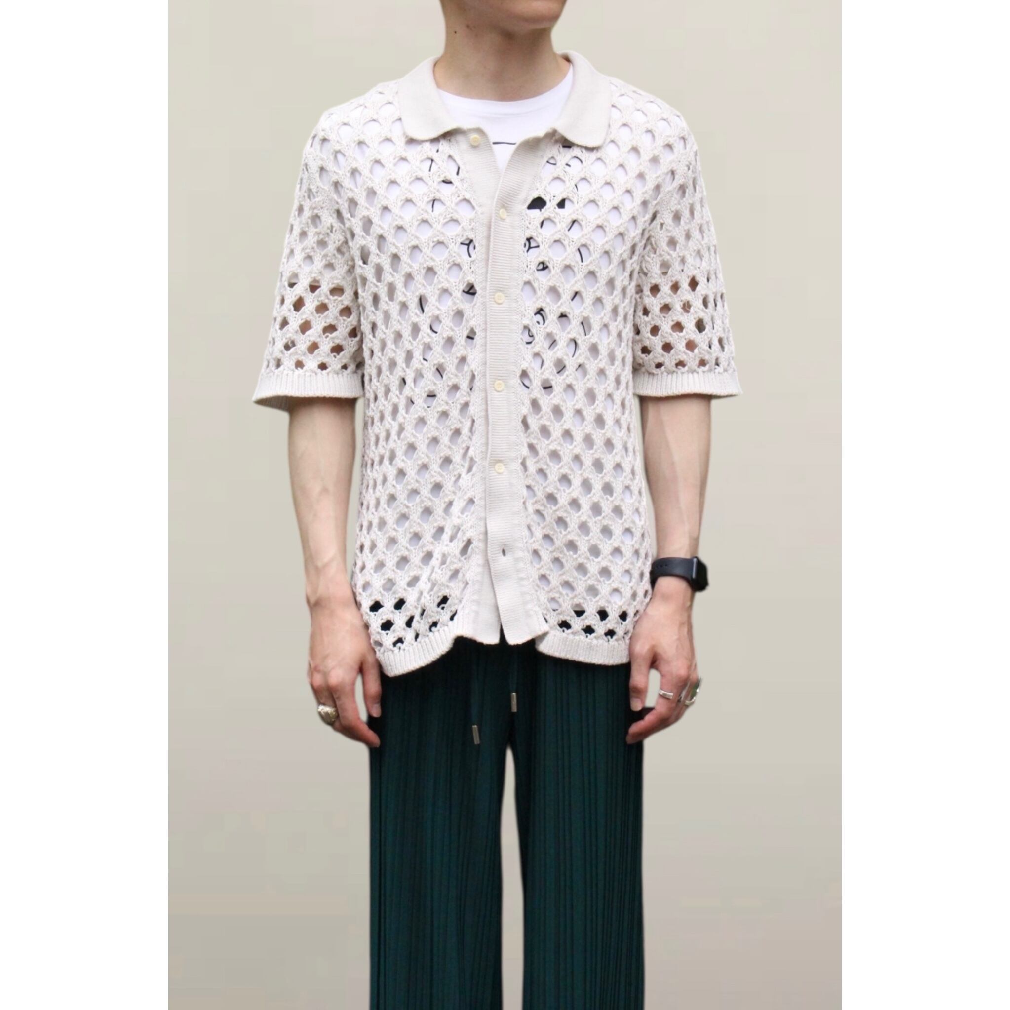 特徴の大きな透け感を感じられるローゲージな編み目に襟付きシャツディテールの1着。