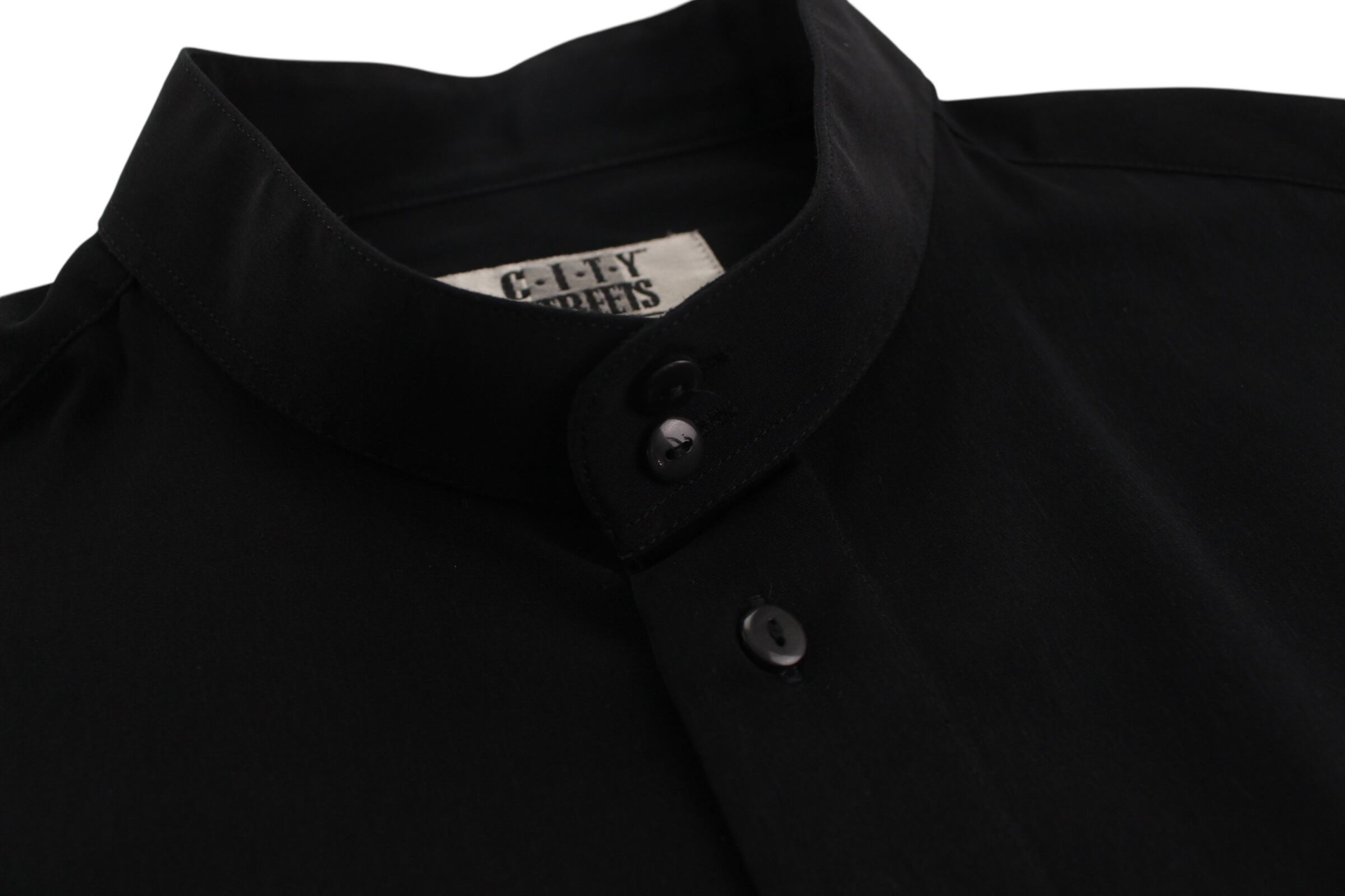 ブラックの比翼仕立は、全体の印象をすっきりと上品かつモダンにまとめ上げ、低めのネックラインは美しさを強調する素晴らしい1着。