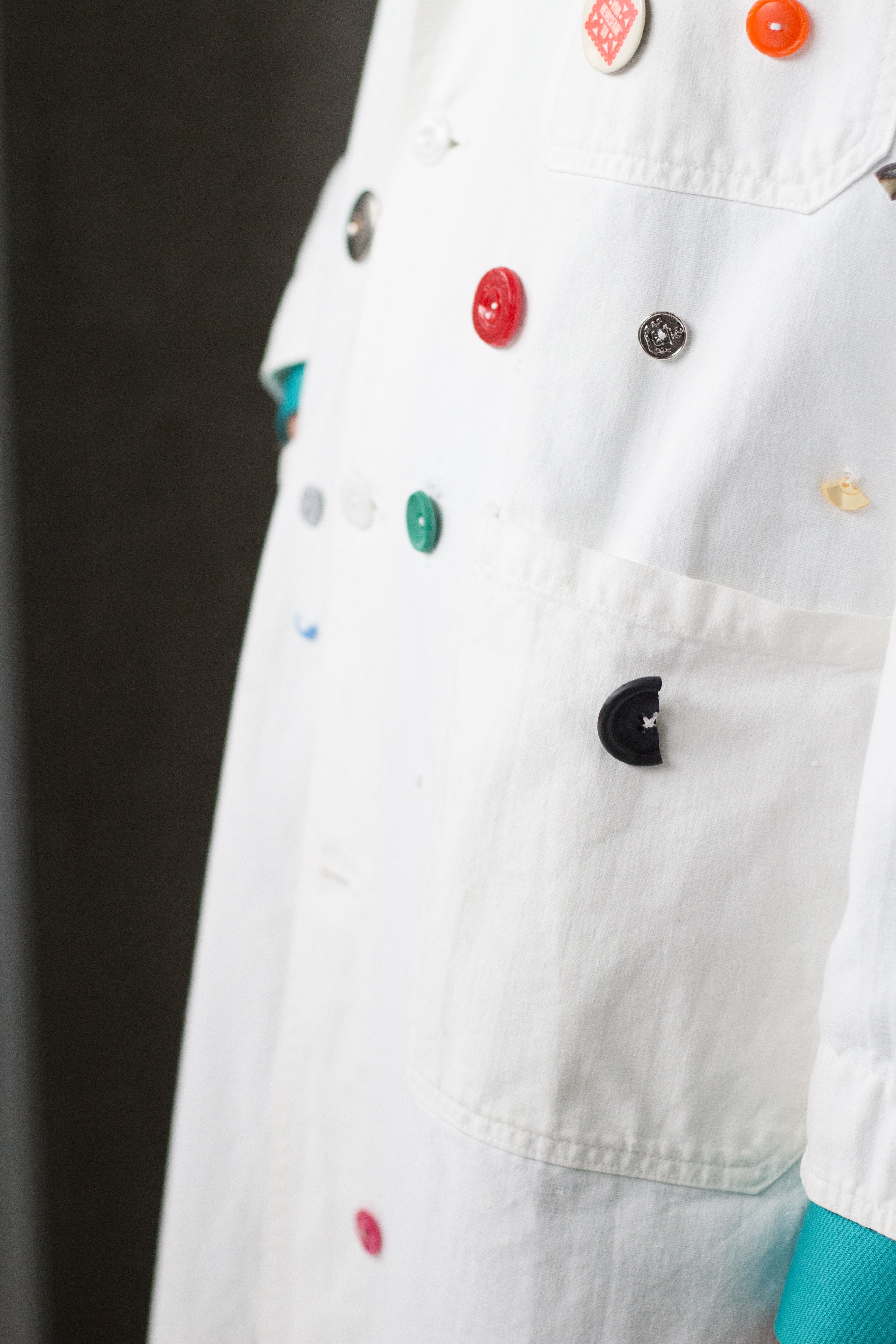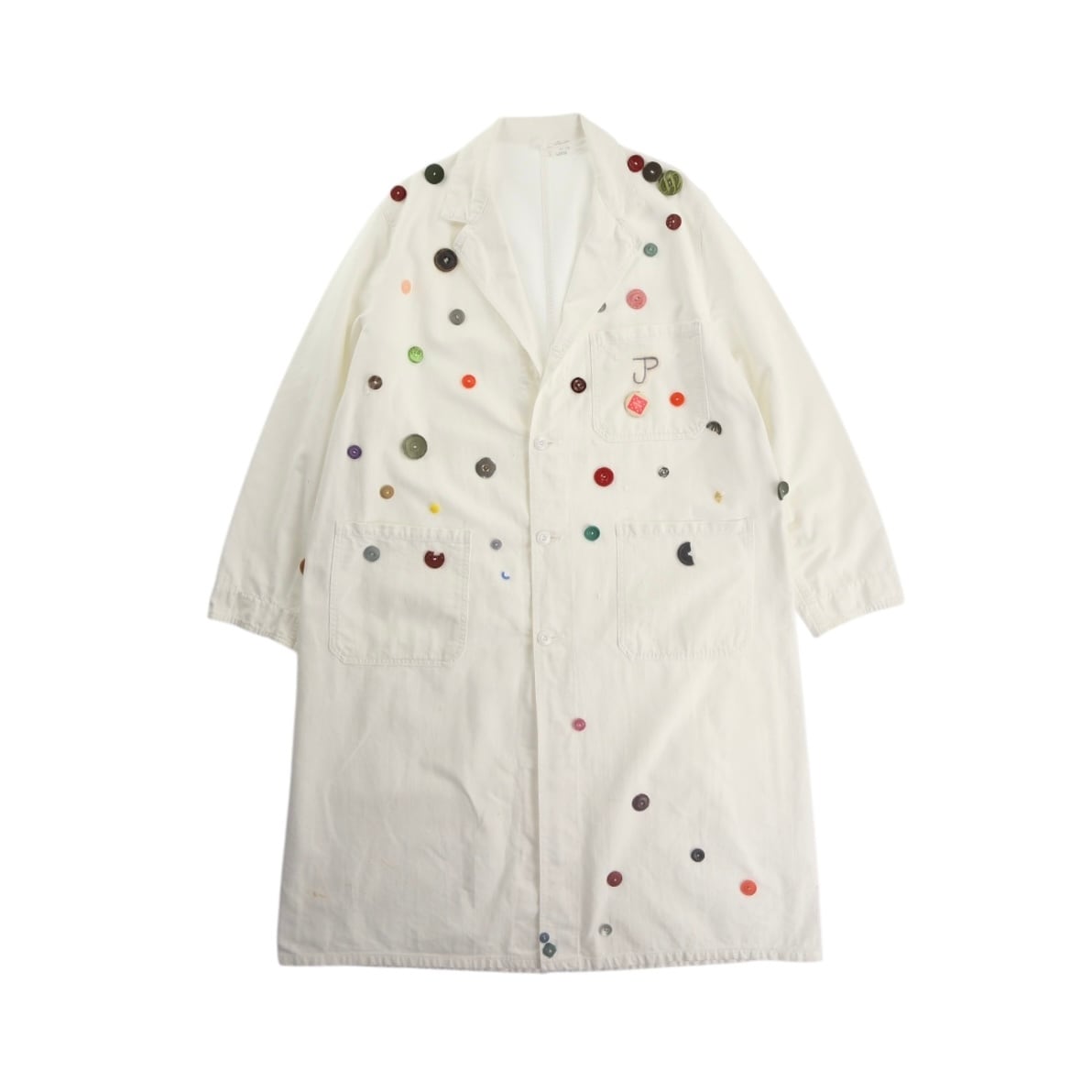 一般的なワークコートには珍しいクリーンなホワイトカラーは、これらの個性的な装飾を際立たせ、無骨なワークウェアのテイストと、手仕事による温かみ、そしてアーティスティックな感性を絶妙に融合させています。