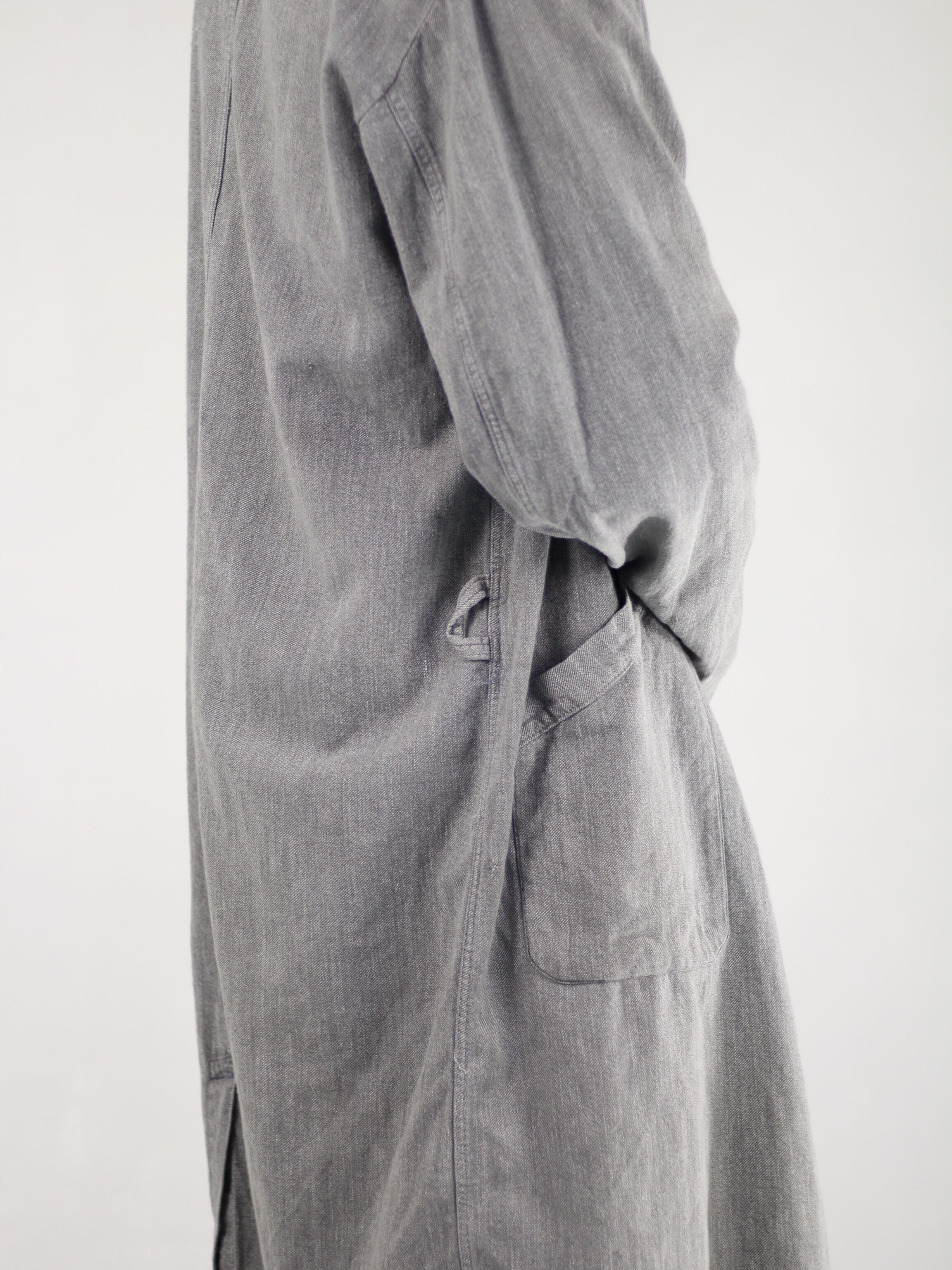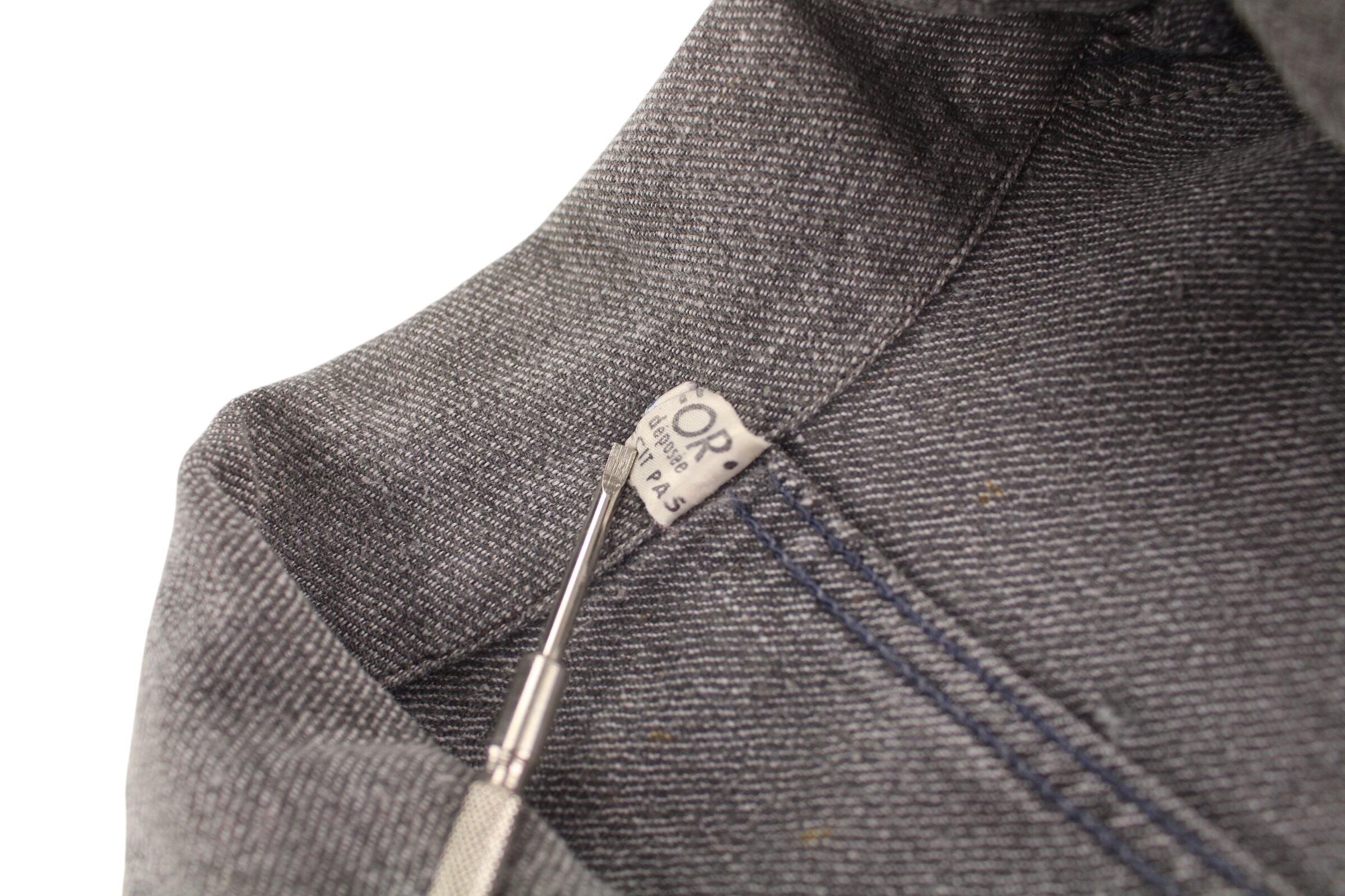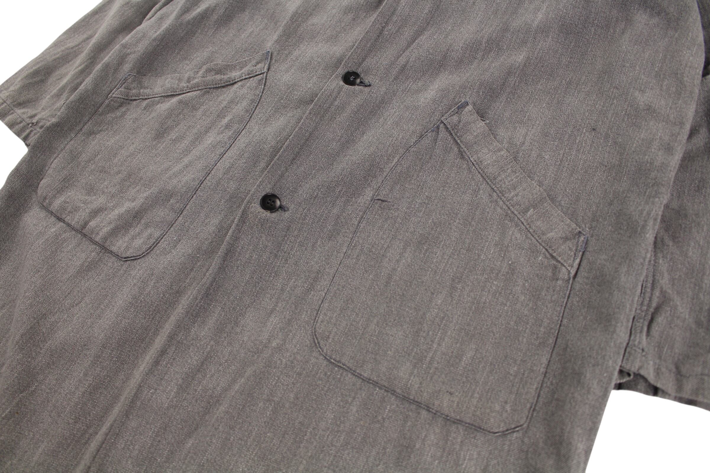 独特の肉厚で堅牢なブラックシャンブレー生地は、長年の着用と洗濯によって生まれた深みのあるグレーの「ゴマ塩」のような風合いが魅力で、新品の服では決して味わえない風格と奥行きを醸し出しています。