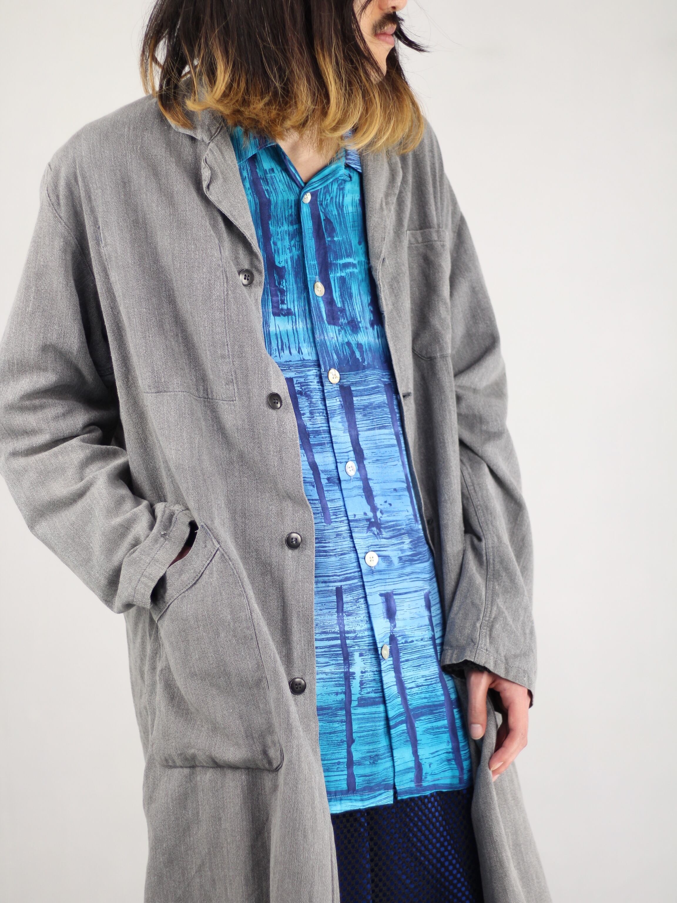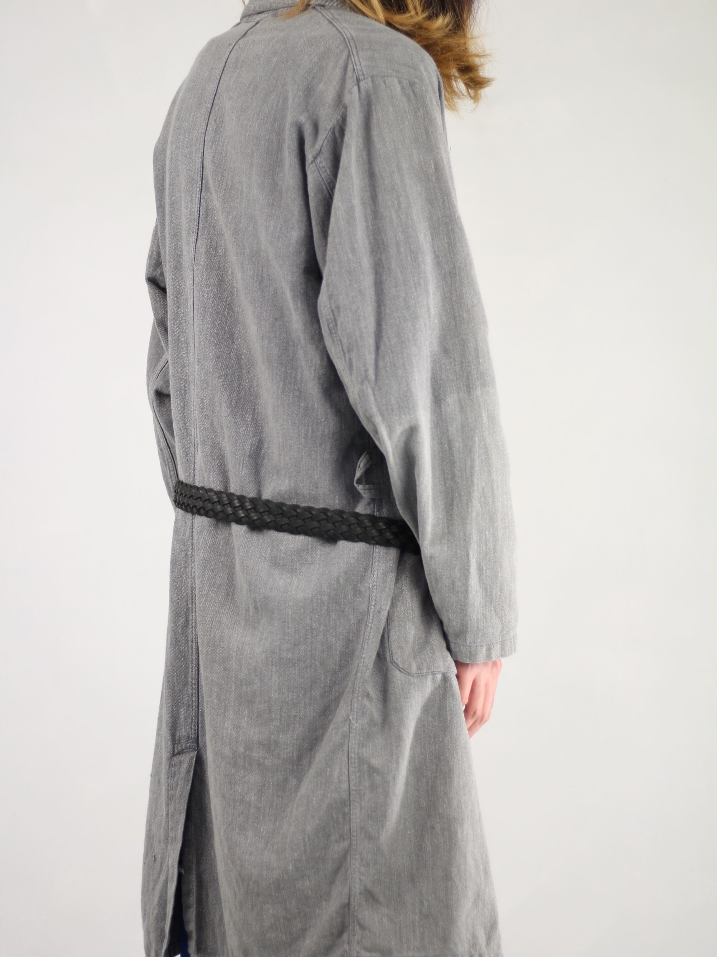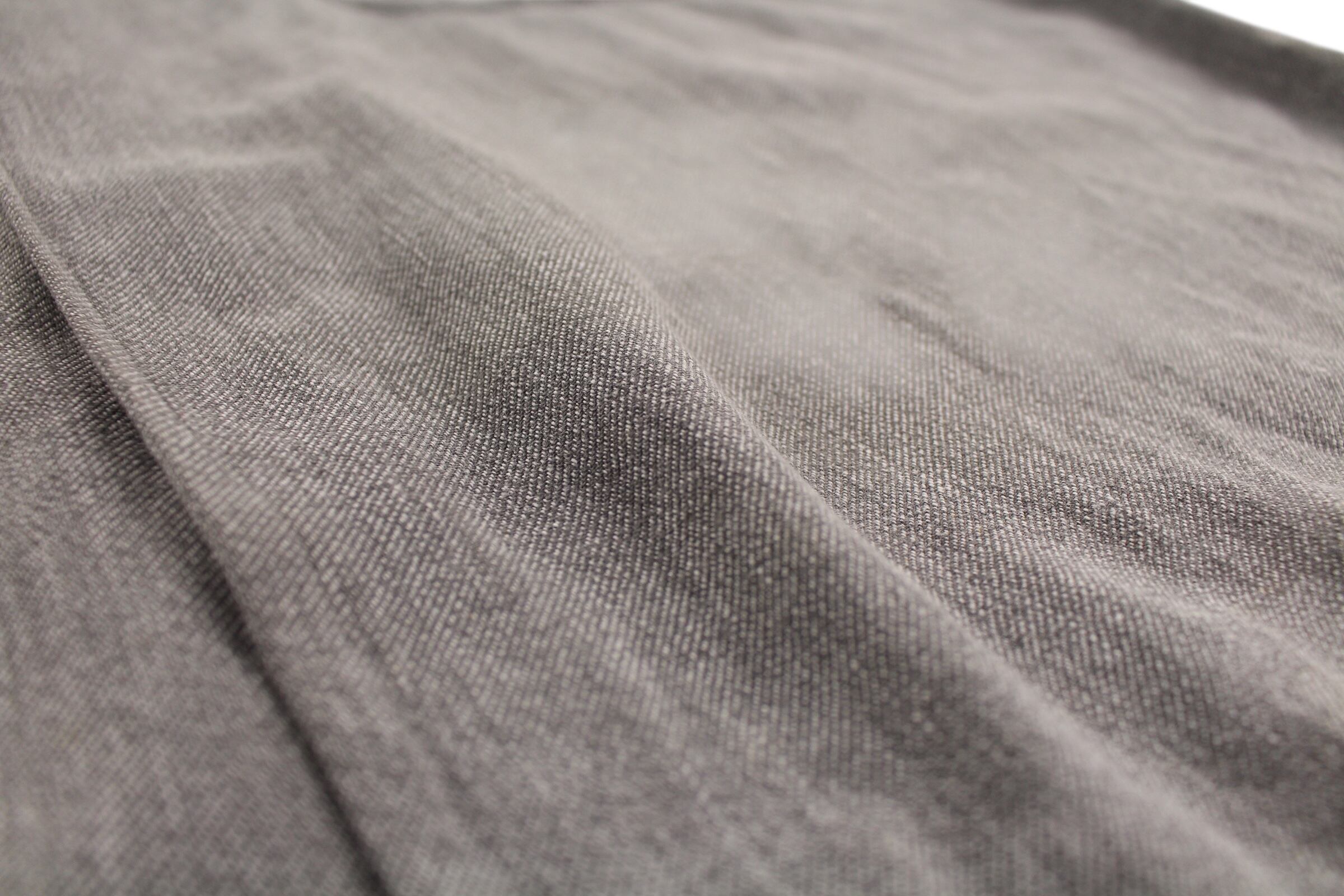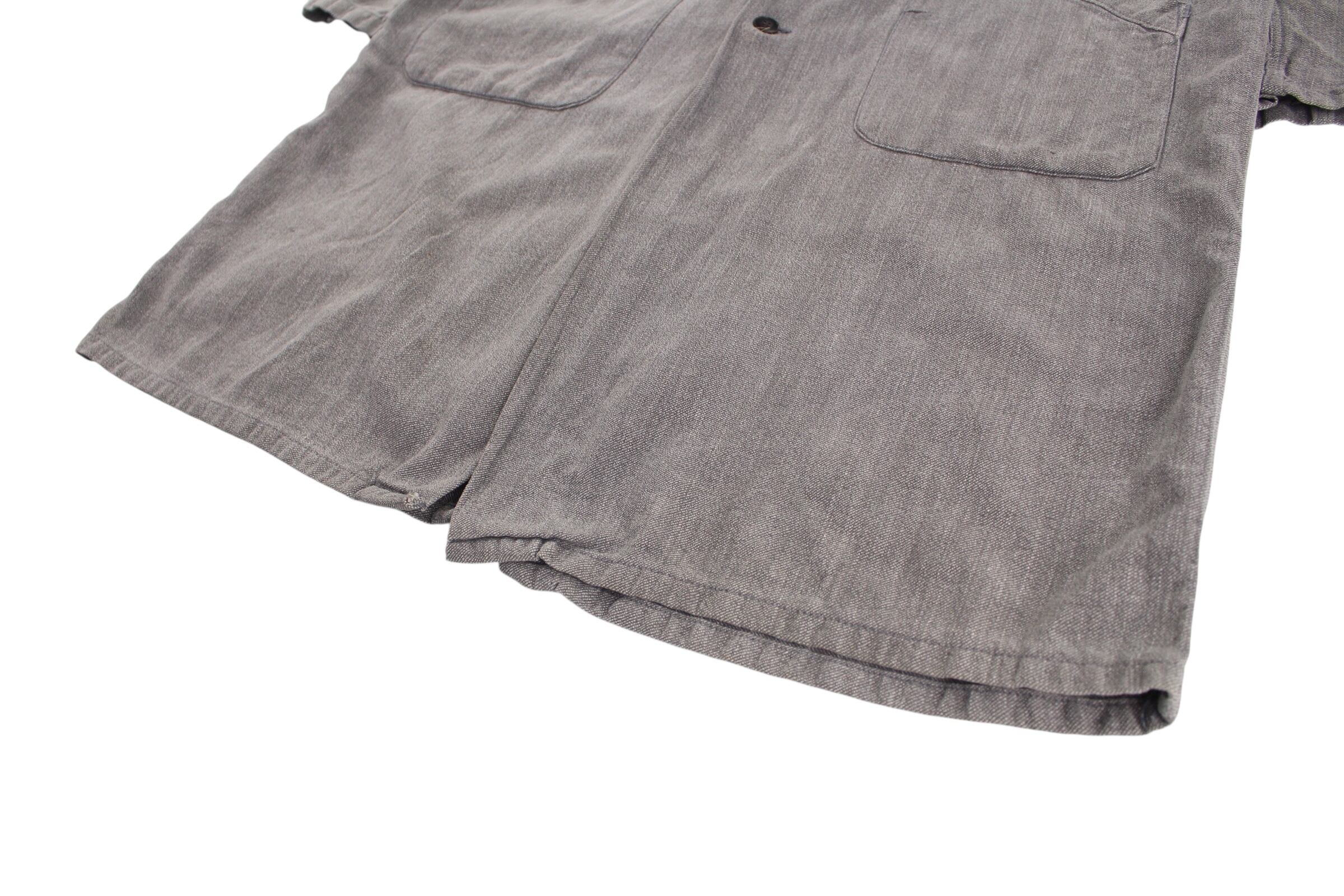 独特の肉厚で堅牢なブラックシャンブレー生地は、長年の着用と洗濯によって生まれた深みのあるグレーの「ゴマ塩」のような風合いが魅力で、新品の服では決して味わえない風格と奥行きを醸し出しています。