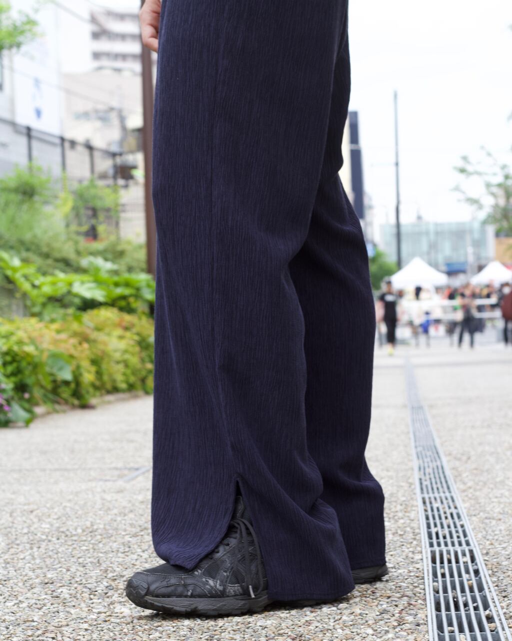 プリーツパンツとは違う雰囲気を持つシワ加工。