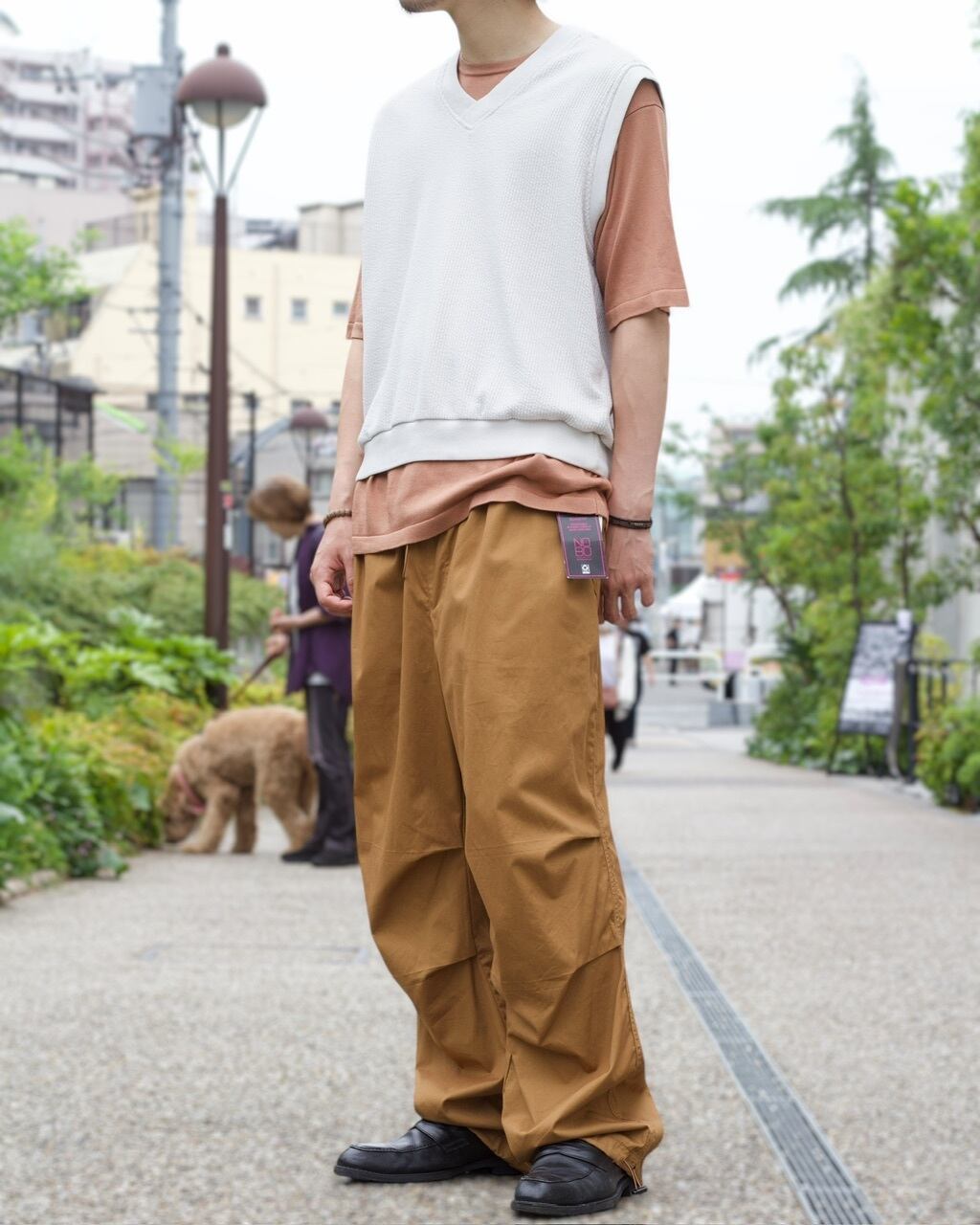 ナイロン100%のテック生地のワイドイージーパンツ。ウエストゴム&ドローコードでノンストレスで着用できる,あるとなにかと履いちゃうパンツ。