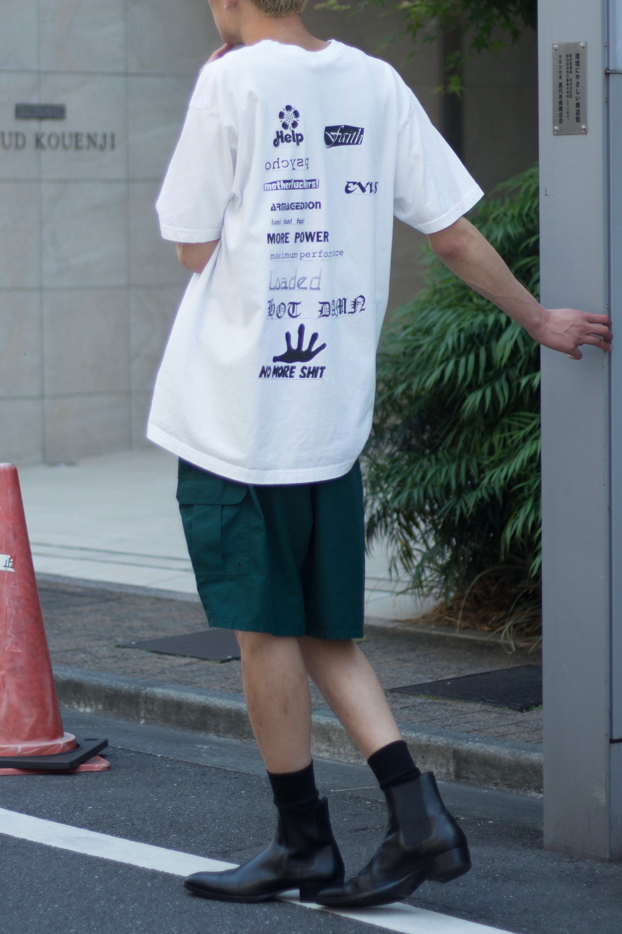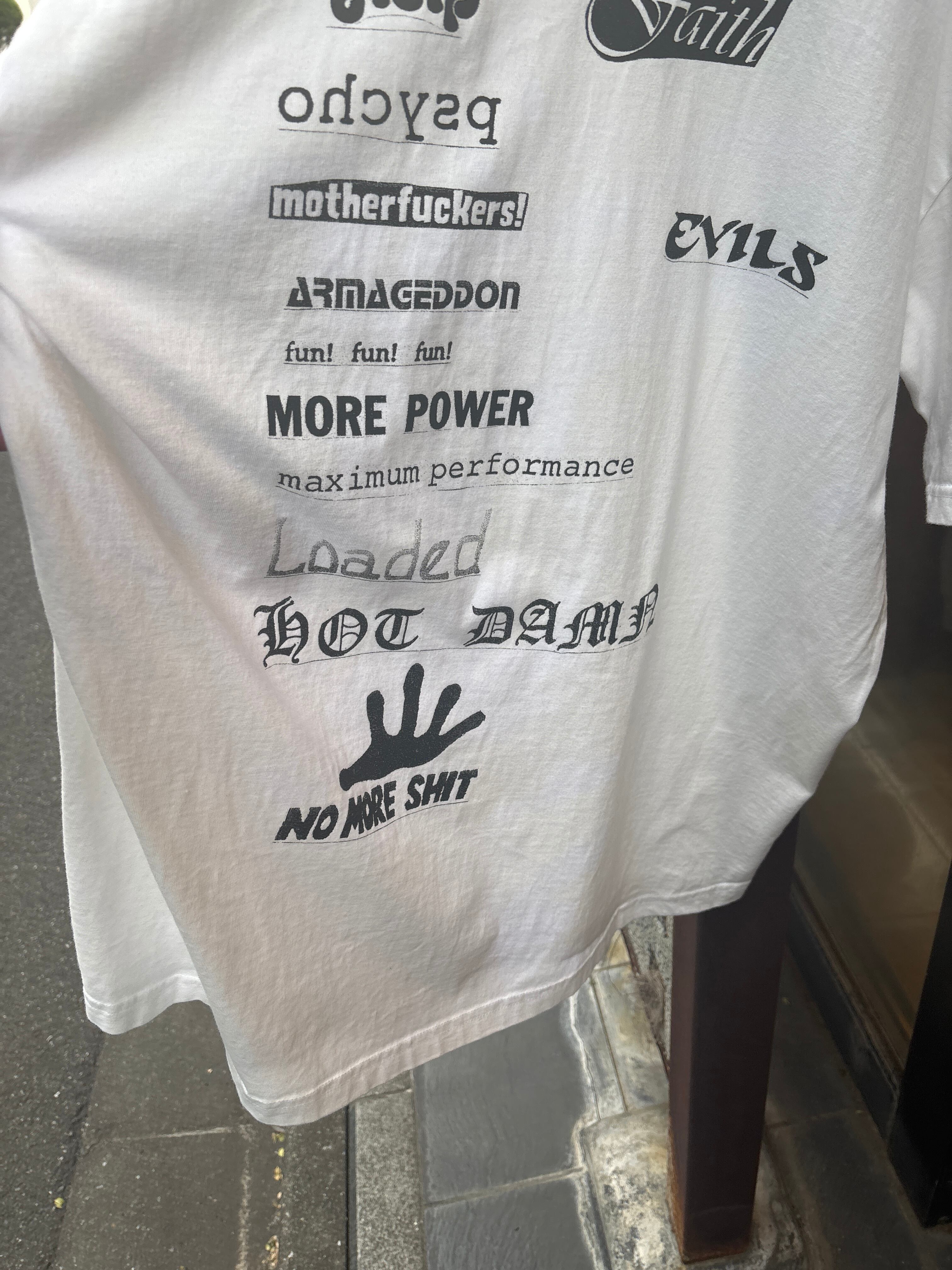 フロントにはミニマルなボックスロゴ風のプリントを配しつつバックにはHelp,motherfuckers!,ARMAGEDDONなど、様々なフォントとワードがストリートらしくレイアウトされた挑発的なデザイン。