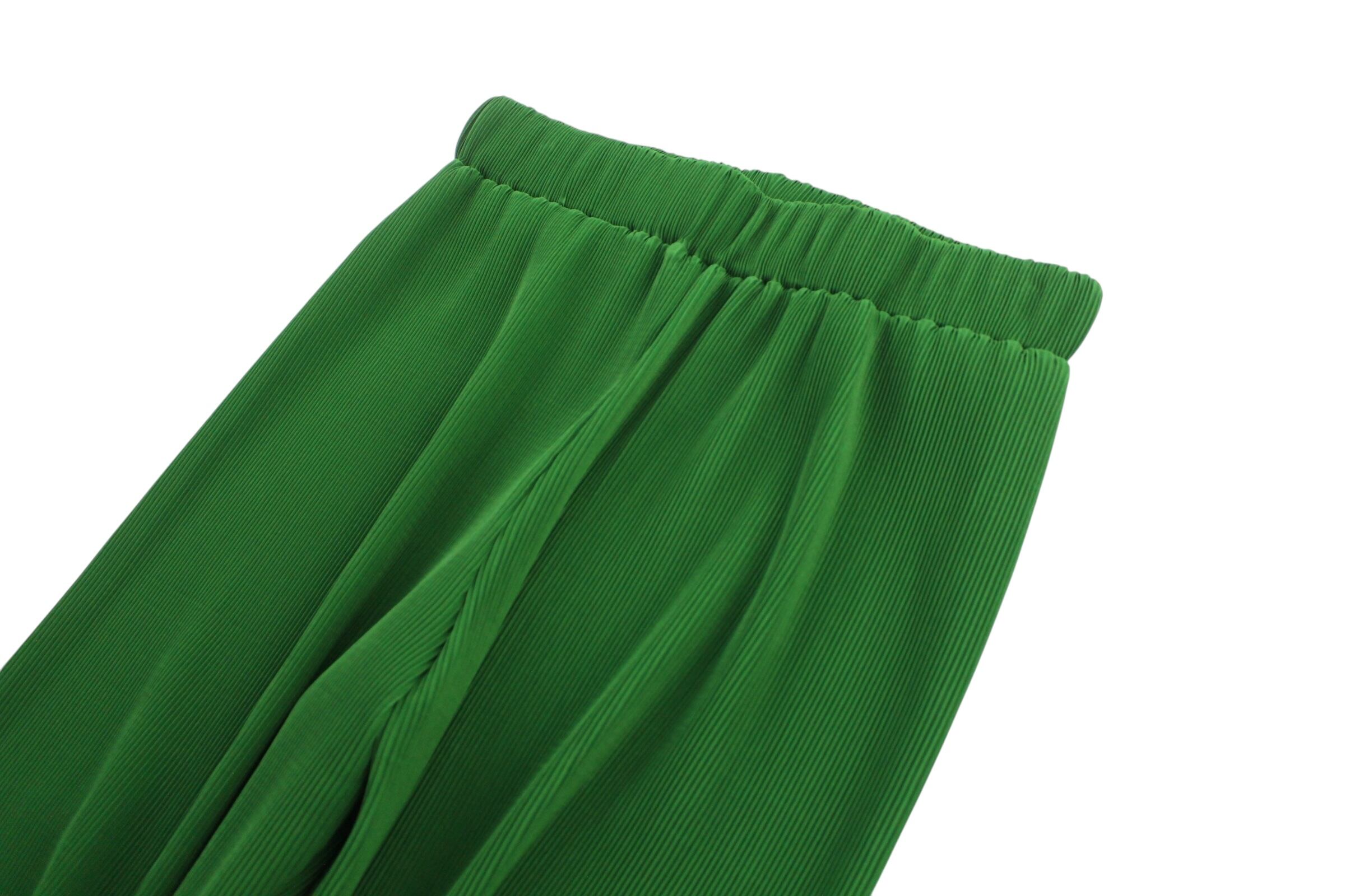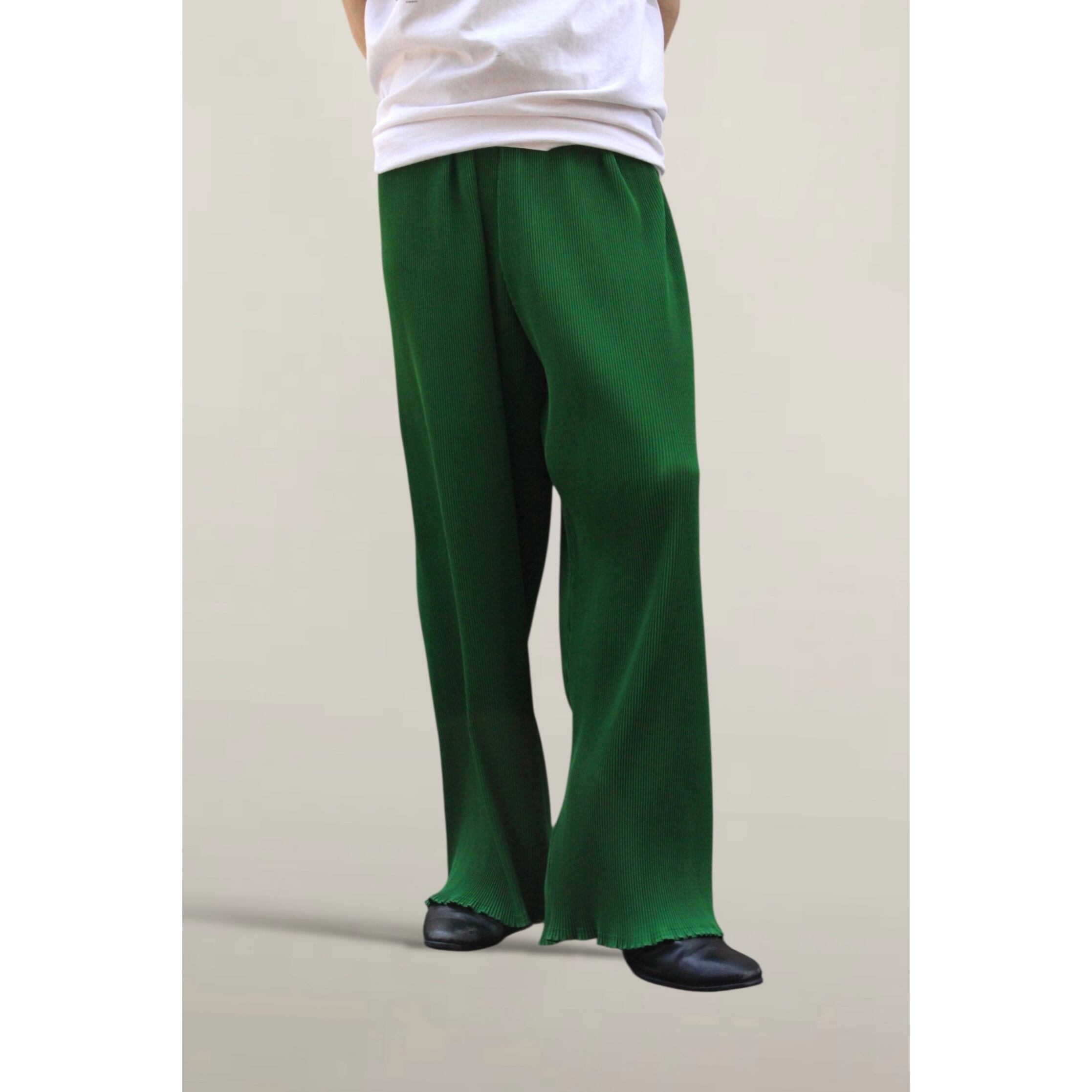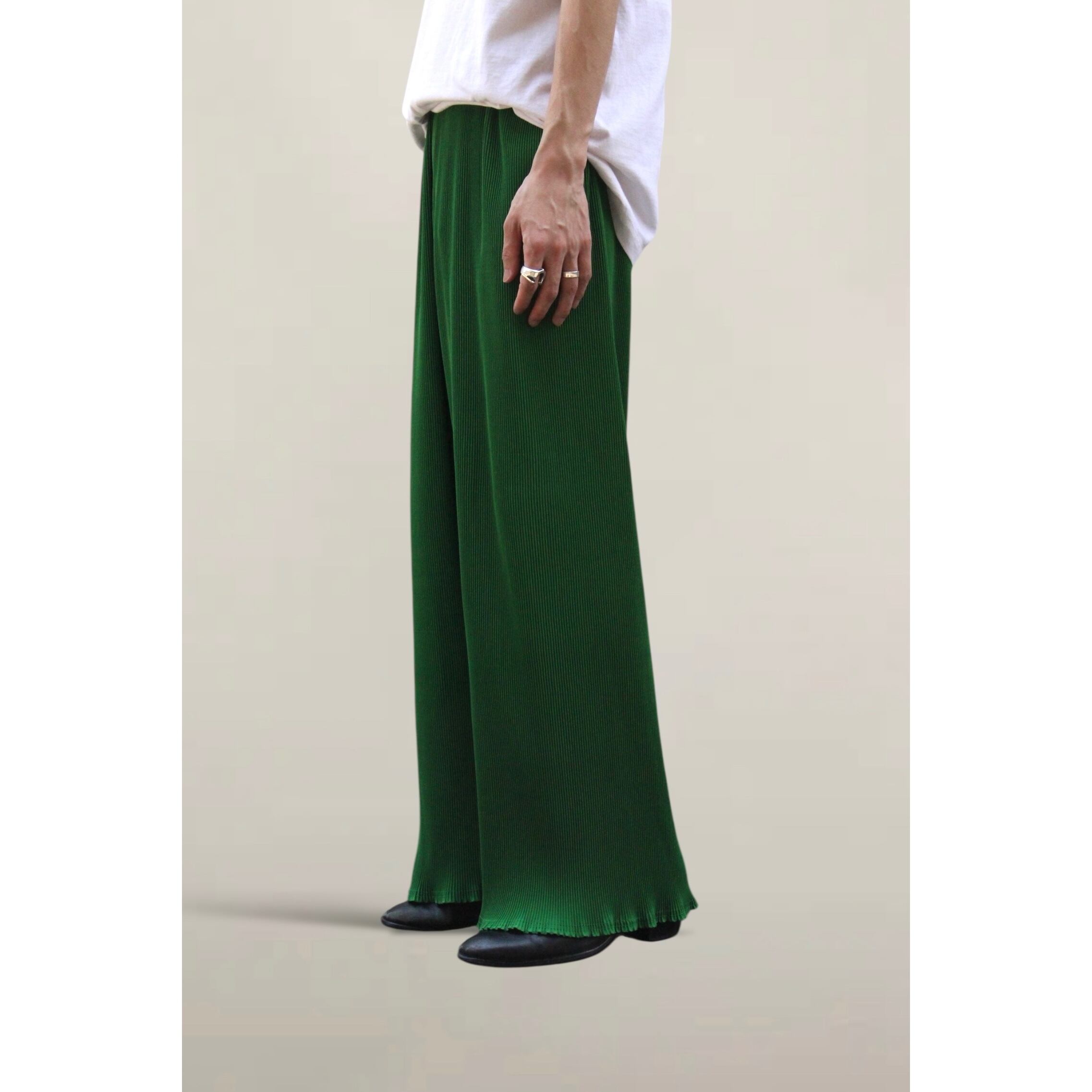 落ち感を感じる細かいプリーツと、さらさらしたポリエステル素材を使用した、ワイドシルエットのイージープリーツパンツ。
