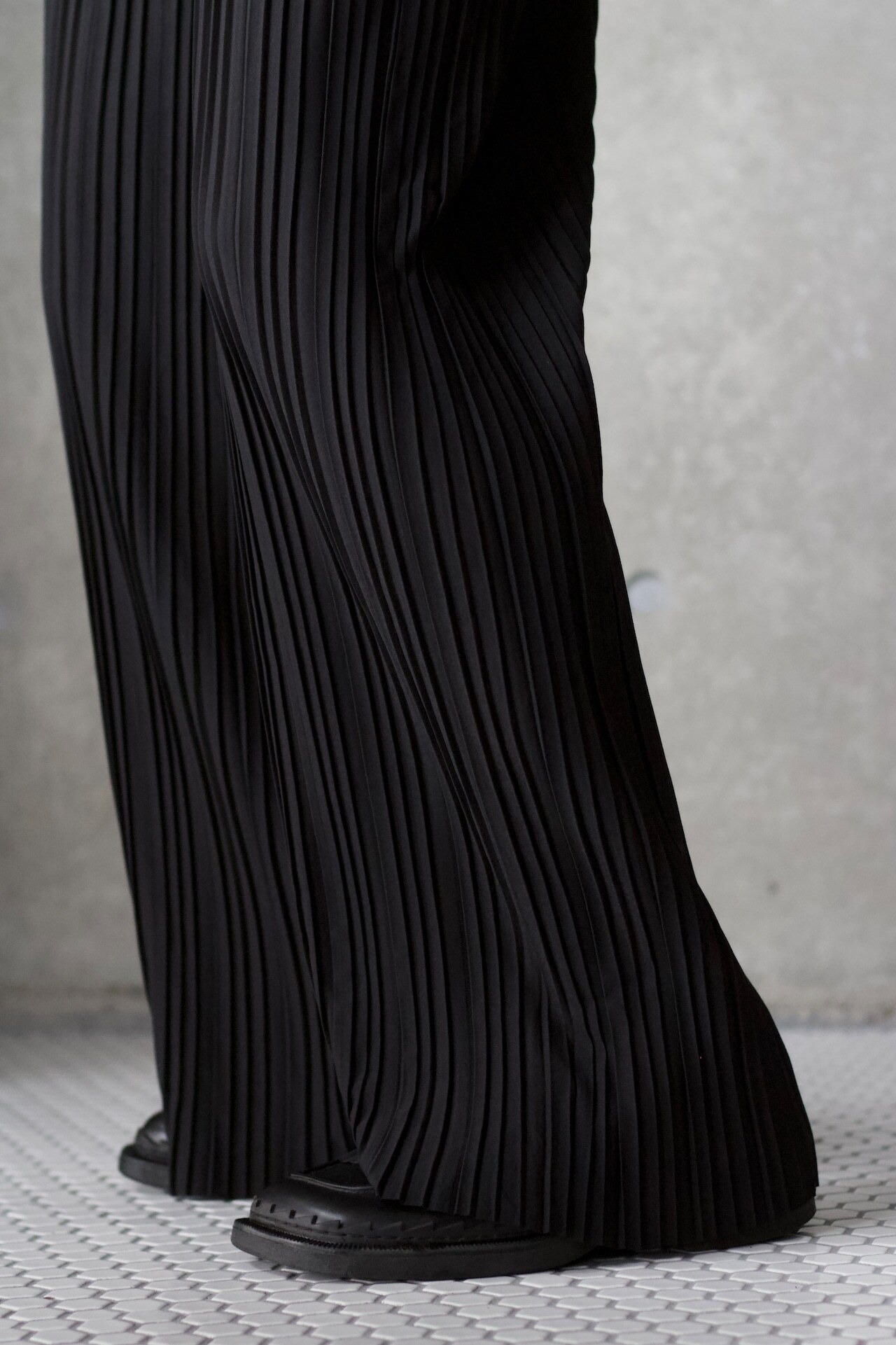 ブラックカラーのプリーツパンツ