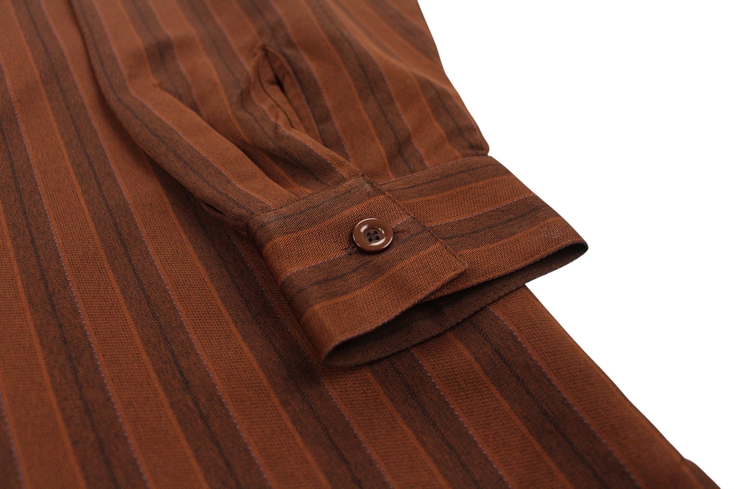 テラコッタの色気のあるカラーとブラウンが色合いのストライプシャツ。