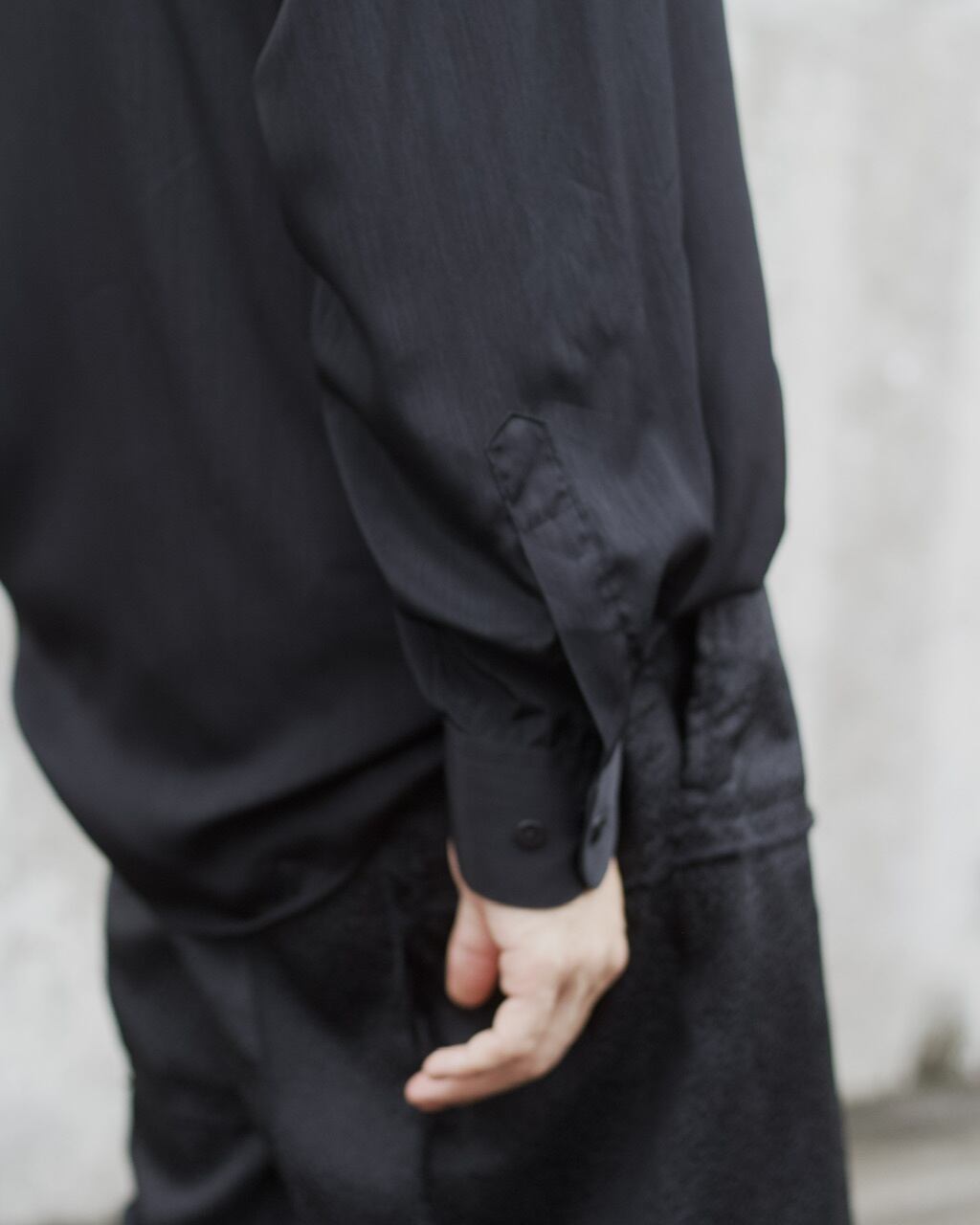 サテンの素材とバンドカラーの綺麗な品のあるシャツ。
