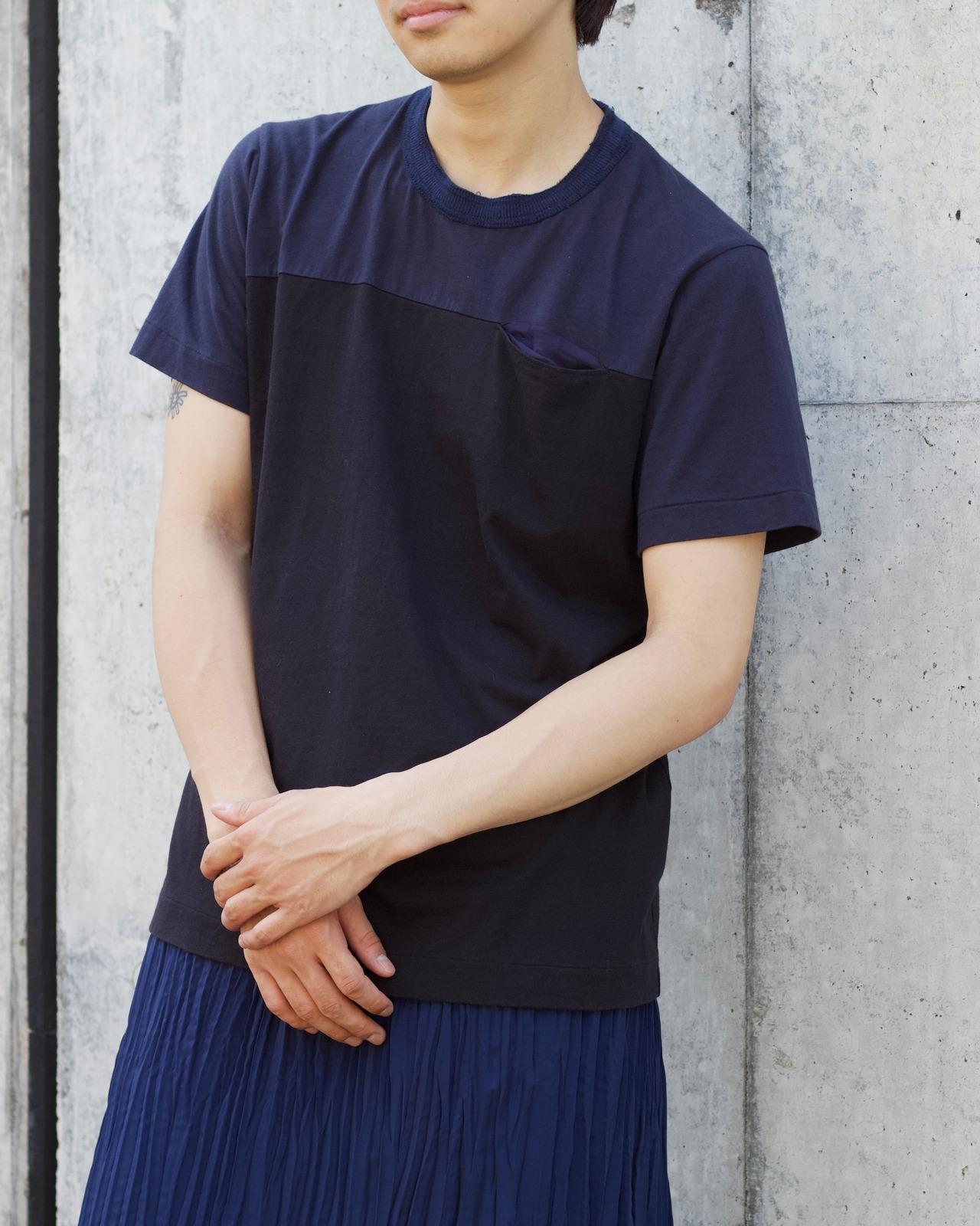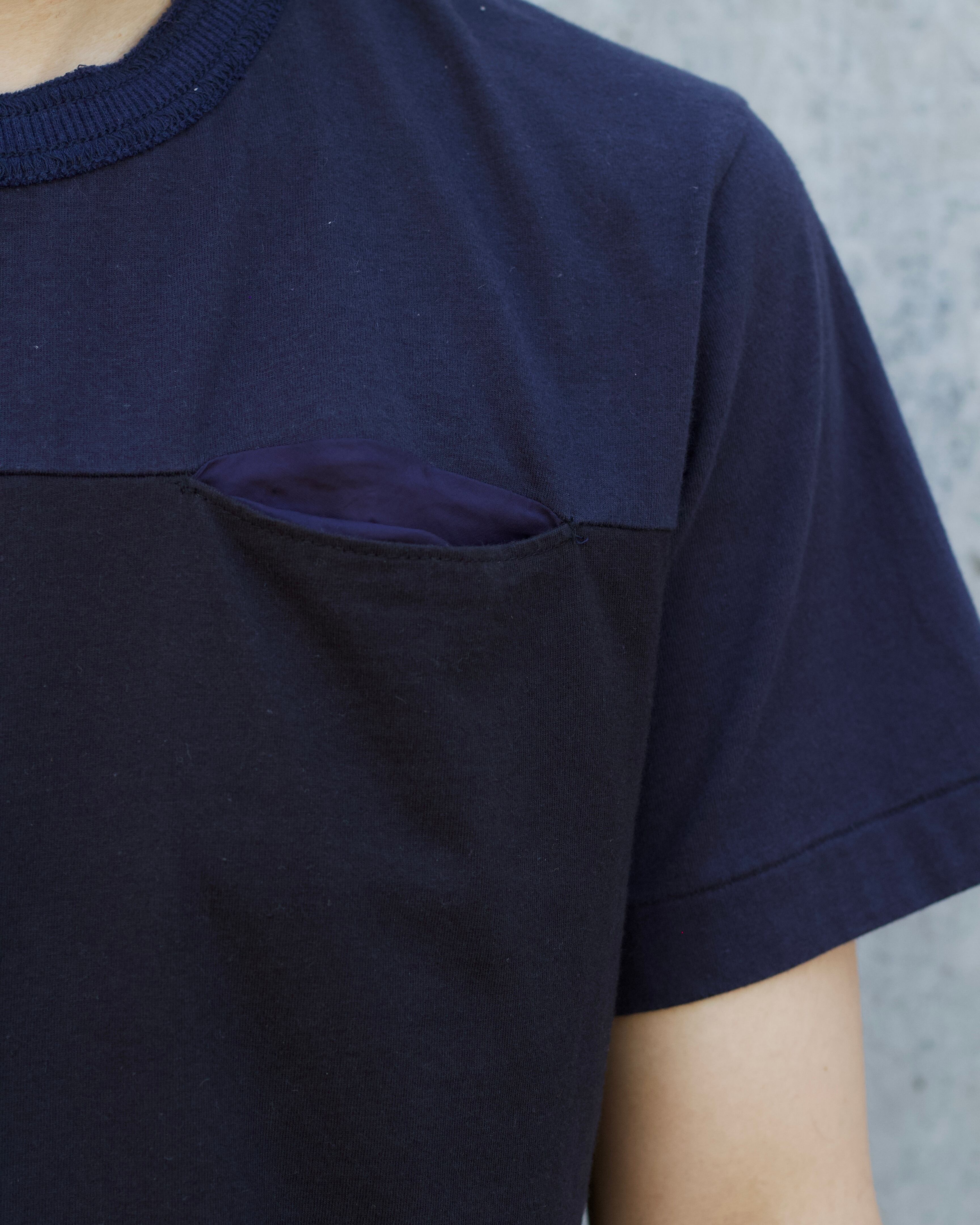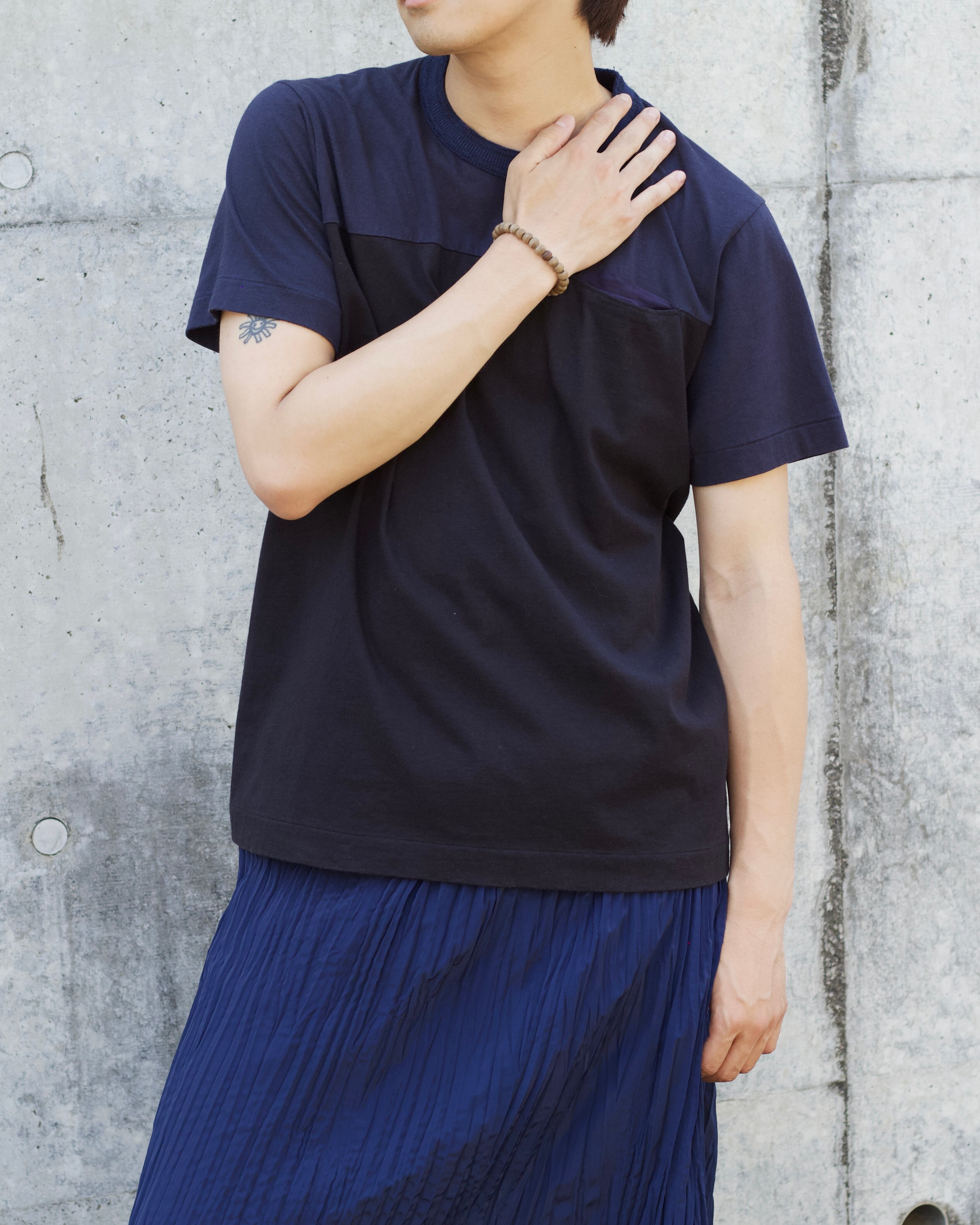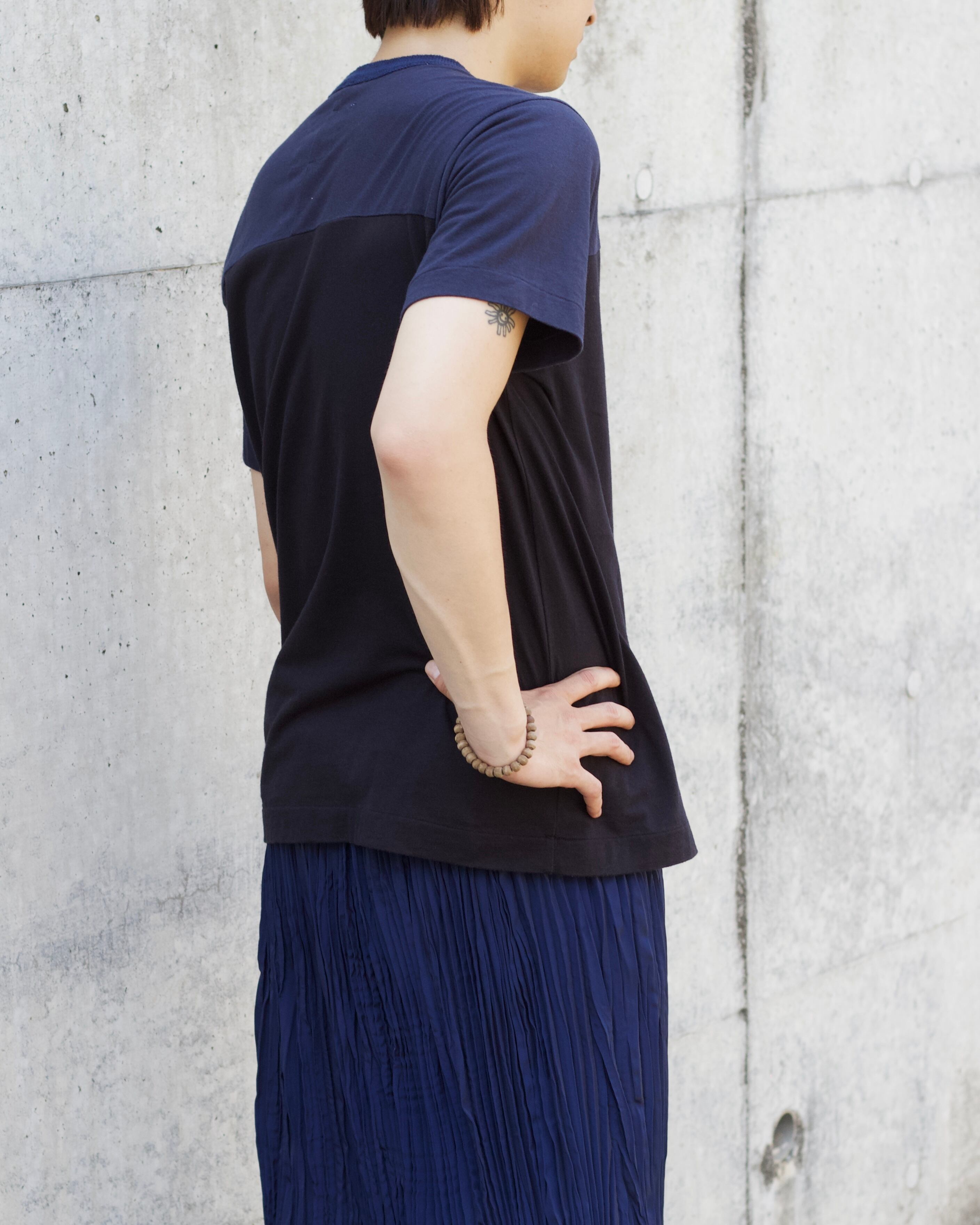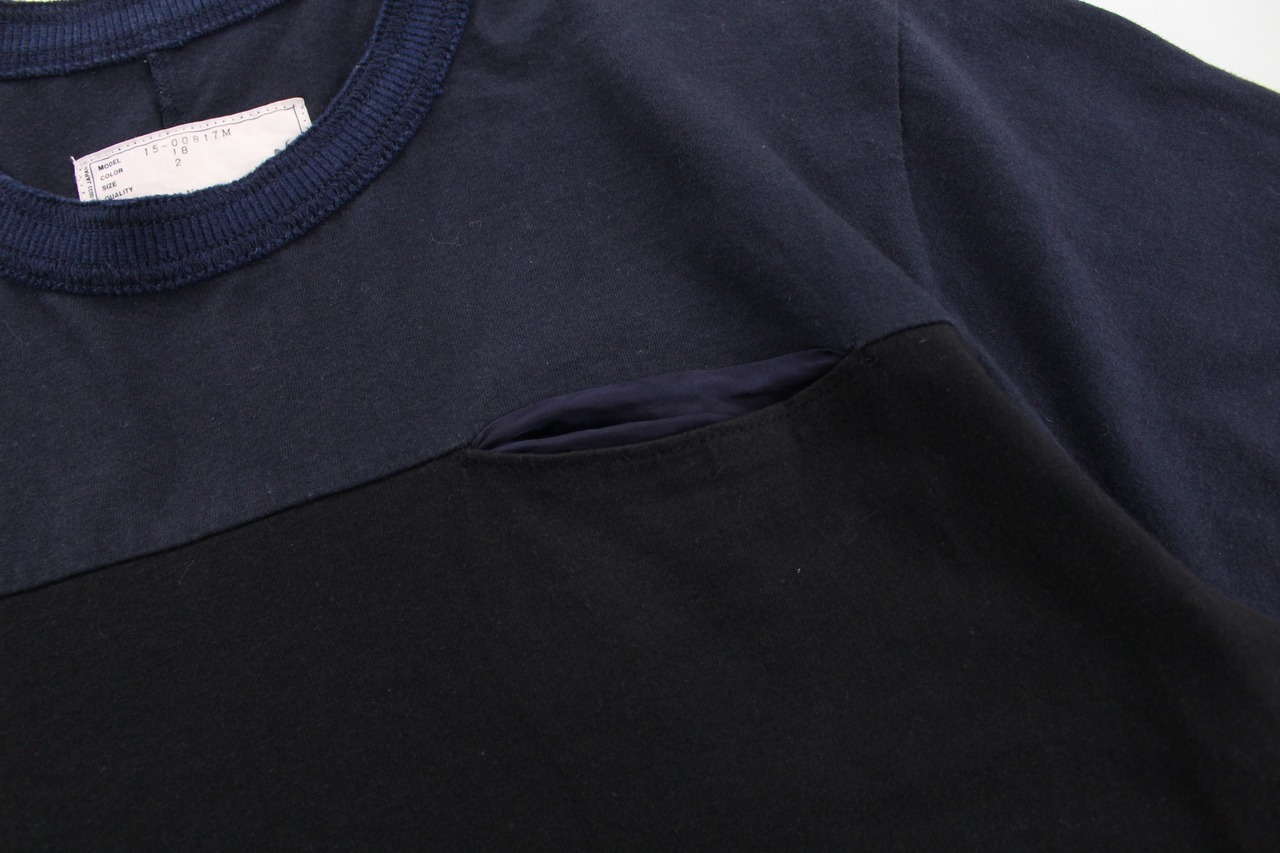 2015年モデルのものでブラックとネイビーの生地を掛け合わせたバイカラーなTシャツ。胸には小さめなポケットが付き、デザイン性も◎