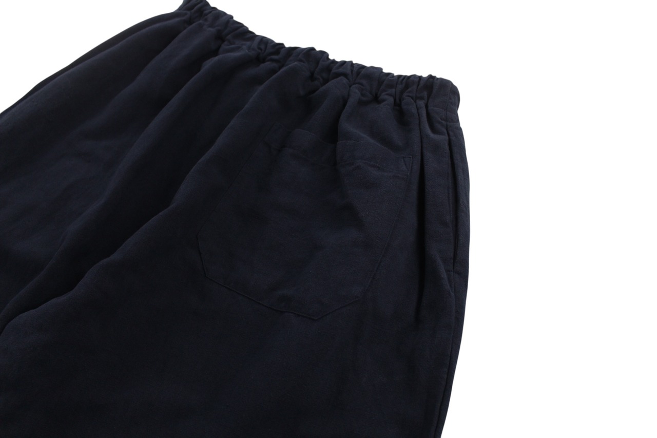 パンツもテーパードがないワイドストレートのシルエットでウエストはドローコード付きのイージータイプ。