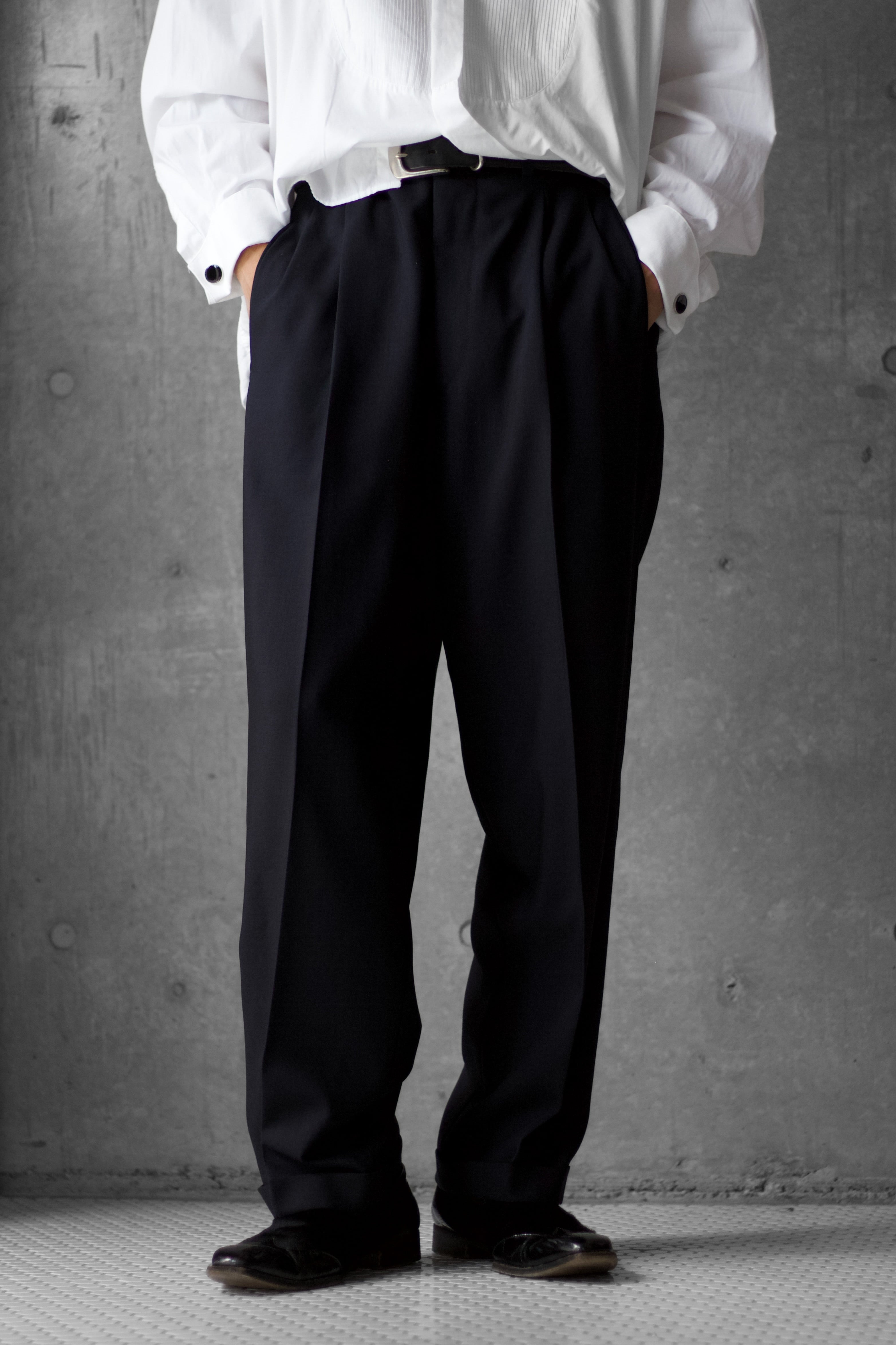 深くタックが入りでスッキリとした腰回りに、しっかりとワイドなシルエット。