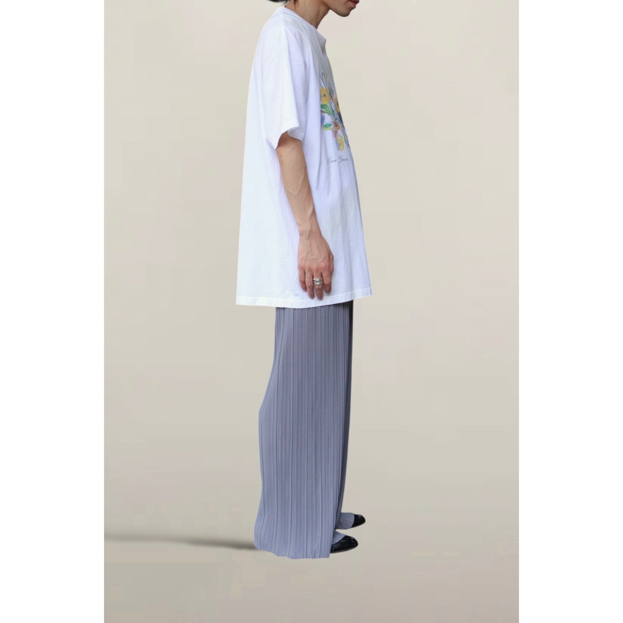 細かいプリーツデザインはジェンダーレスな雰囲気にドレッシーさもあり、カジュアルからモードスタイルまで幅広くお使い頂ける一本。