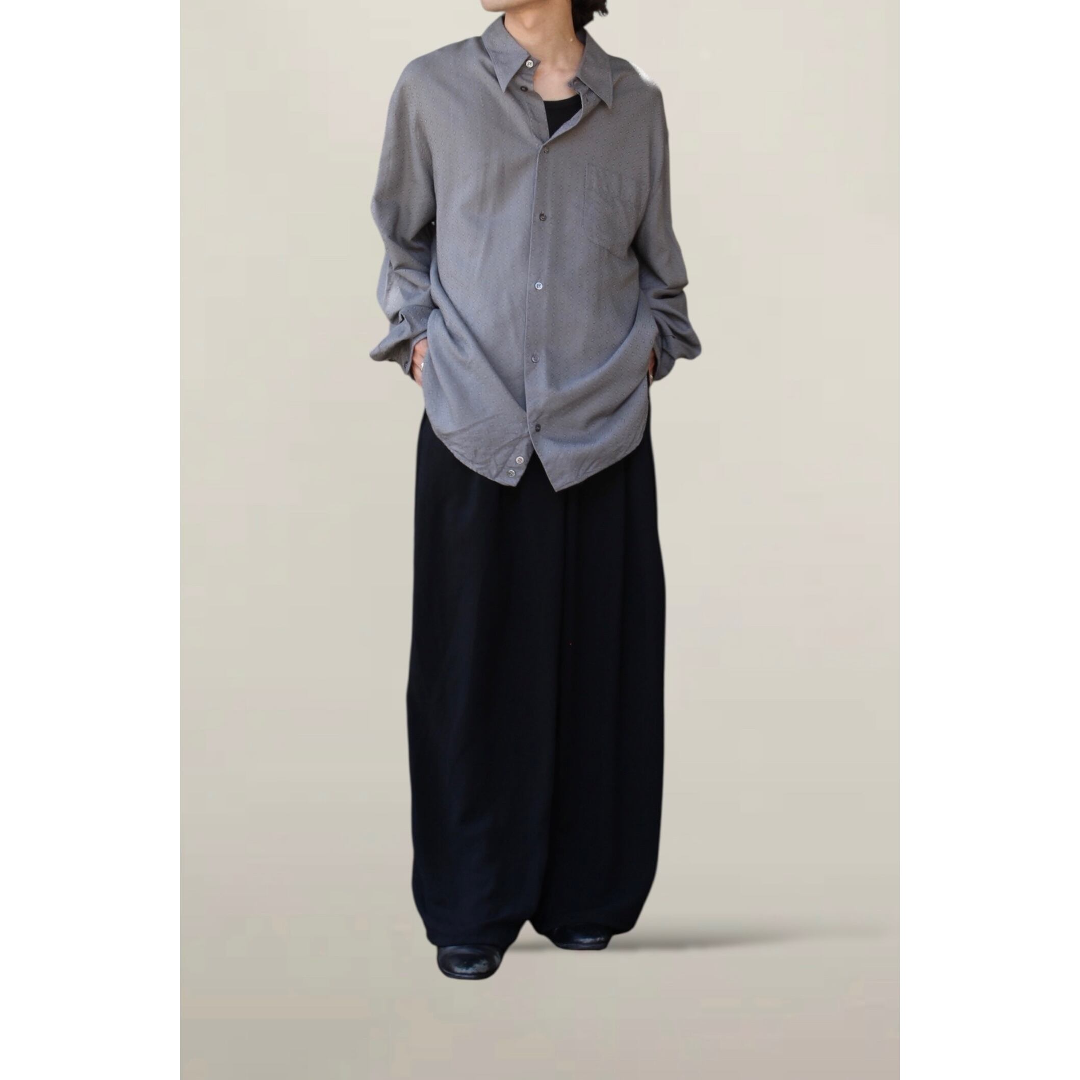 ポリエステルがメインのとろみのある生地感。裾までのドレープが良く動きが感じられる滑らかなスラックス。堪らないです。。