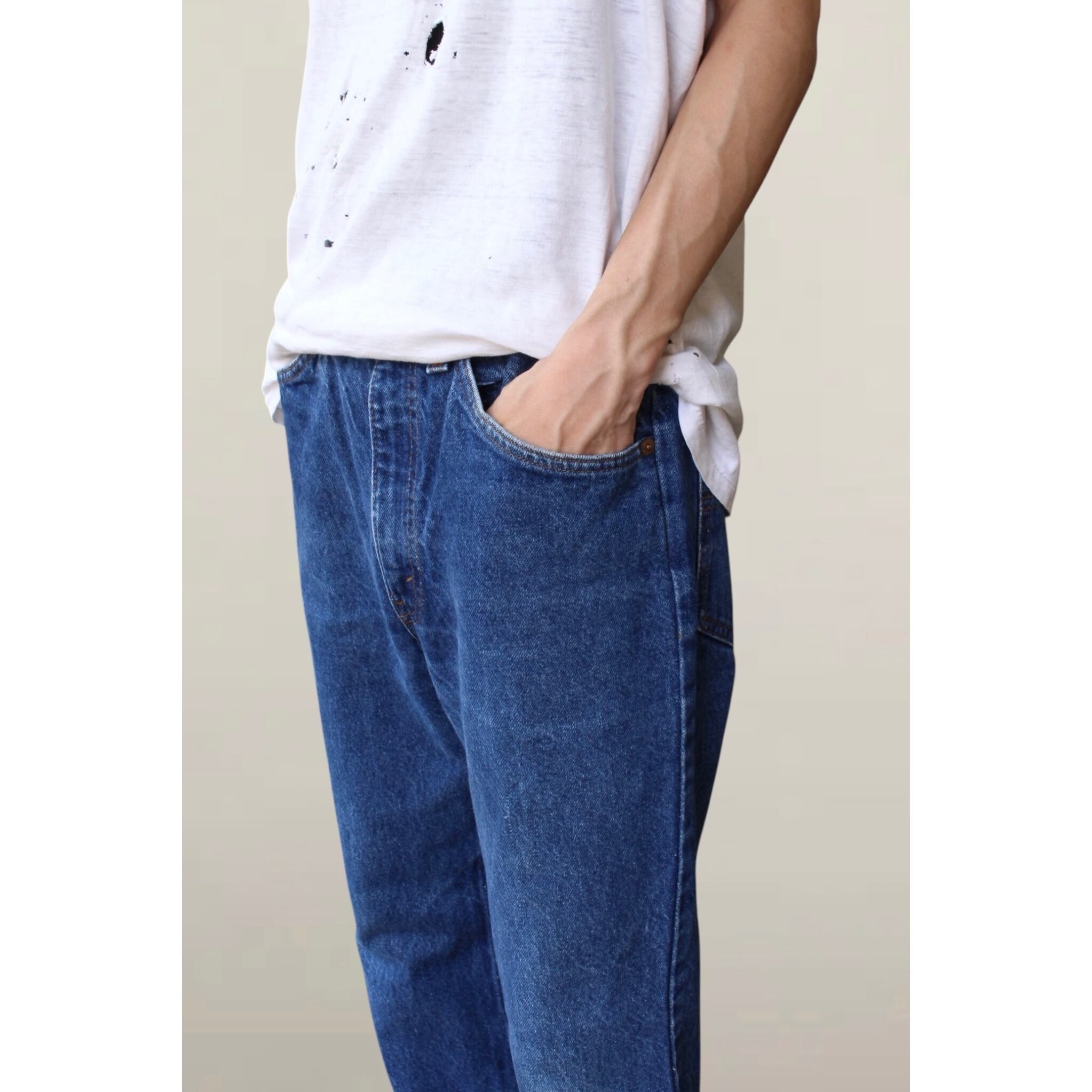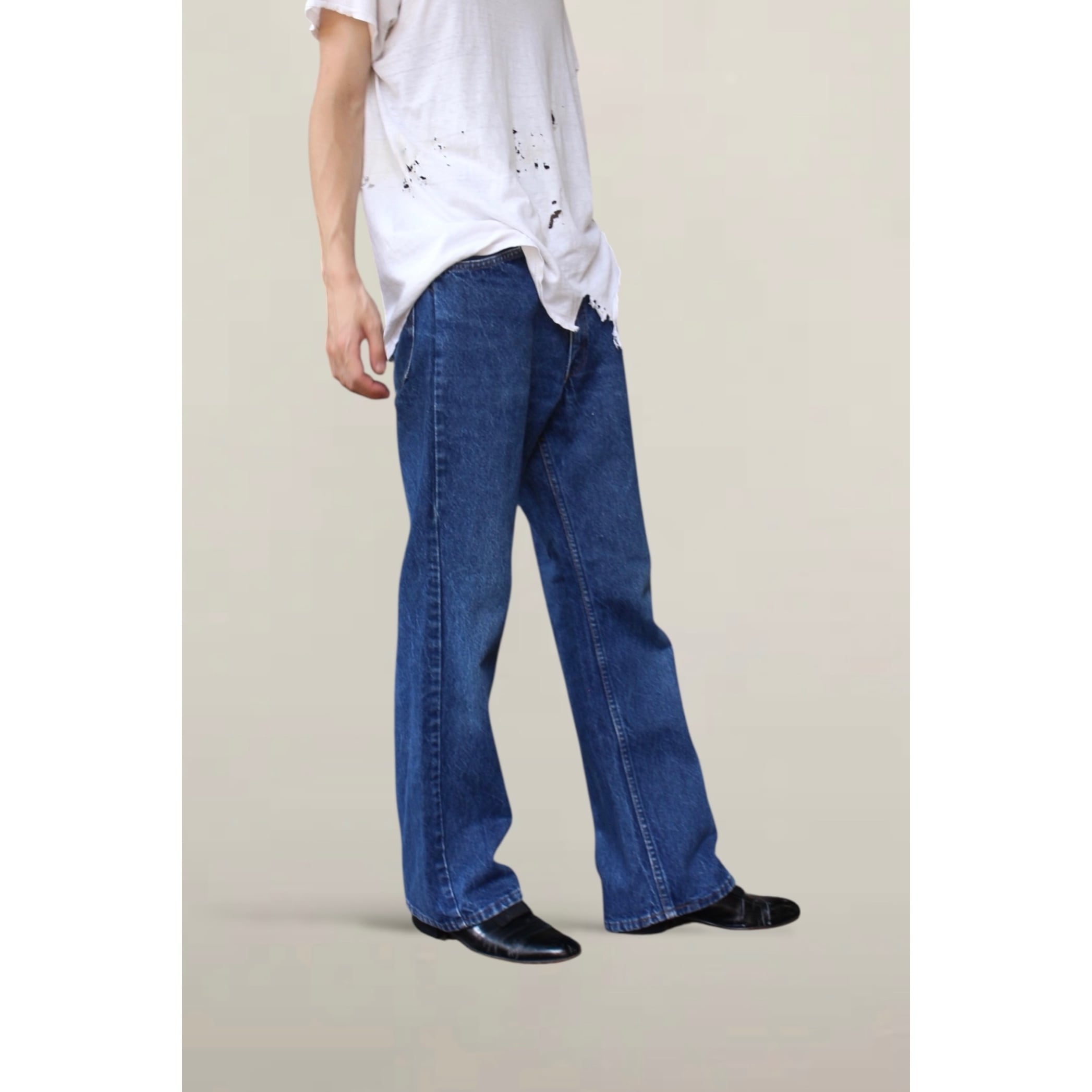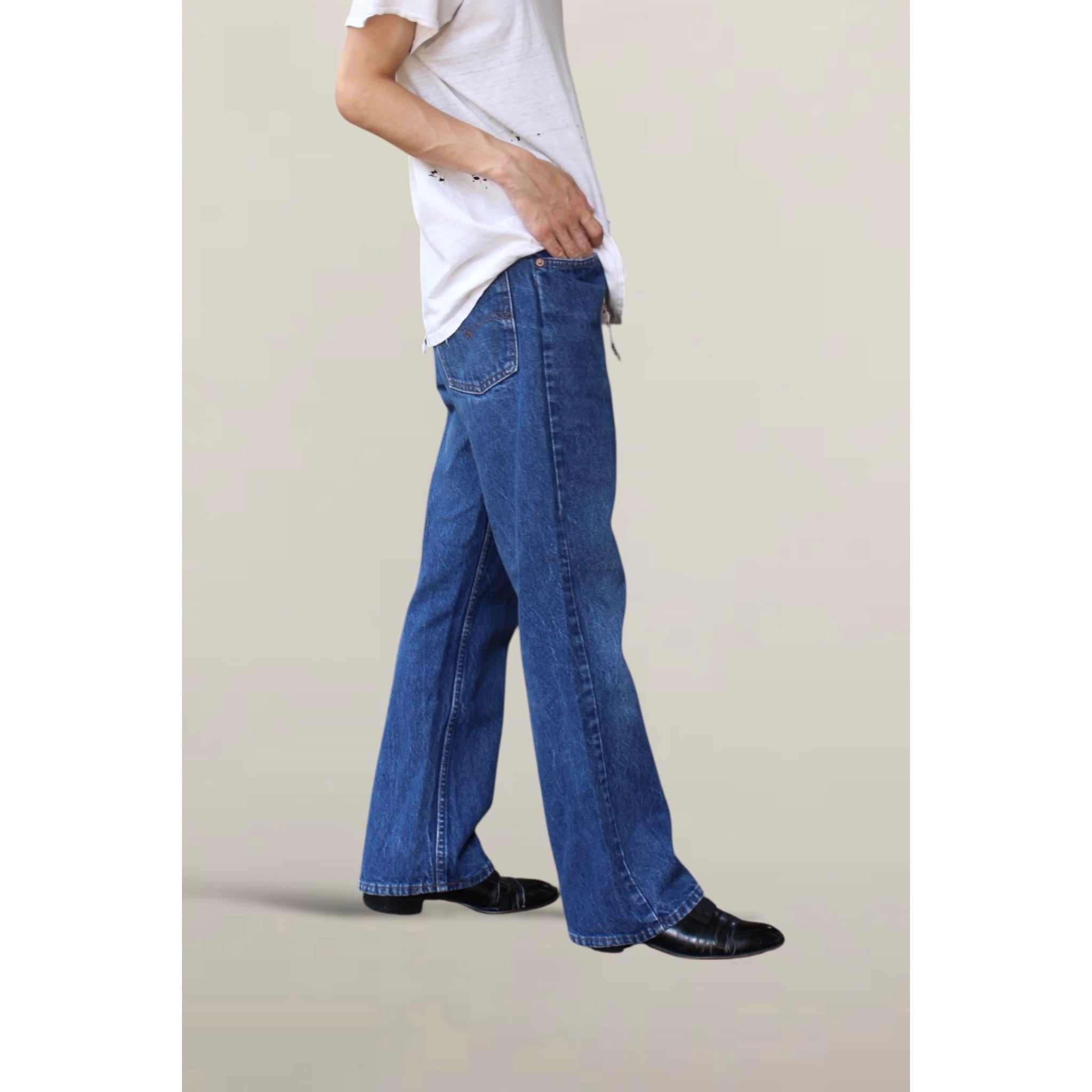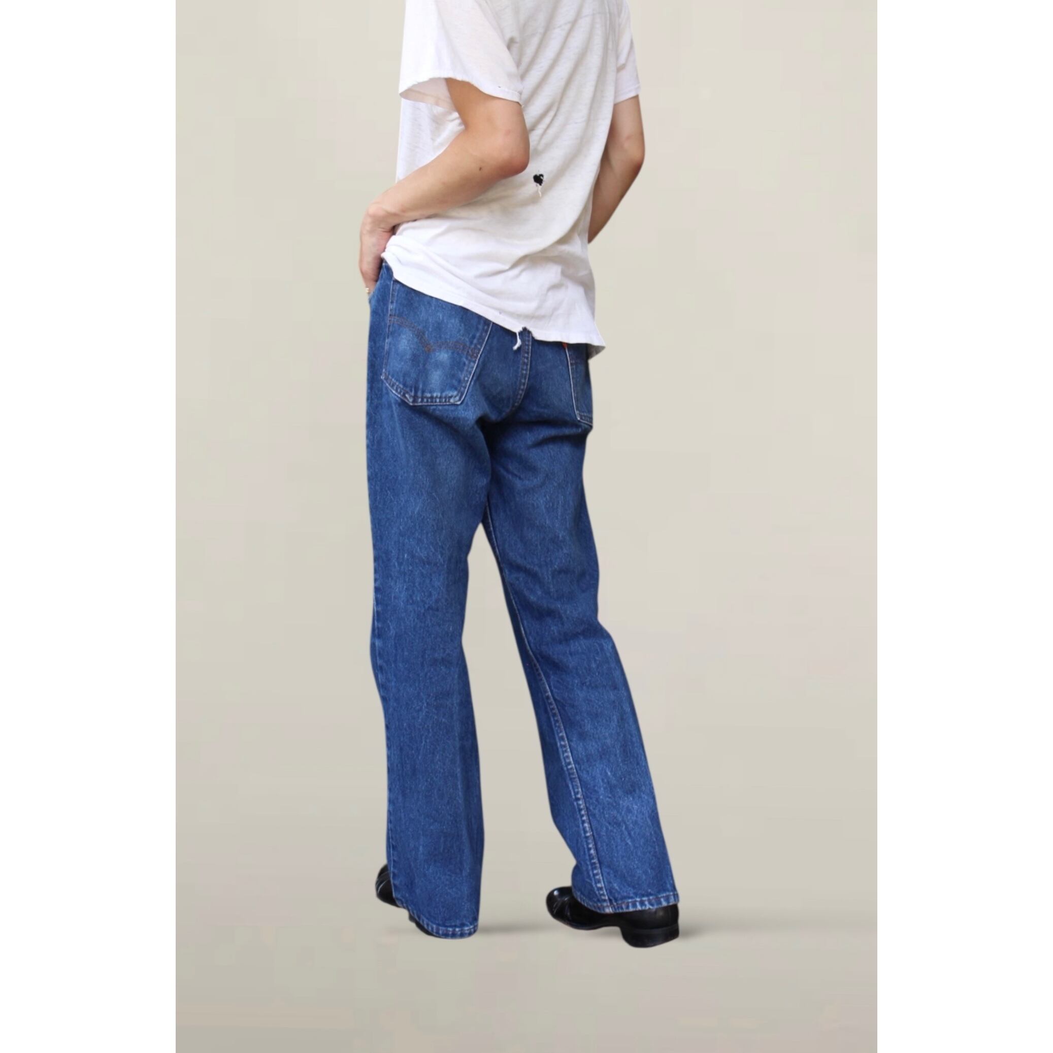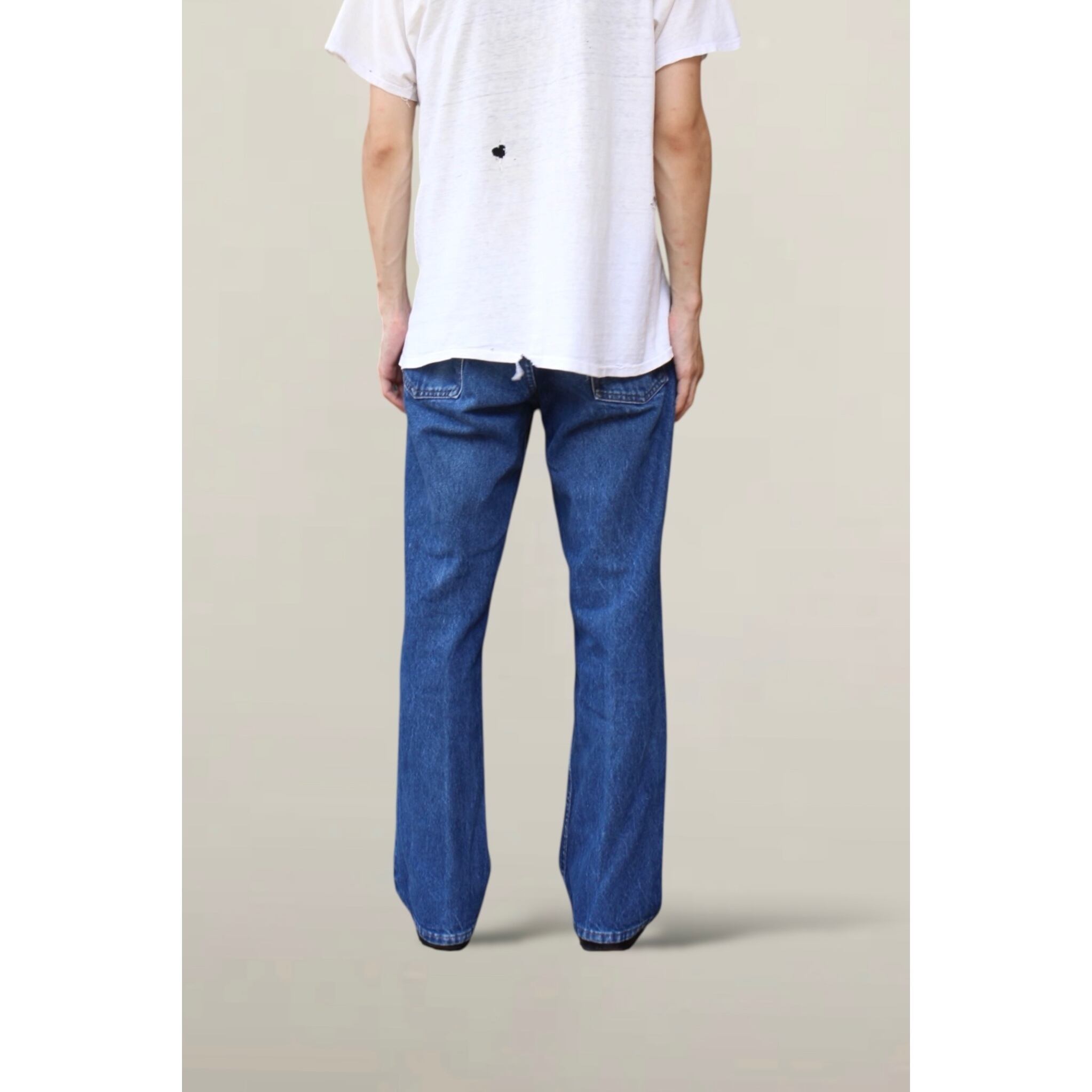 年代は80年頃。裾上げされフレア幅が無くなっている個体も多く見かけますがこちらは自然なフレア感がありストレートにも見えるいいシルエット。