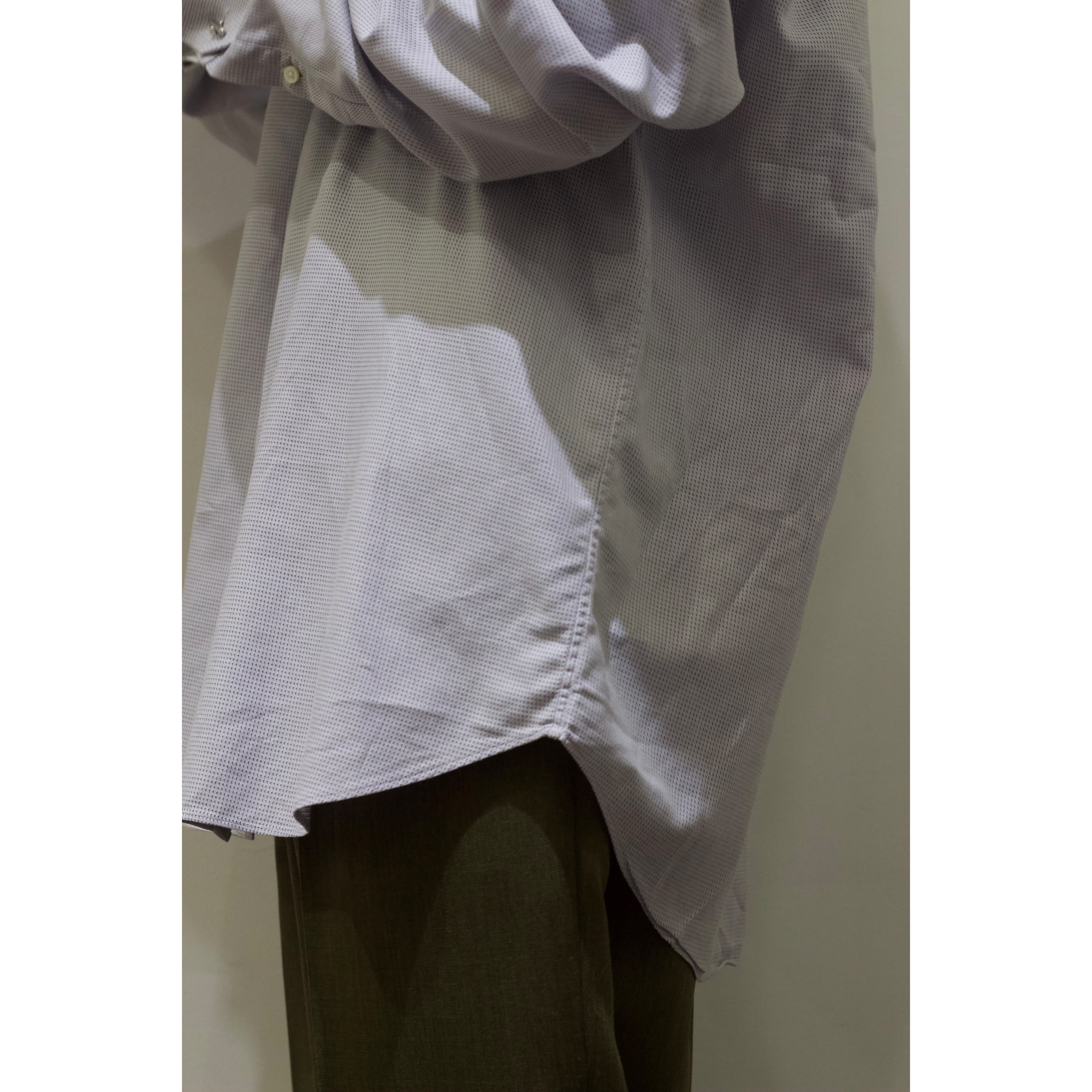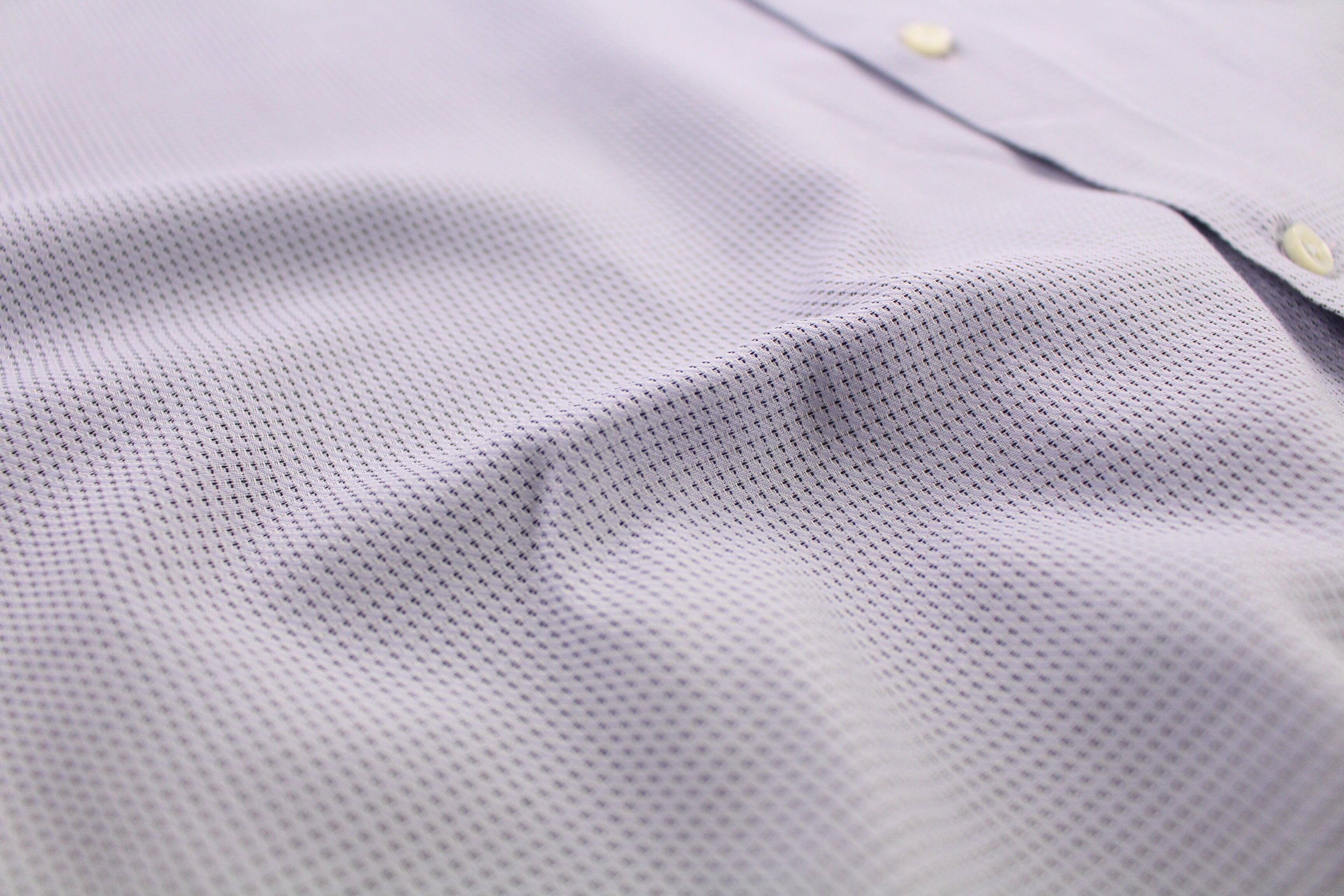 色味はホワイトに近い薄いブルー地で、そこに黒糸が覗くドットデザインの織り柄シャツ。