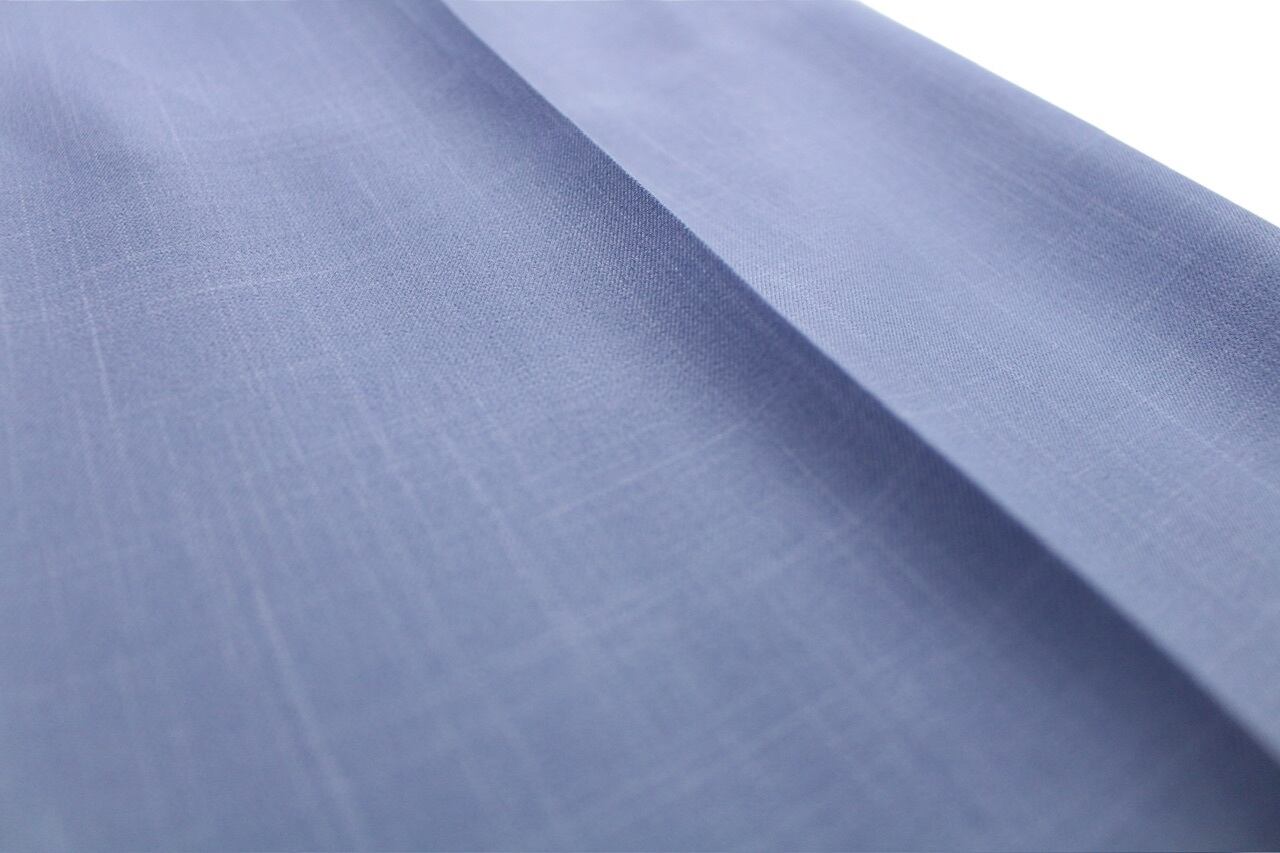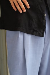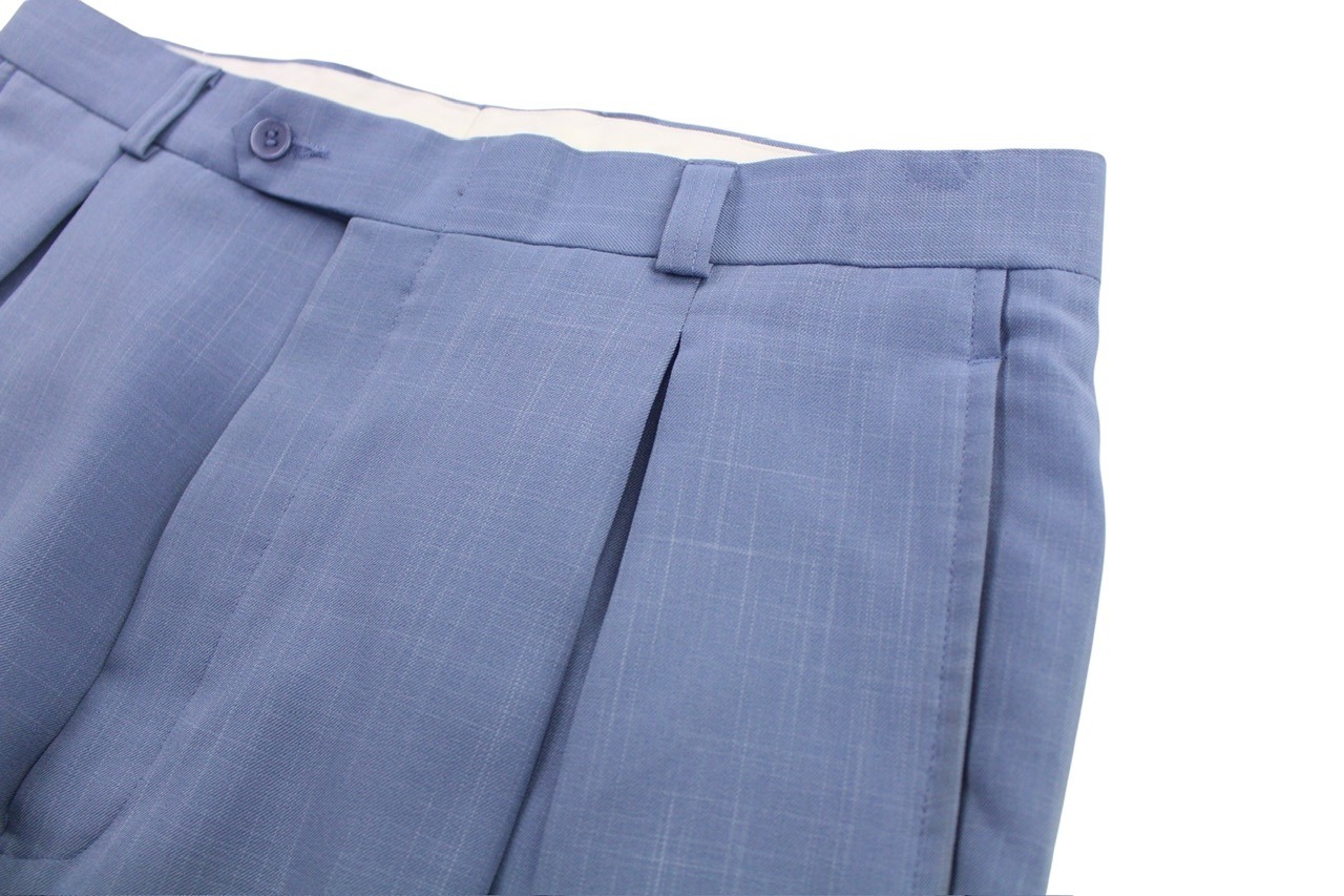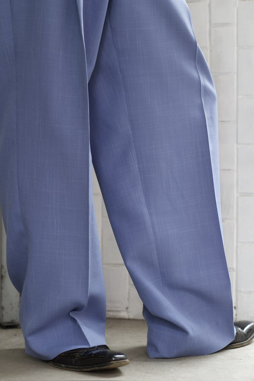 上品なブルーカラーに、腰回りに綺麗に入ったタック等、高級感のある一本となります☺︎