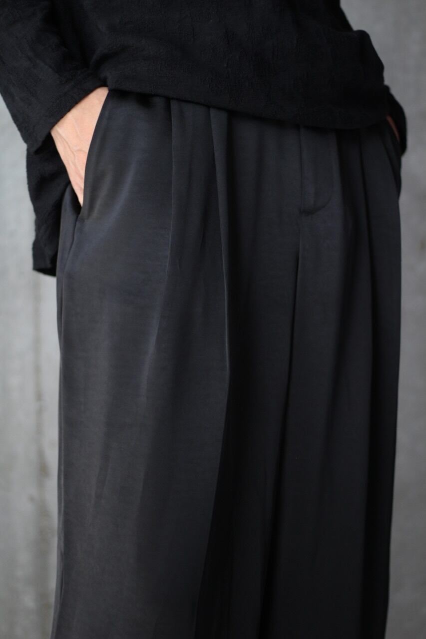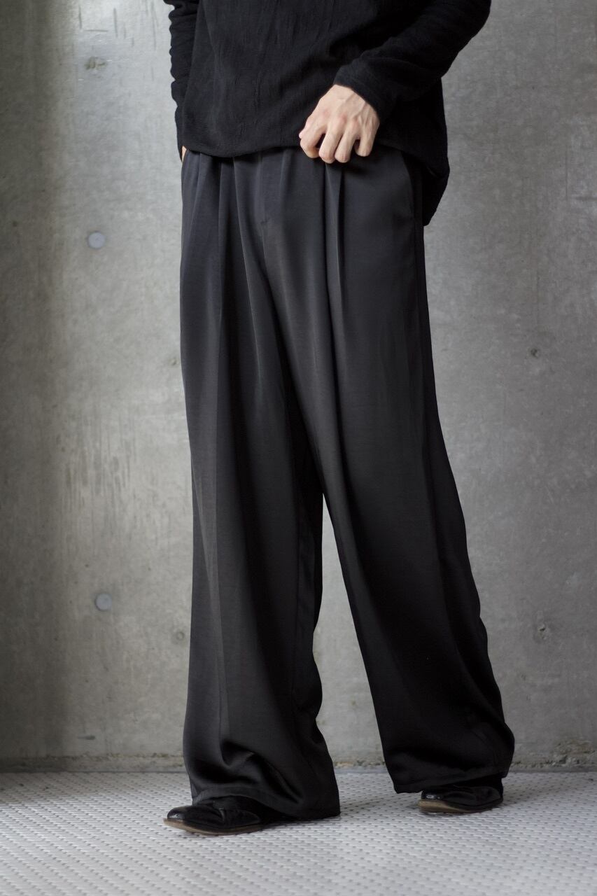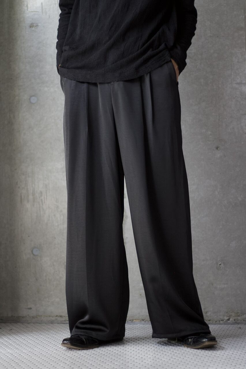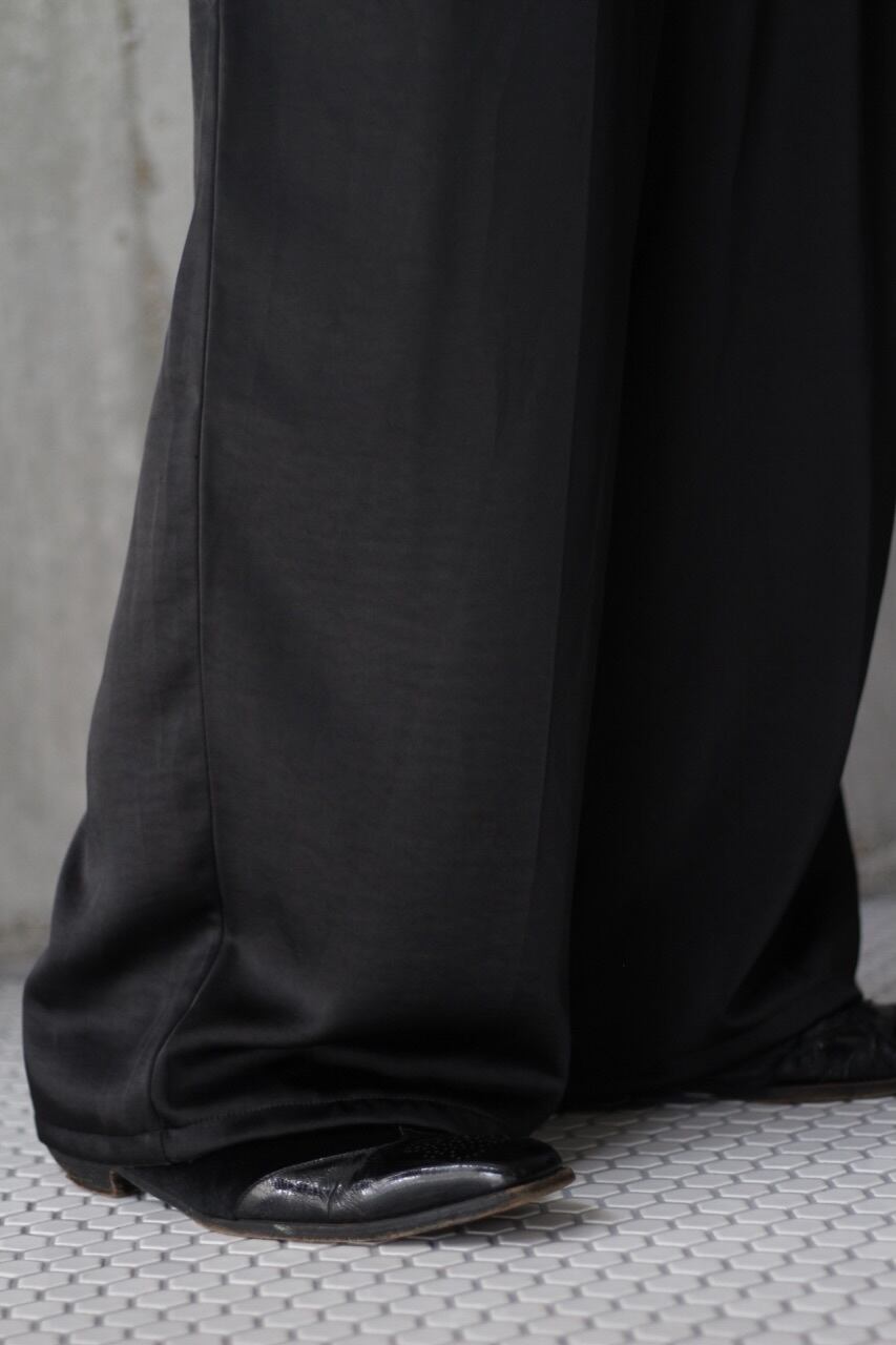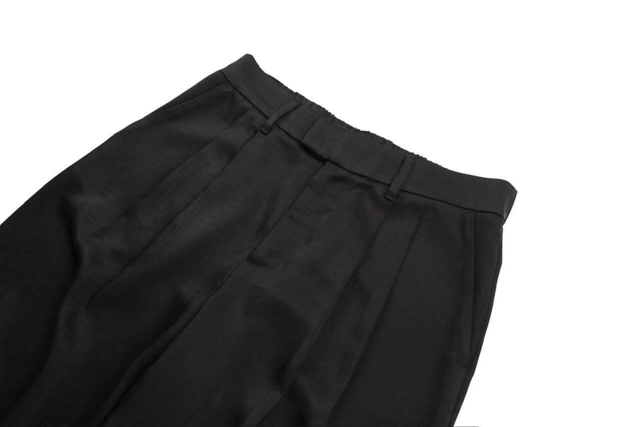 ウエストのバックにはゴムが付きながら、ベルトループも付属するイージーパンツの様なスラックス。