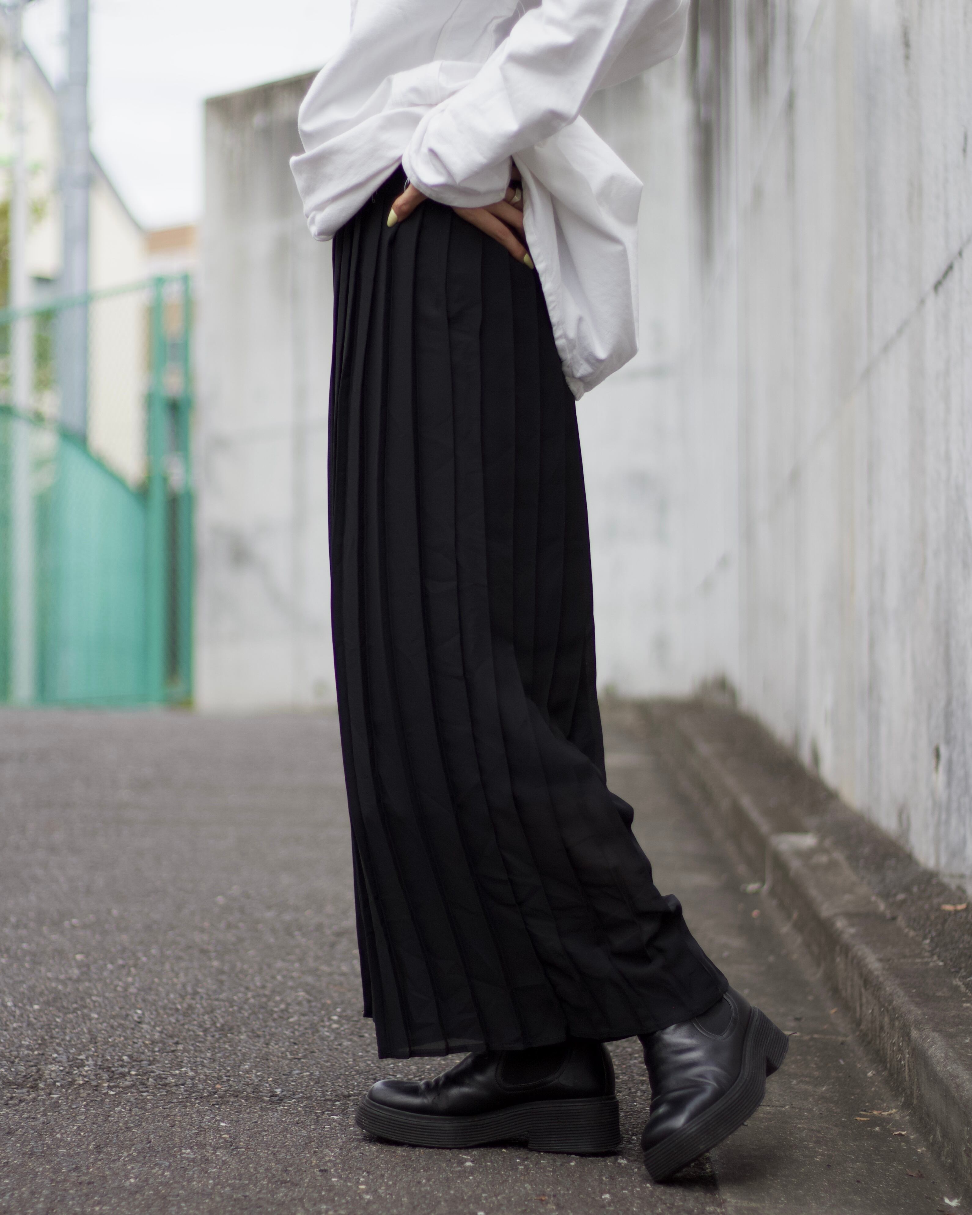 靴も厚底のスニーカーからヒールブーツ。レザーシューズまで本当に幅広く合わせられます。
