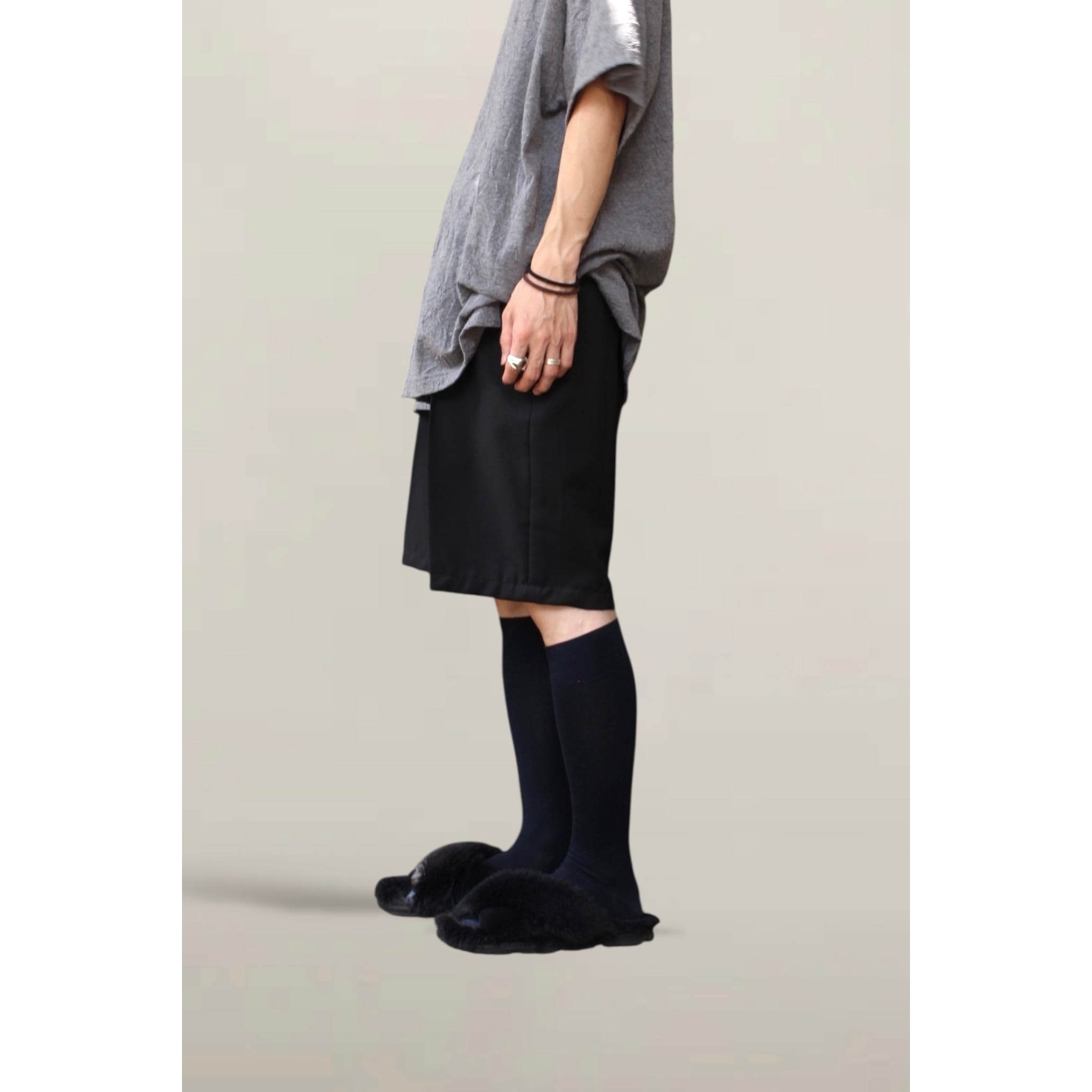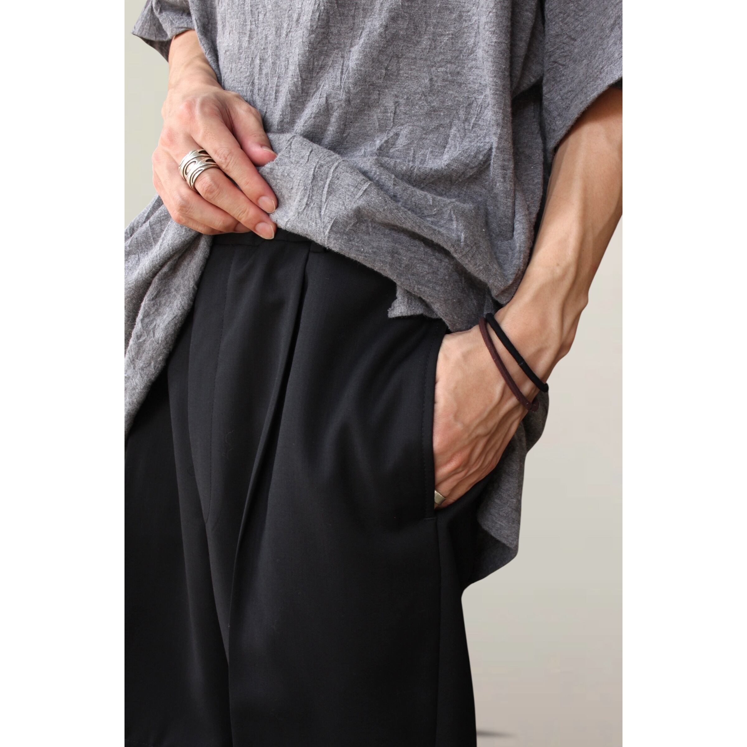 ファブリックも滑らかなウール生地。とても上品な風合いで高級感が増すアイテム。今の時期から秋口も含めて半袖、長袖と様々なトップスに合わせて楽しめる逸品☺︎