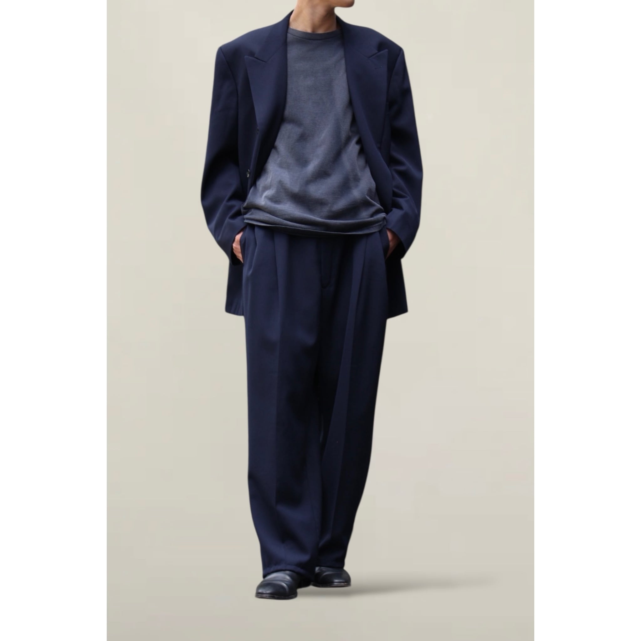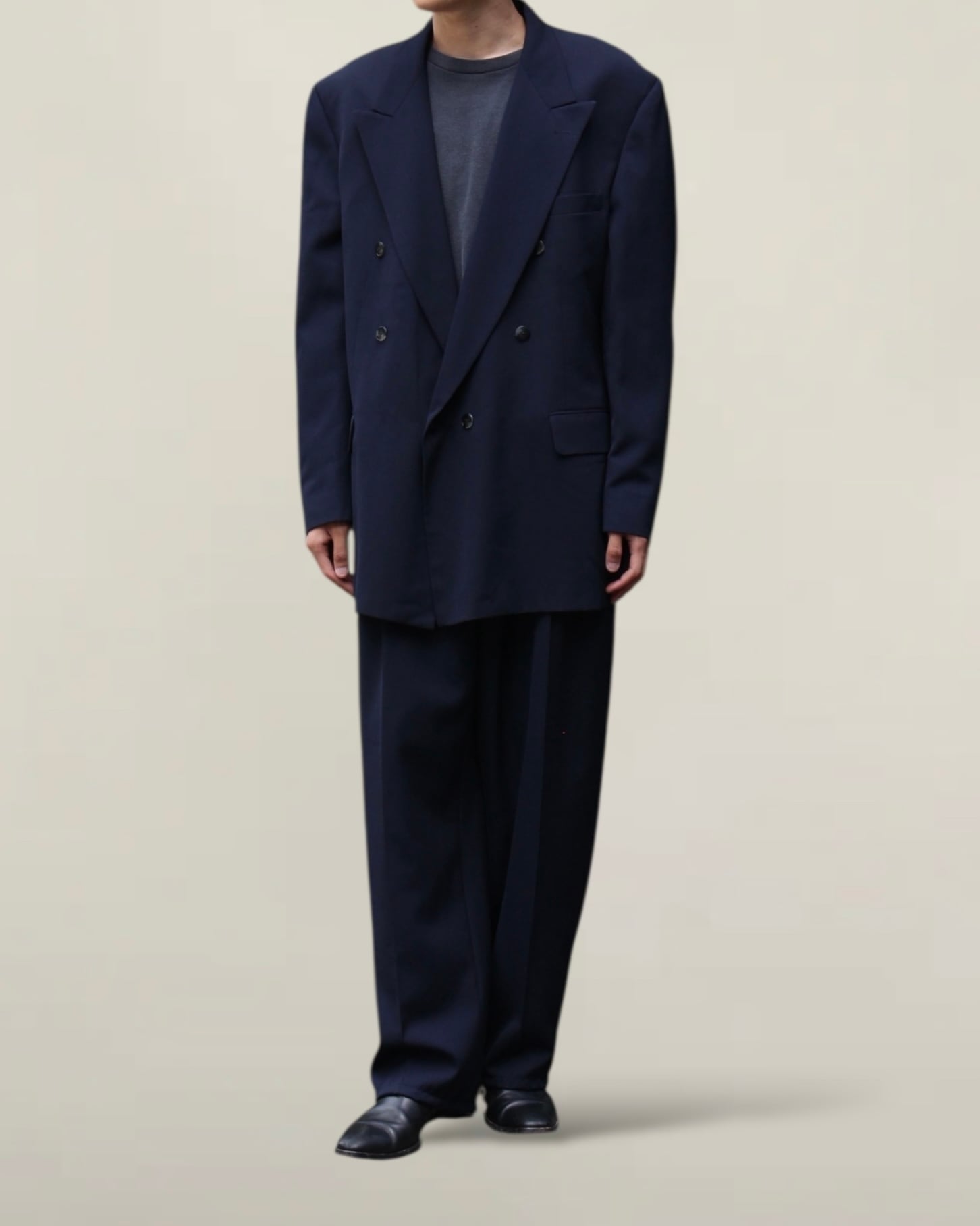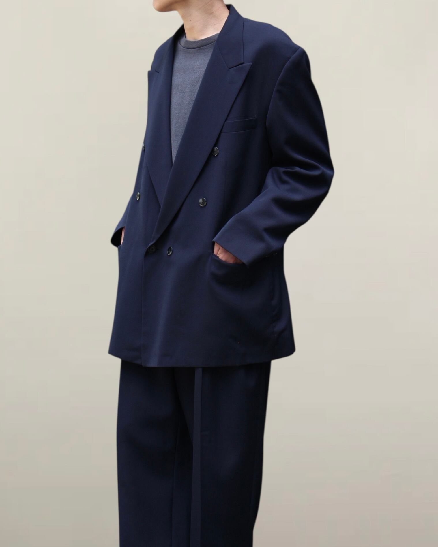 ジャケットはフォーマルになり過ぎないゆとりのあるサイズ感に、ピークドラペルのダブルブレスト仕様。