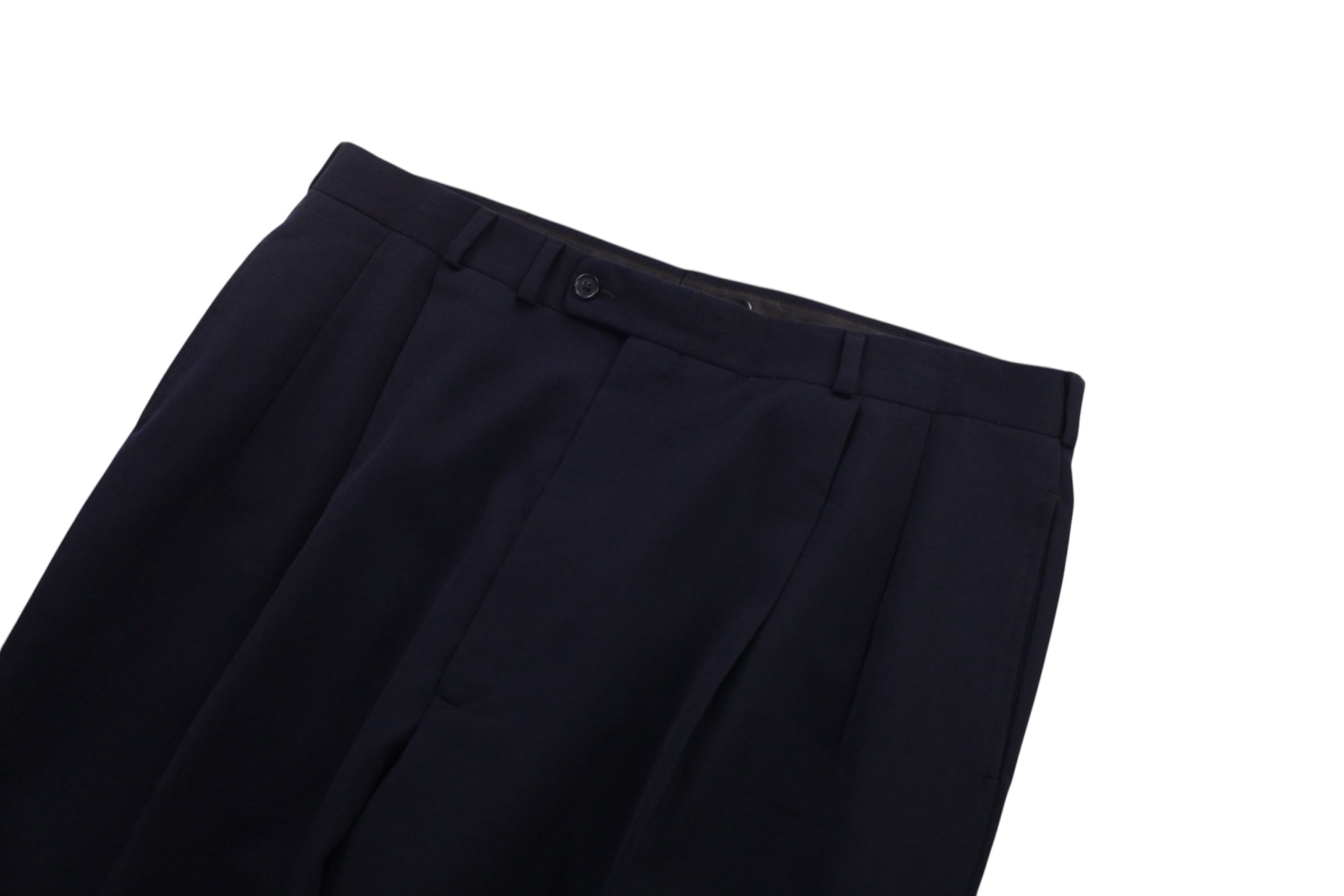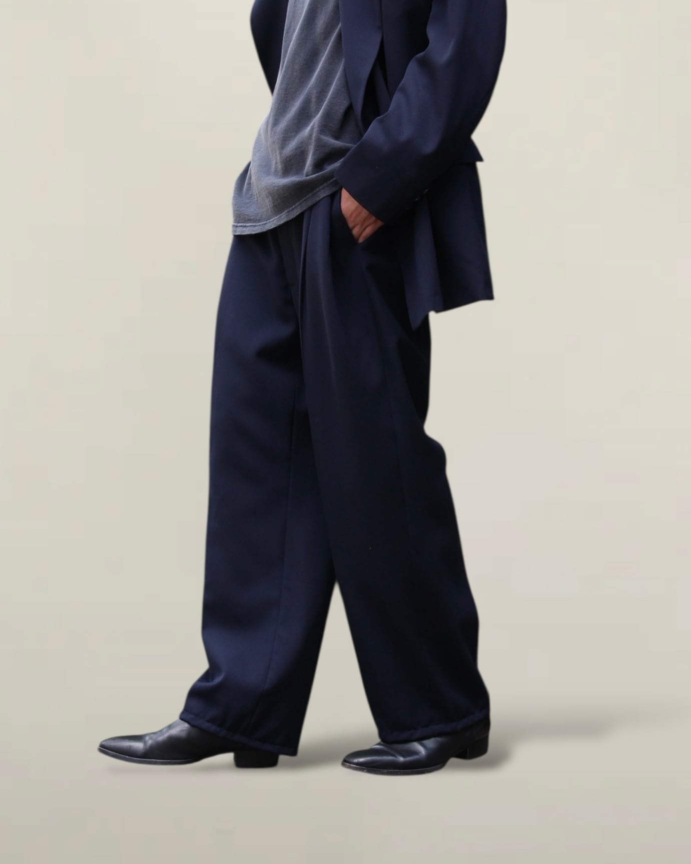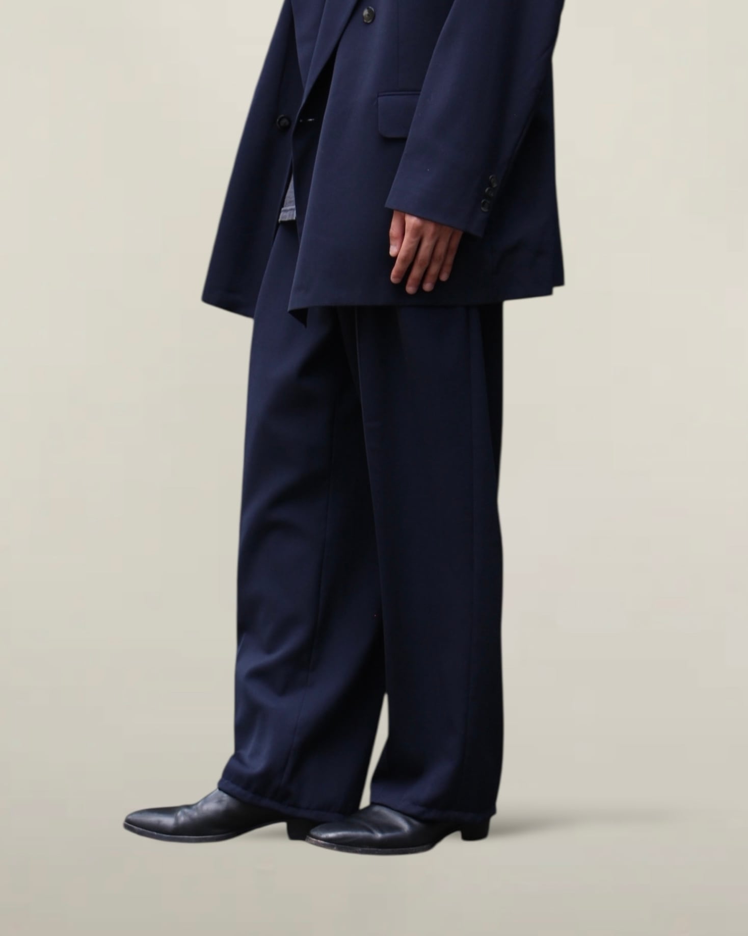 ジャケットはフォーマルになり過ぎないゆとりのあるサイズ感に、ピークドラペルのダブルブレスト仕様。